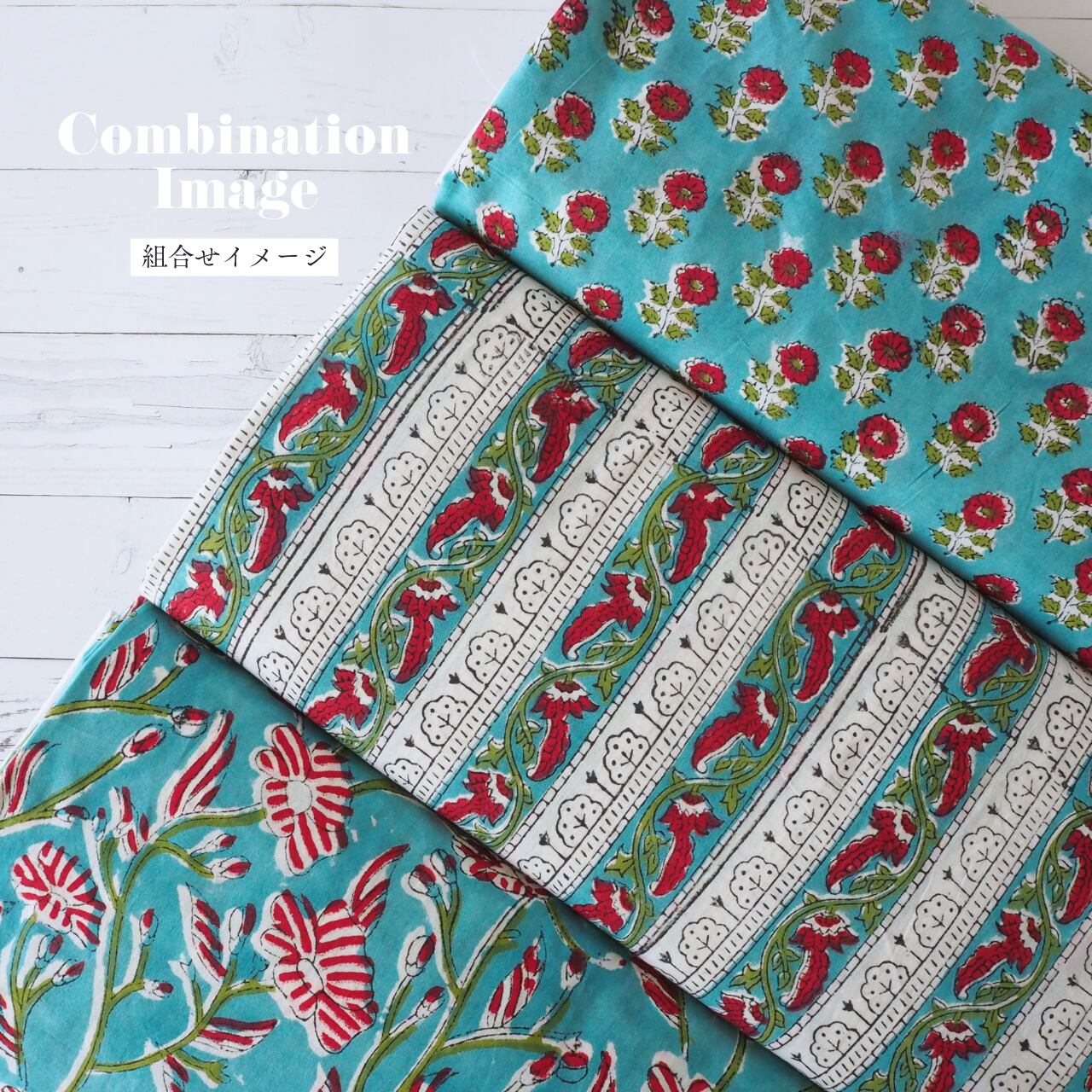 ブロックプリント生地【50cm単位】インド綿 花柄 青緑×赤 #17328-GR2