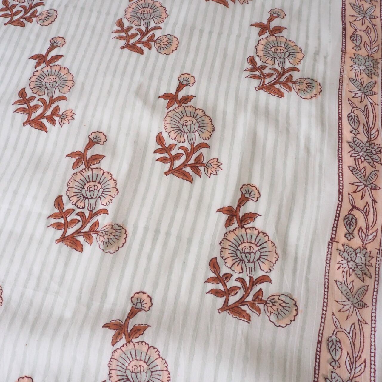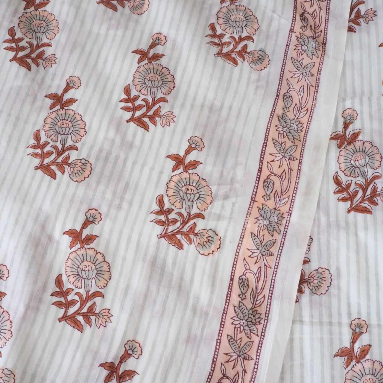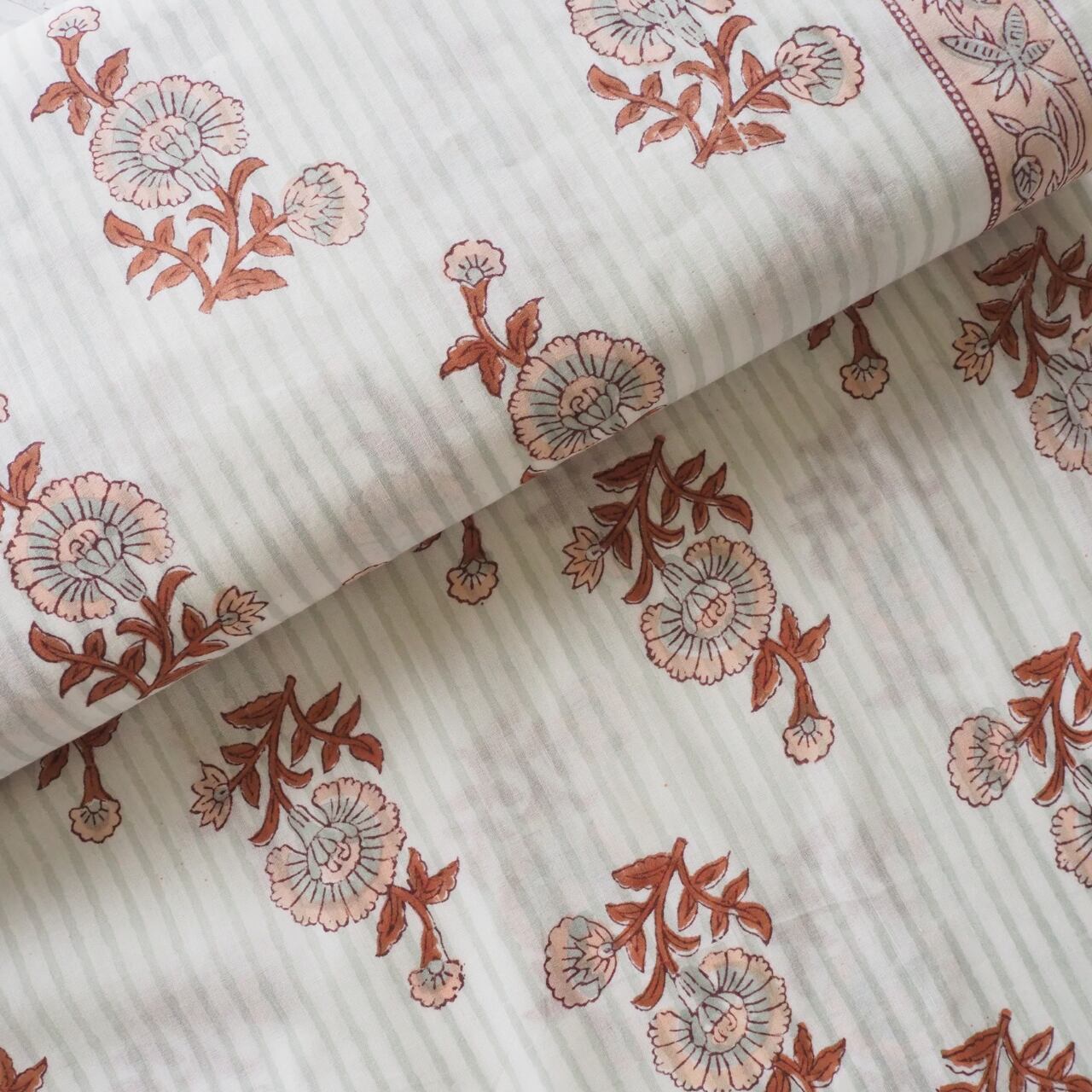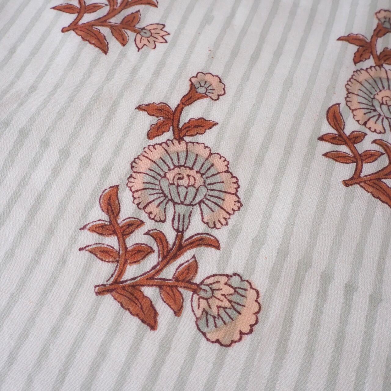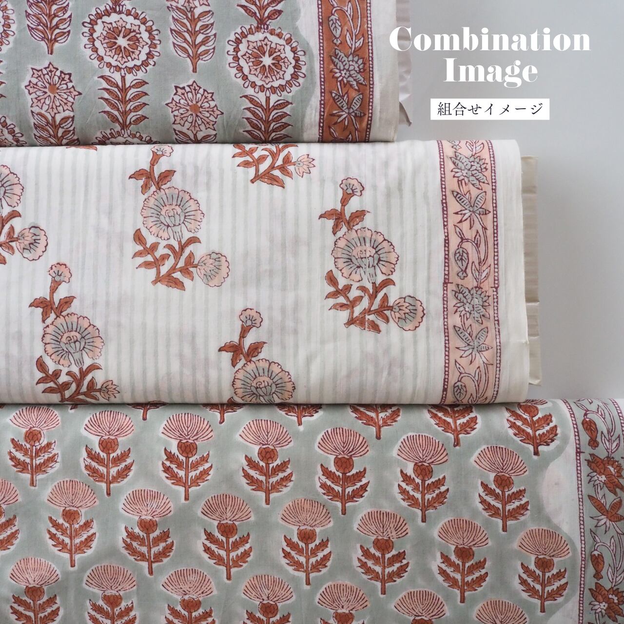 ブロックプリント生地【50cm単位】インド綿 片耳ボーダー付き ストライプ花柄 白×くすみブルーグレー×茶色 #17930-GY3