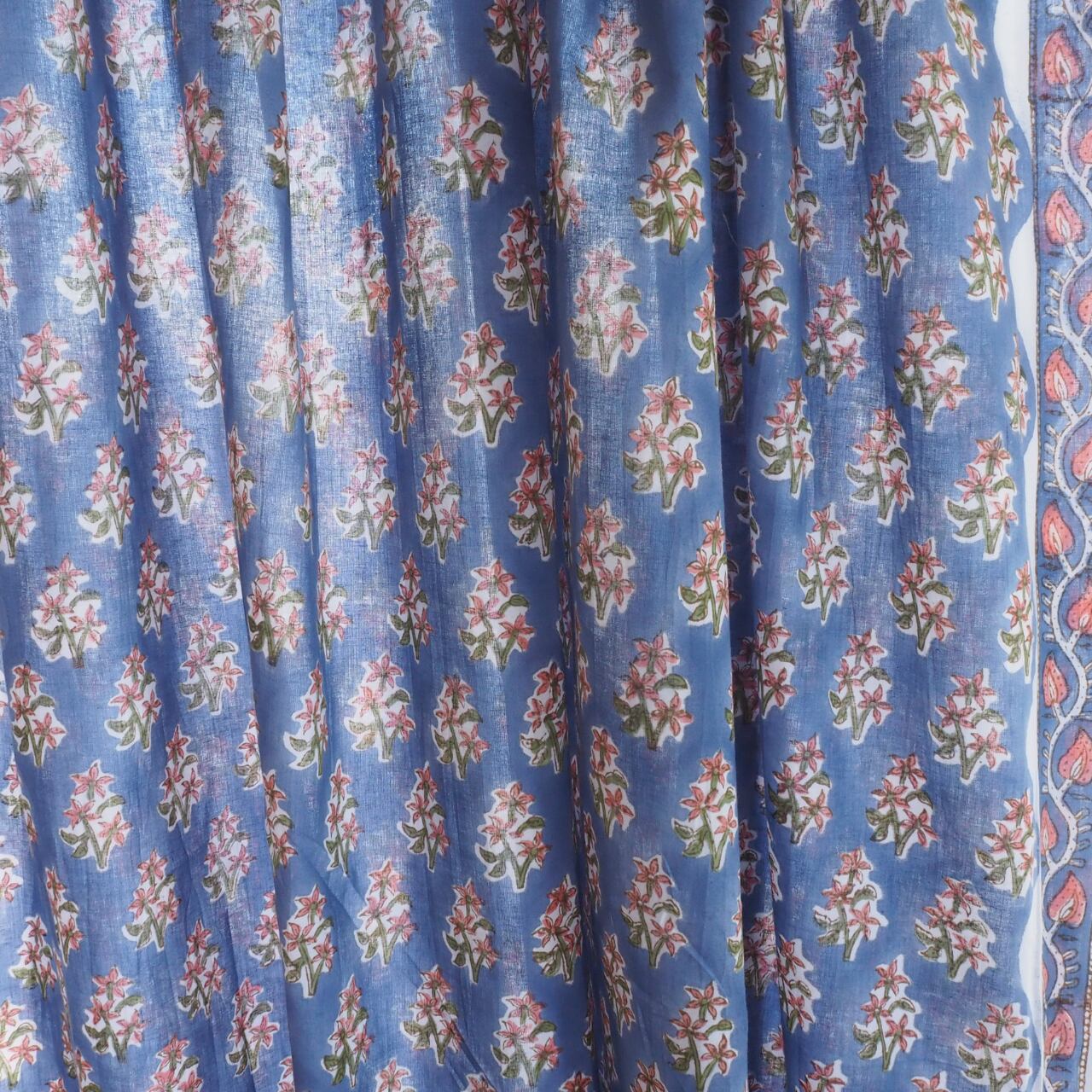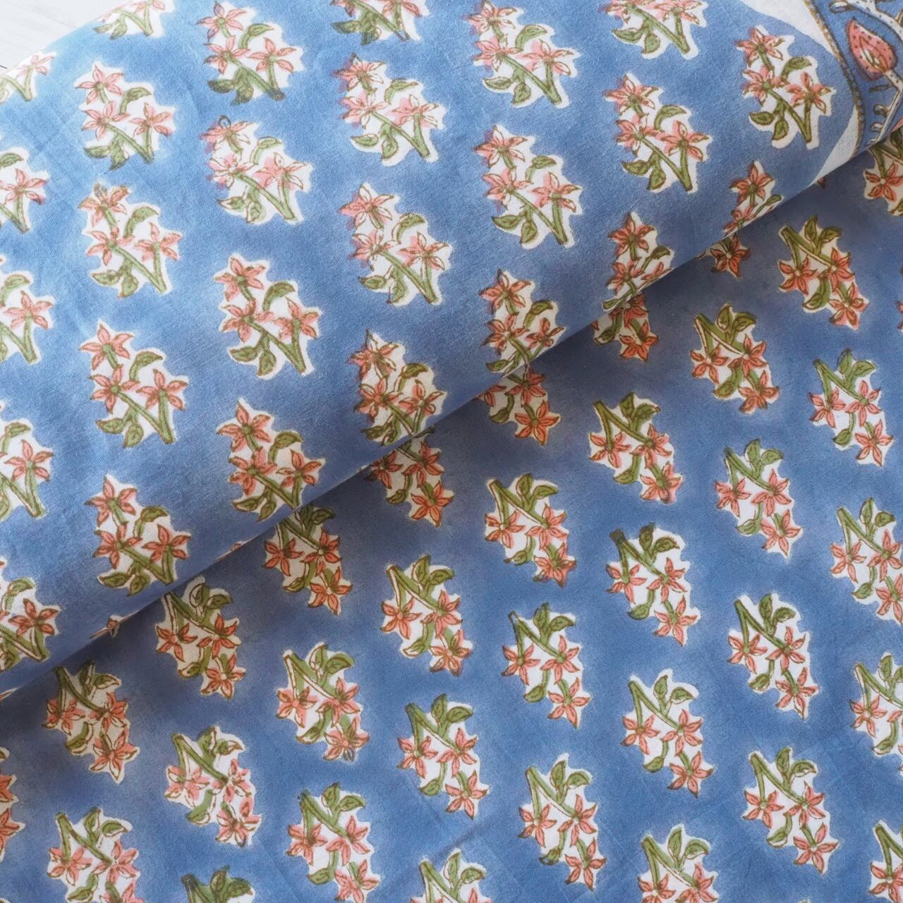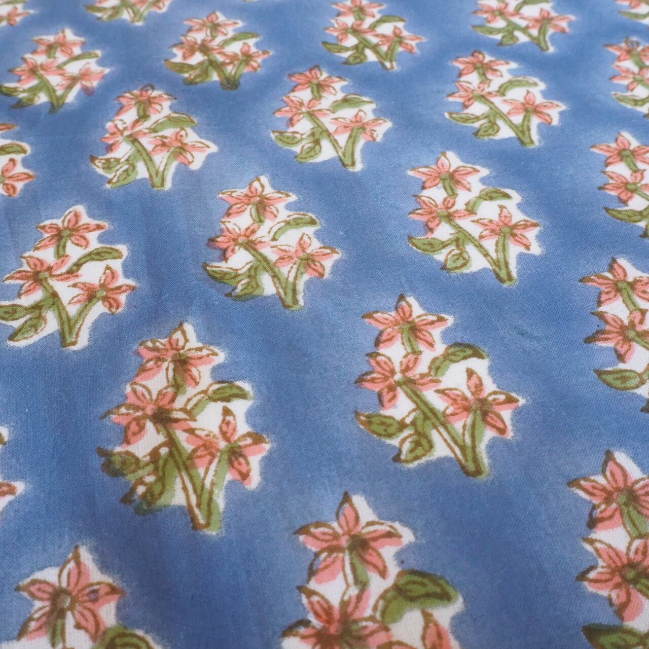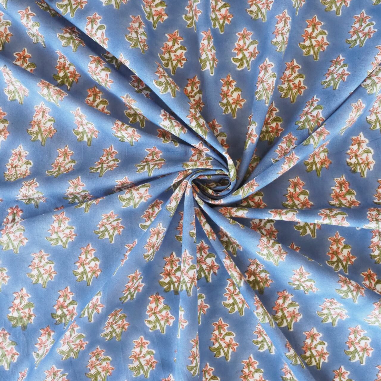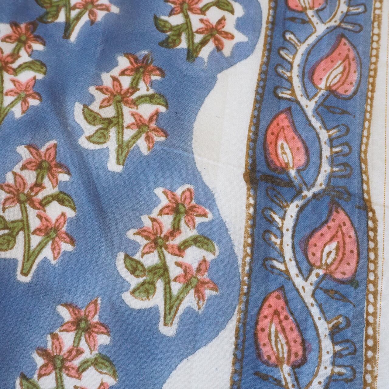 ブロックプリント生地【50cm単位】インド綿 片耳ボーダー付き 花柄A 青×オレンジ #18031-BL1
