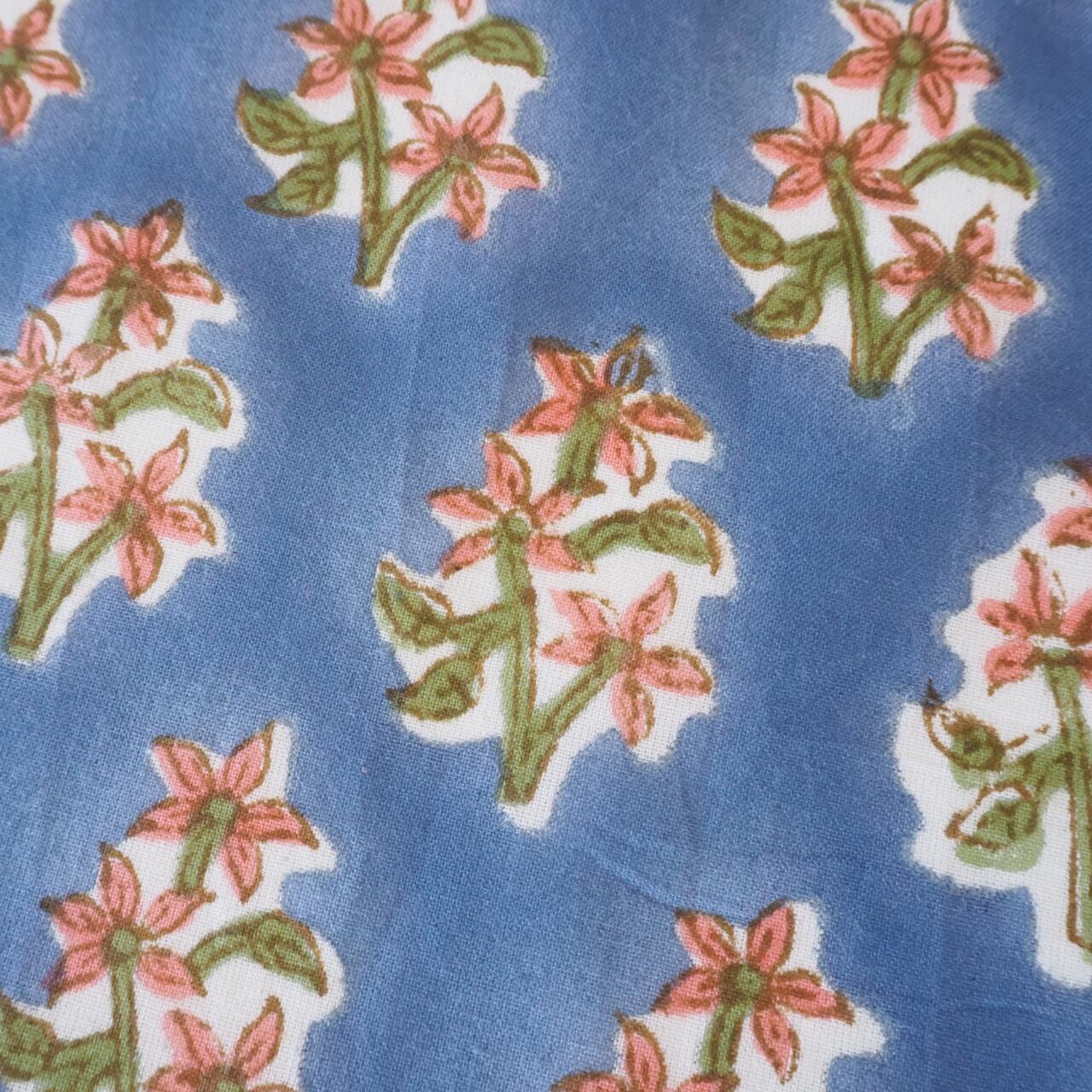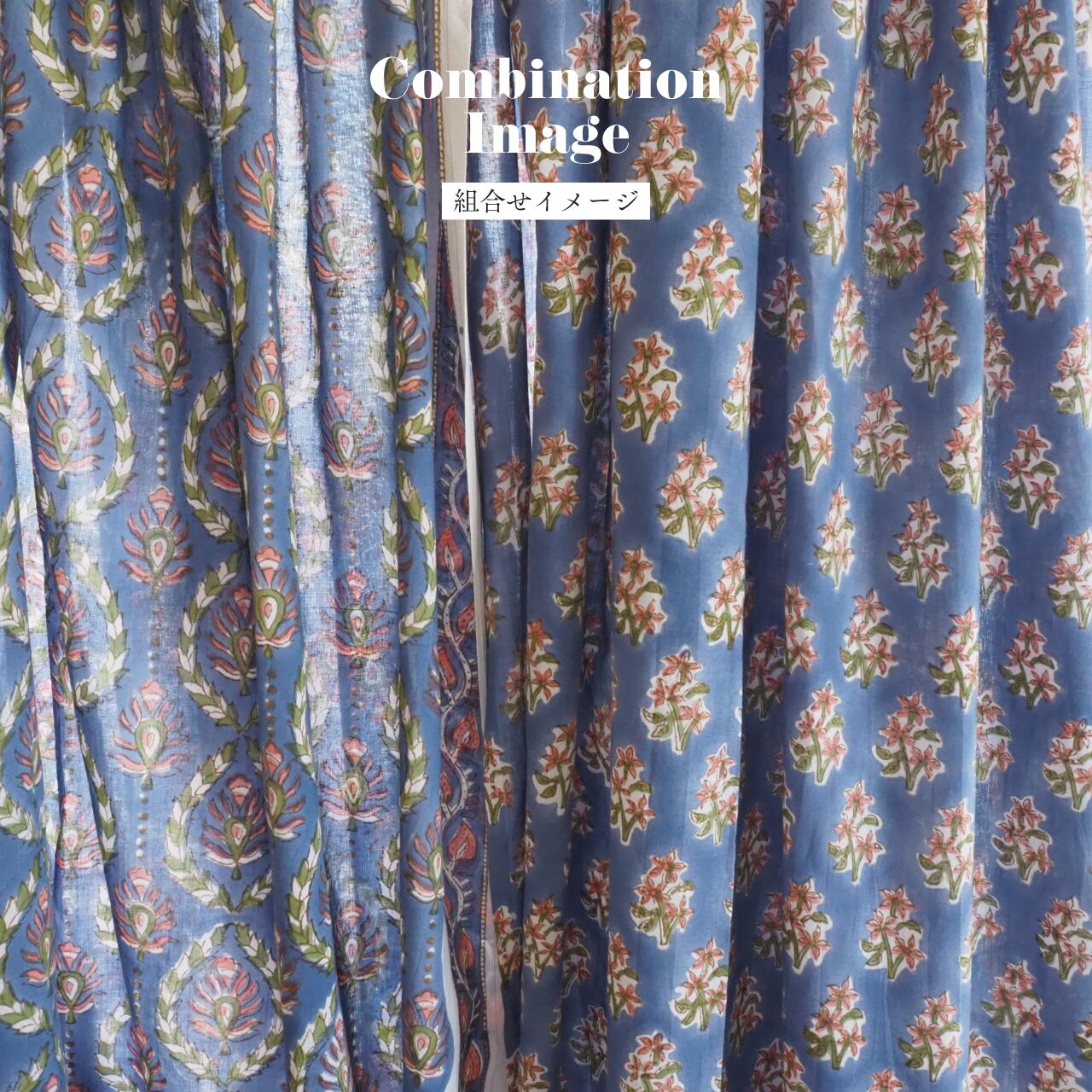 ハンドブロックプリントと呼ばれるインドのジャイプール地方に古くから伝わる伝統的な技法で、木彫りのスタンプで色を何度も重ね、全ての工程がインドの職人さんの手作業によって仕上がるAll Handmadeの生地です。
