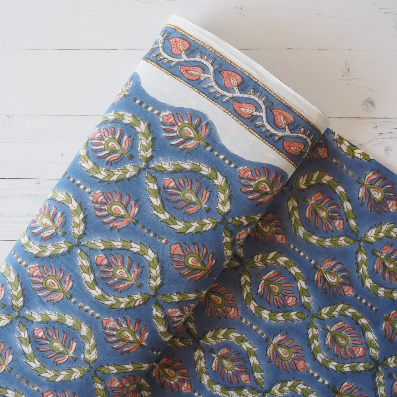 ブロックプリント生地【50cm単位】インド綿 片耳ボーダー付き 花柄B 青×オレンジ #18131-BL2