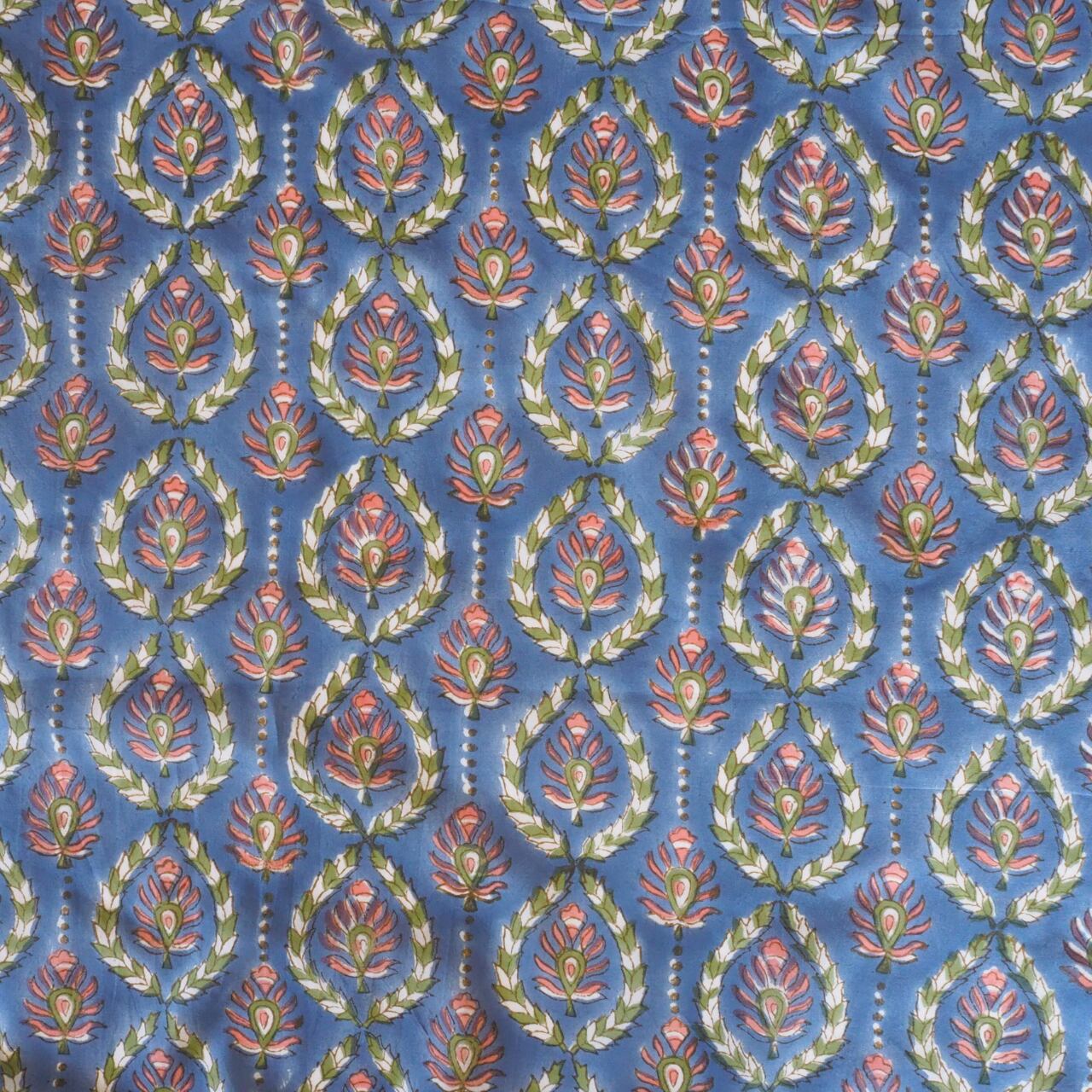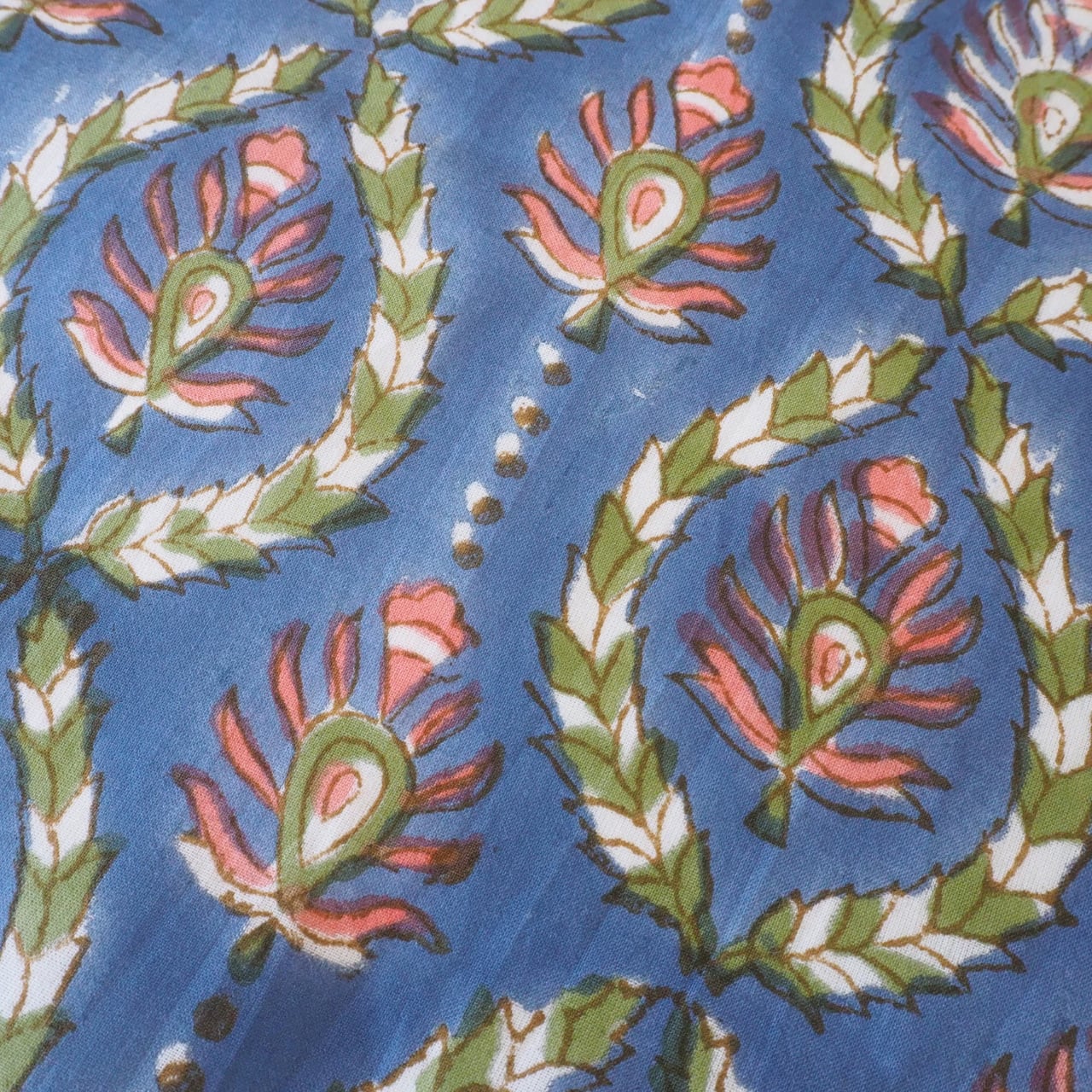 ハンドブロックプリントと呼ばれるインドのジャイプール地方に古くから伝わる伝統的な技法で、木彫りのスタンプで色を何度も重ね、全ての工程がインドの職人さんの手作業によって仕上がるAll Handmadeの生地です。