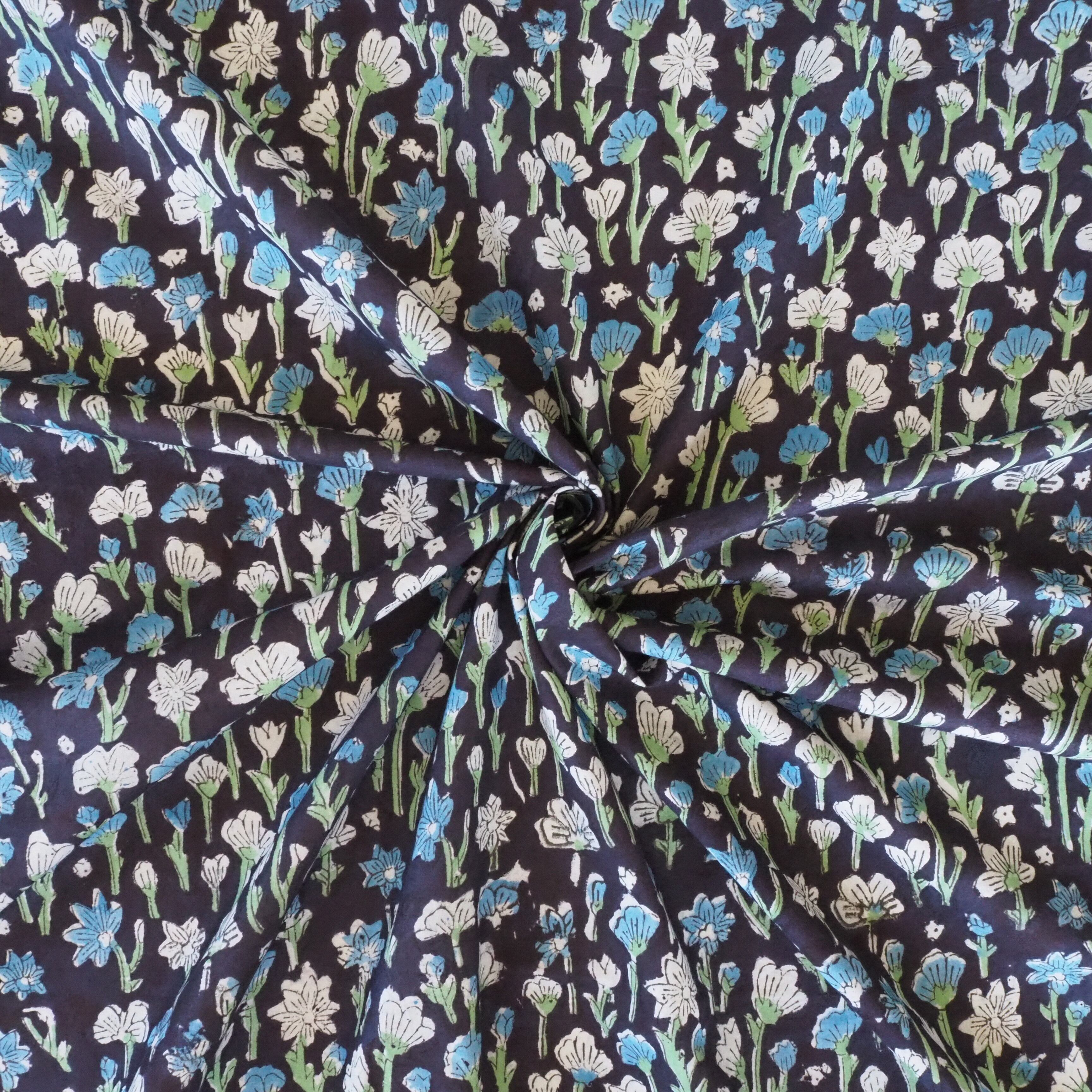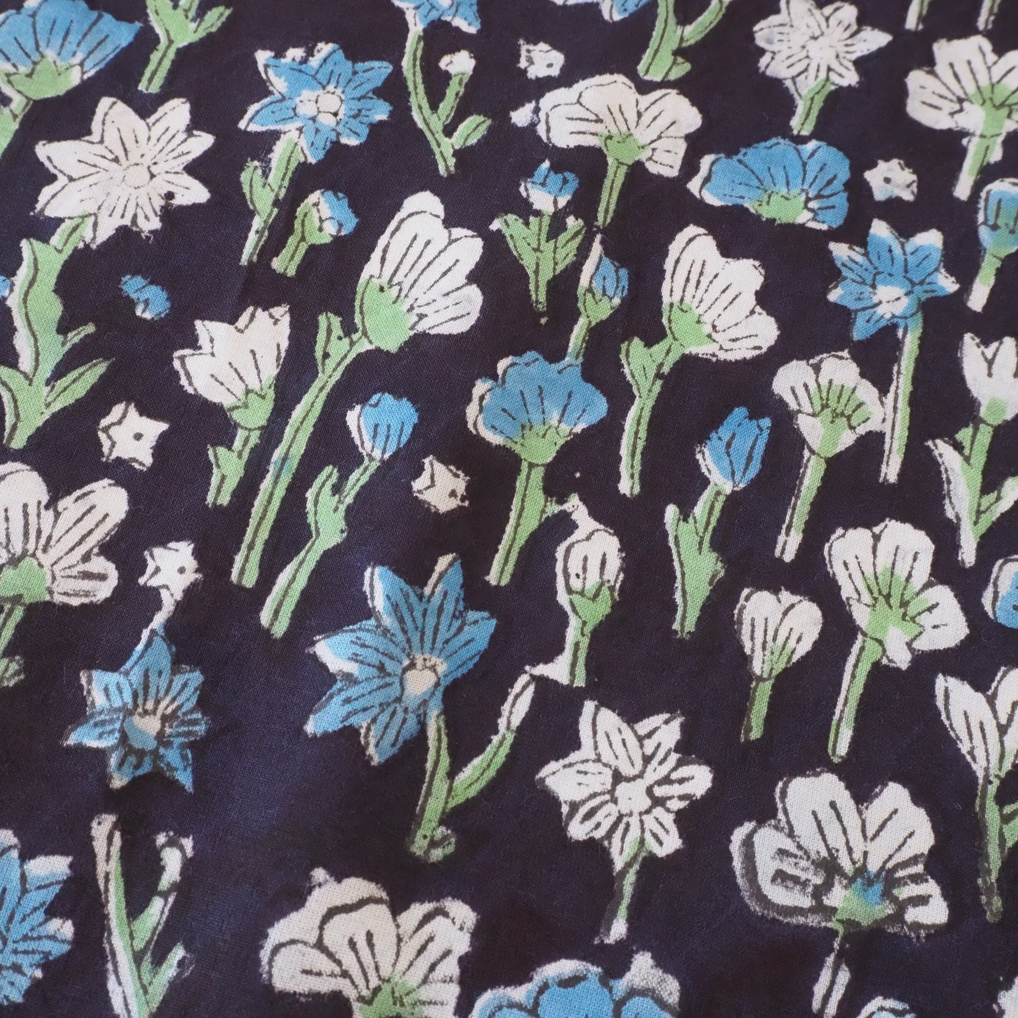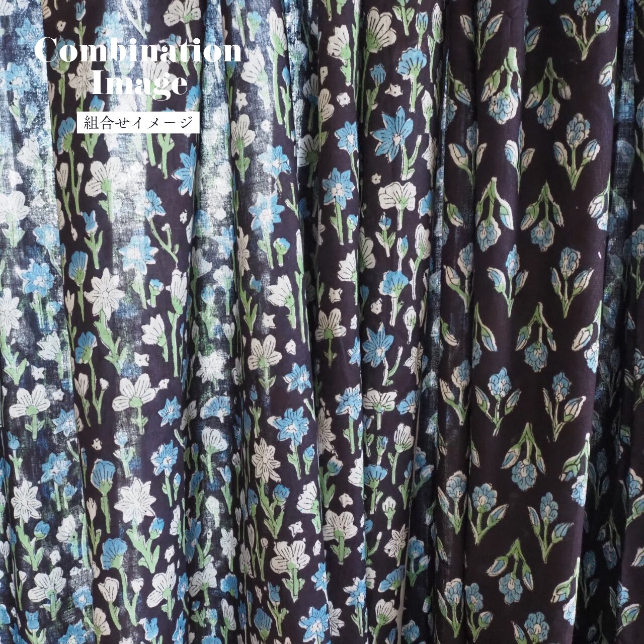 ブロックプリント生地【50cm単位】インド綿 小花柄B 黒×水色 #18332-BK2