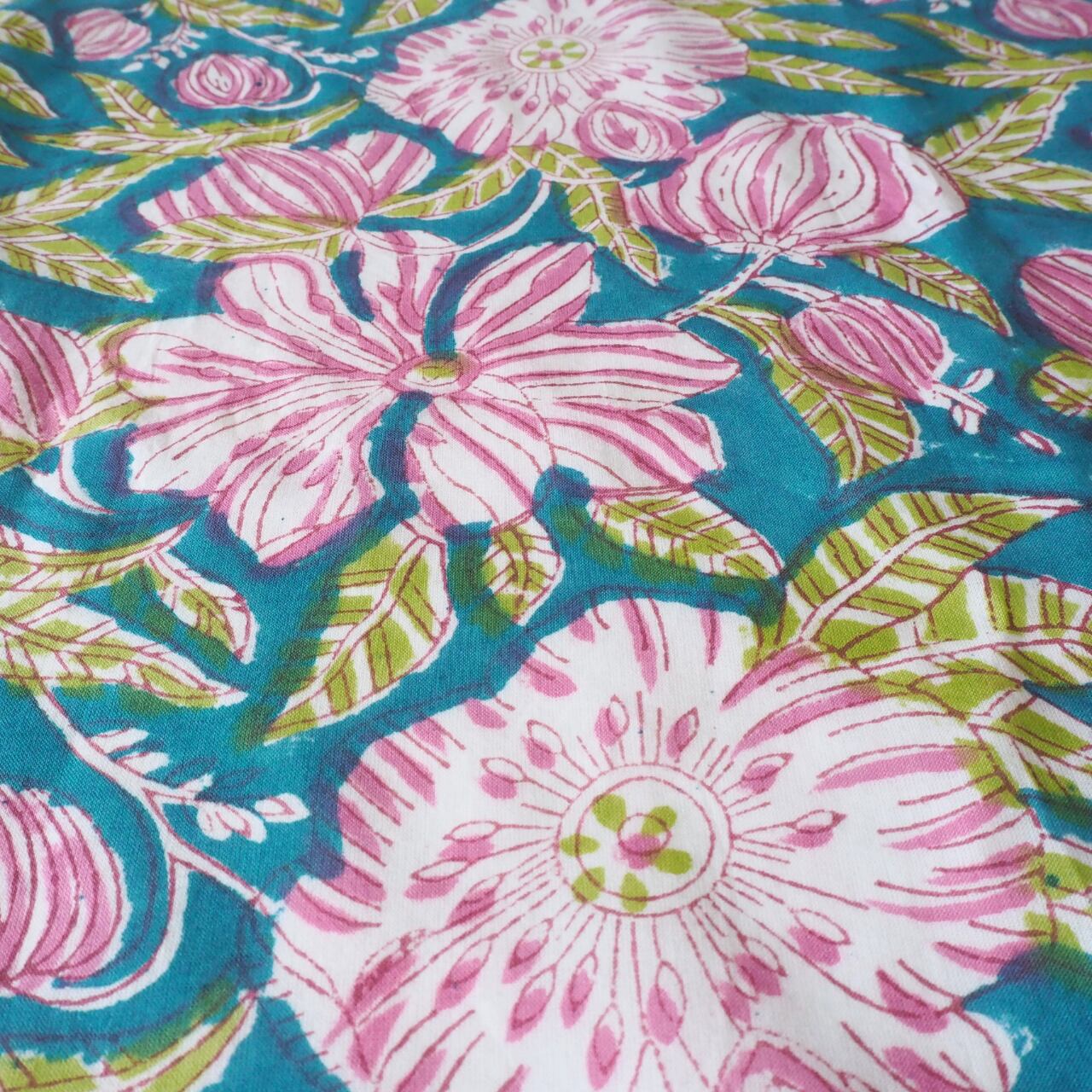 ブロックプリント生地【50cm単位】インド綿 花柄 マリンブルー×ピンク #19035-BL2