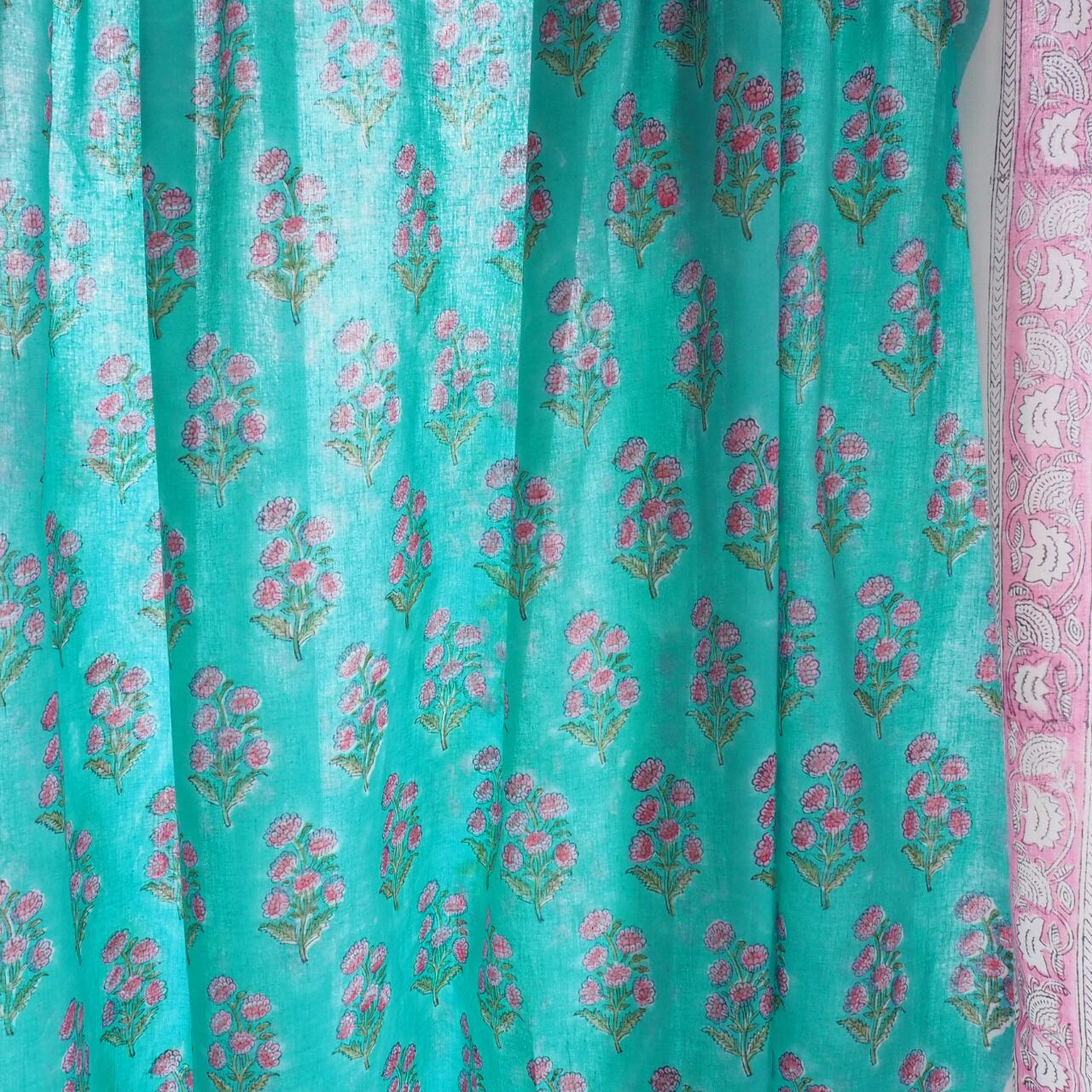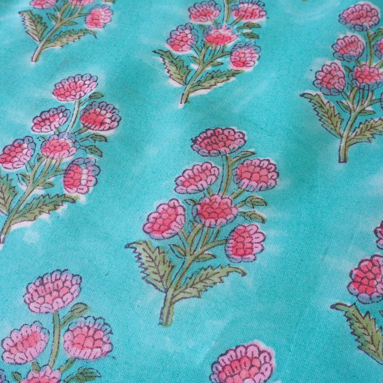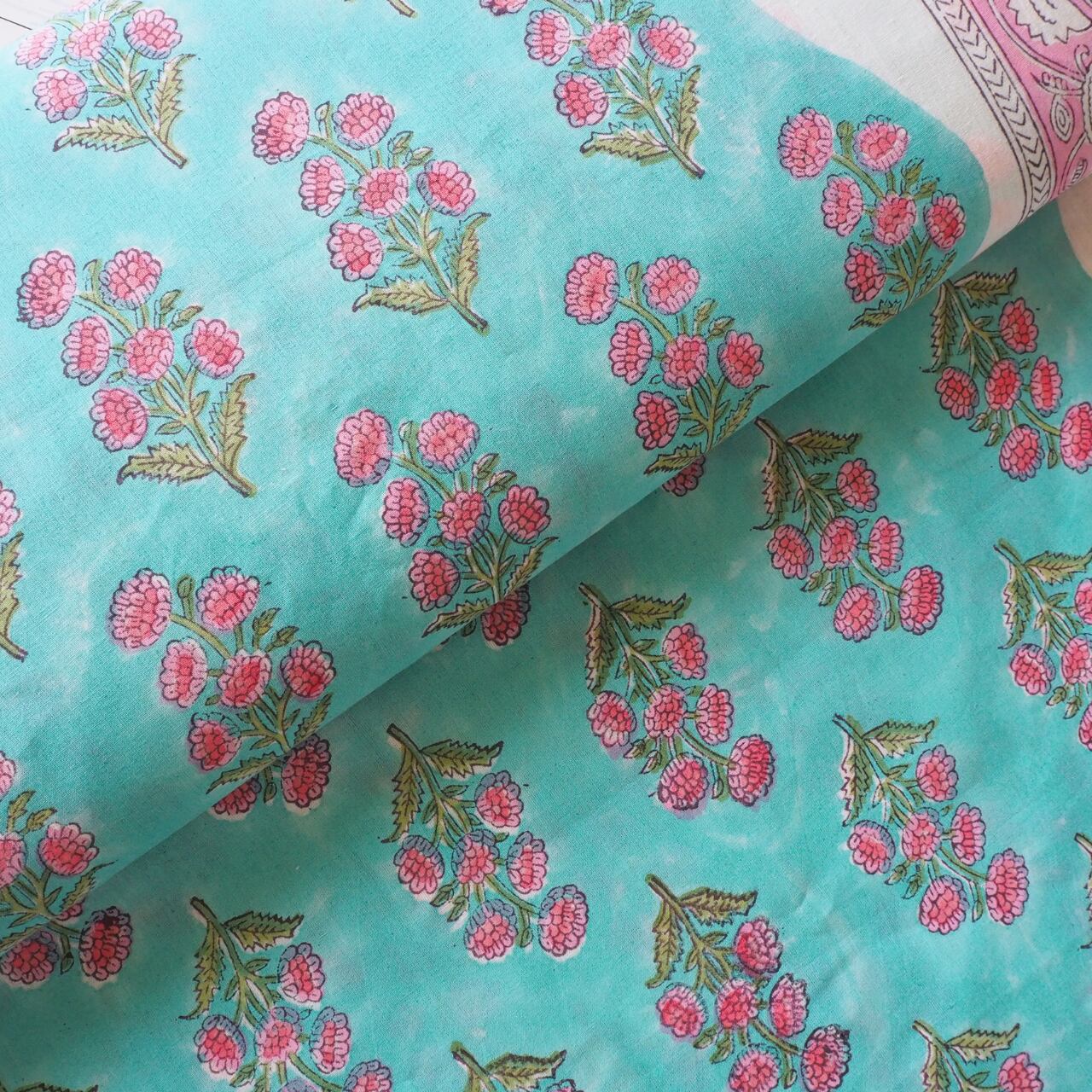 ブロックプリント生地【50cm単位】インド綿 片耳ボーダー付き 花柄A エメラルドグリーン×ピンク #19337-GR1【再入荷】