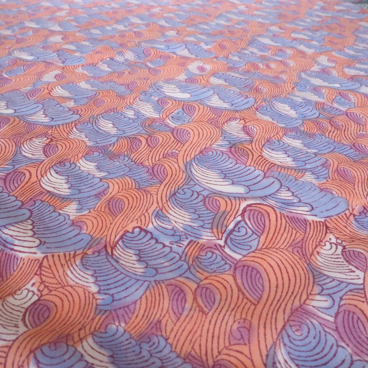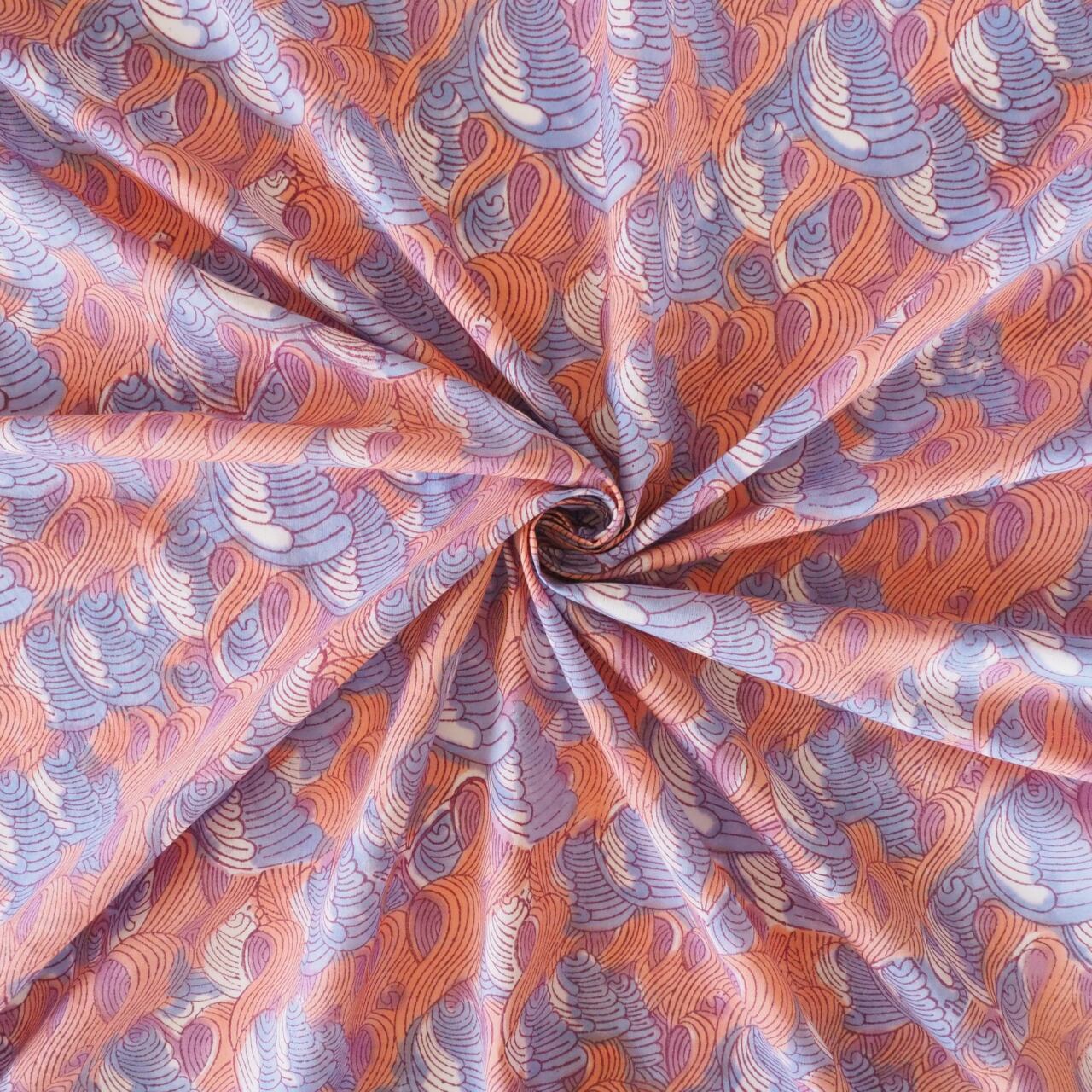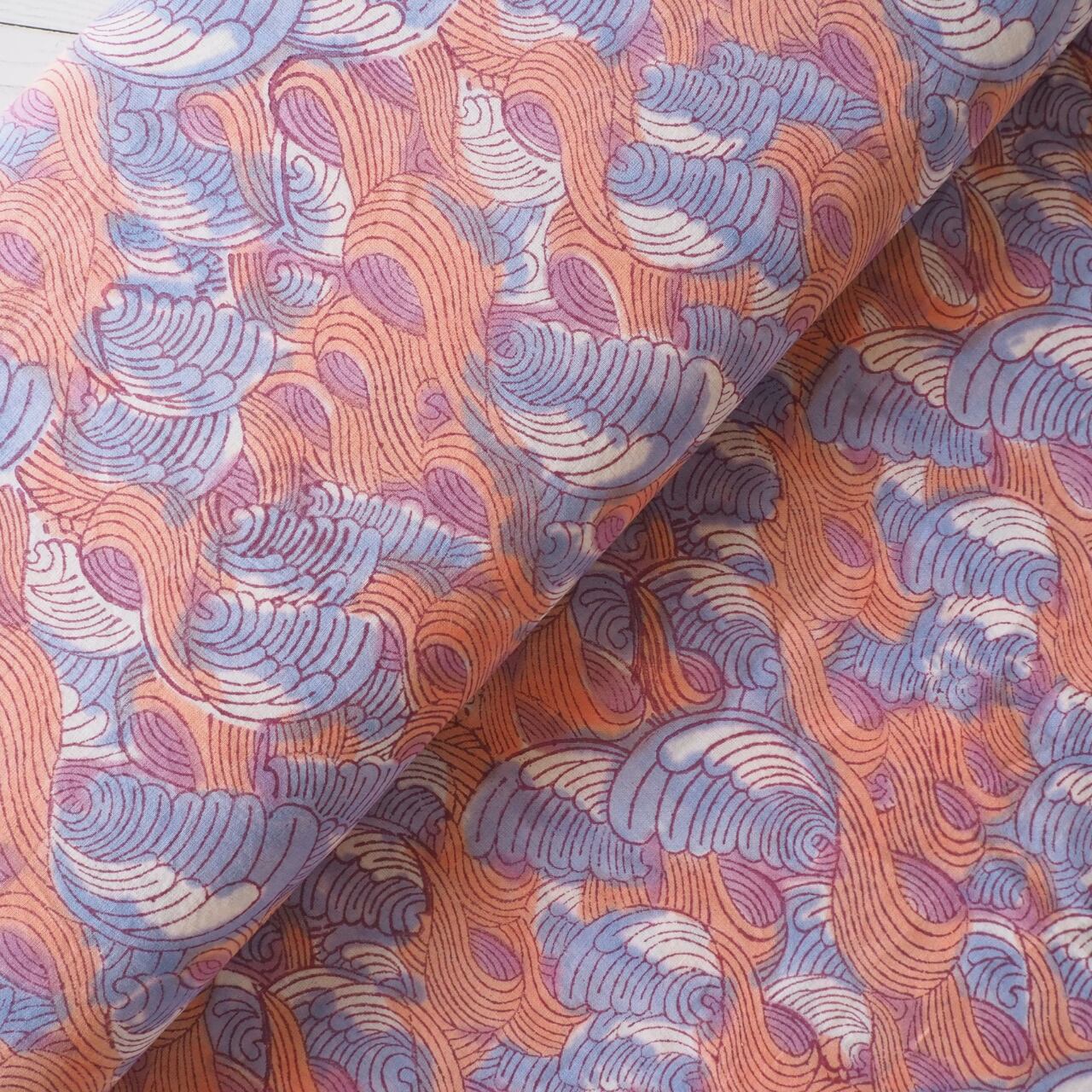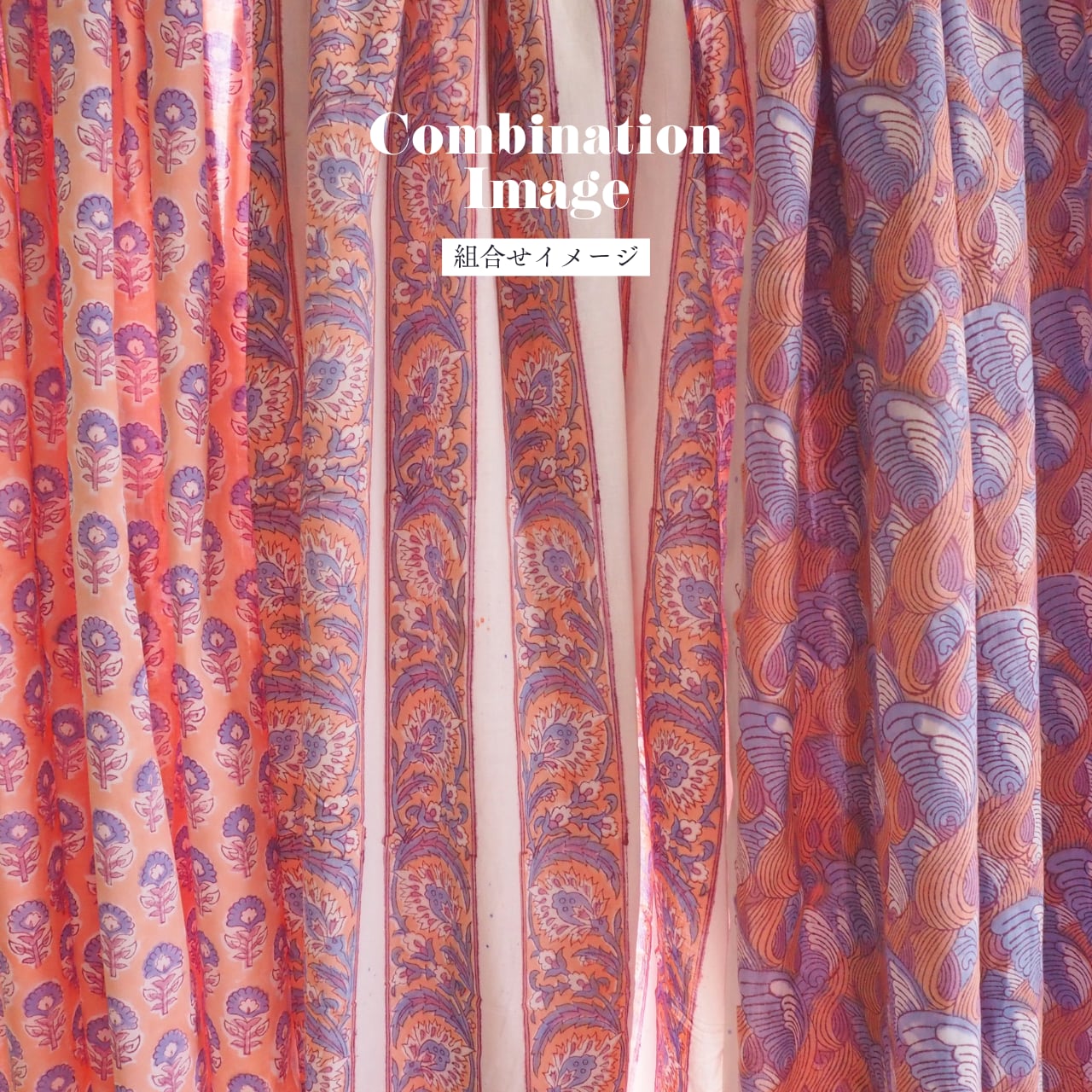 ブロックプリント生地【50cm単位】インド綿 羽柄 淡めオレンジ×パープル #19638-OR1
