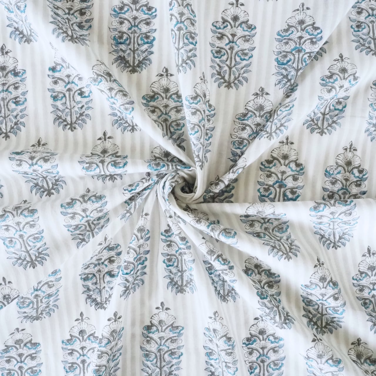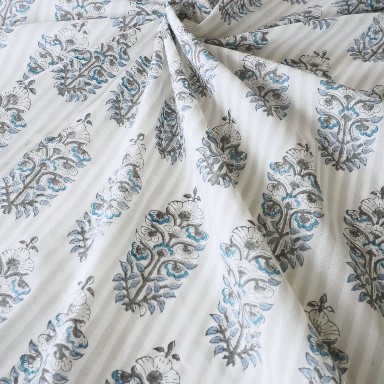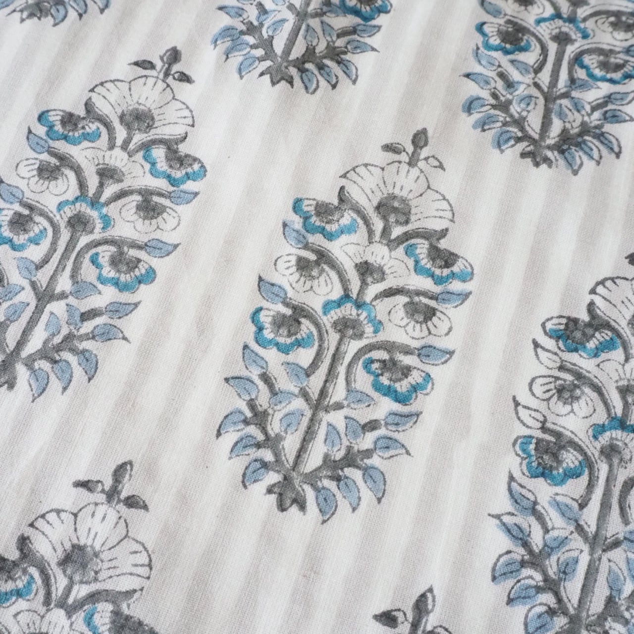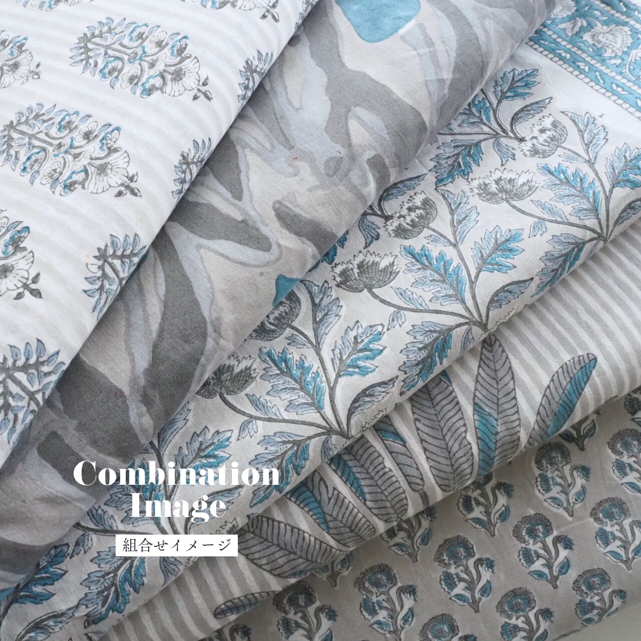 ブロックプリント生地【50cm単位】インド綿 ストライプ花柄 白×グレー×くすみブルー #20640-GR5