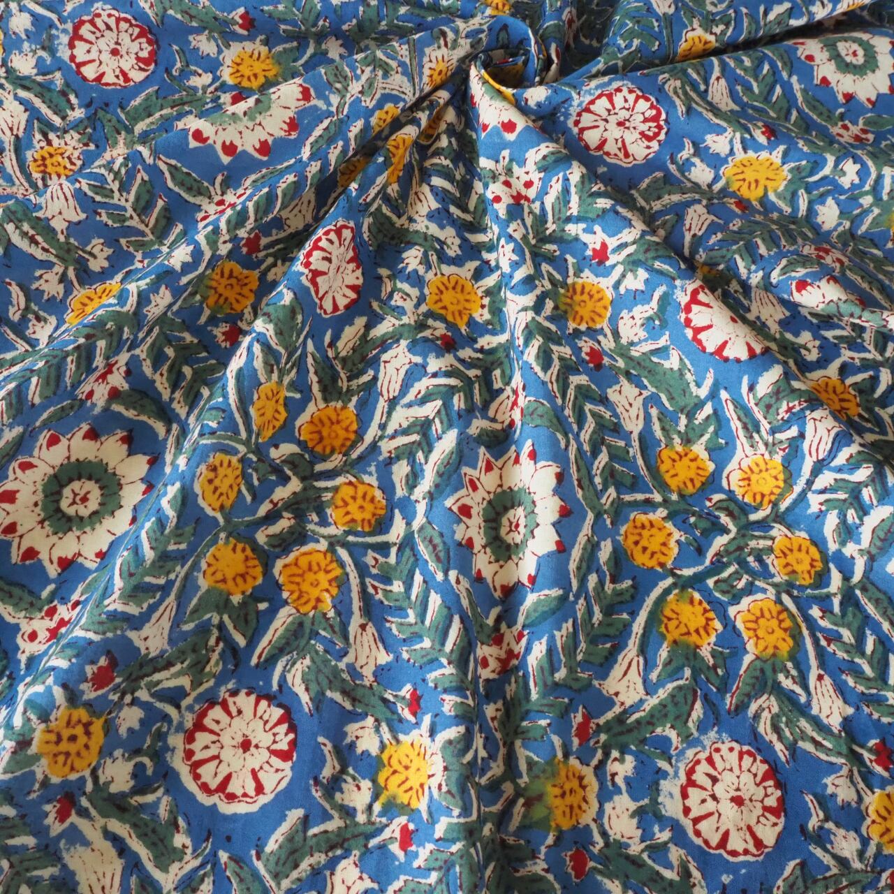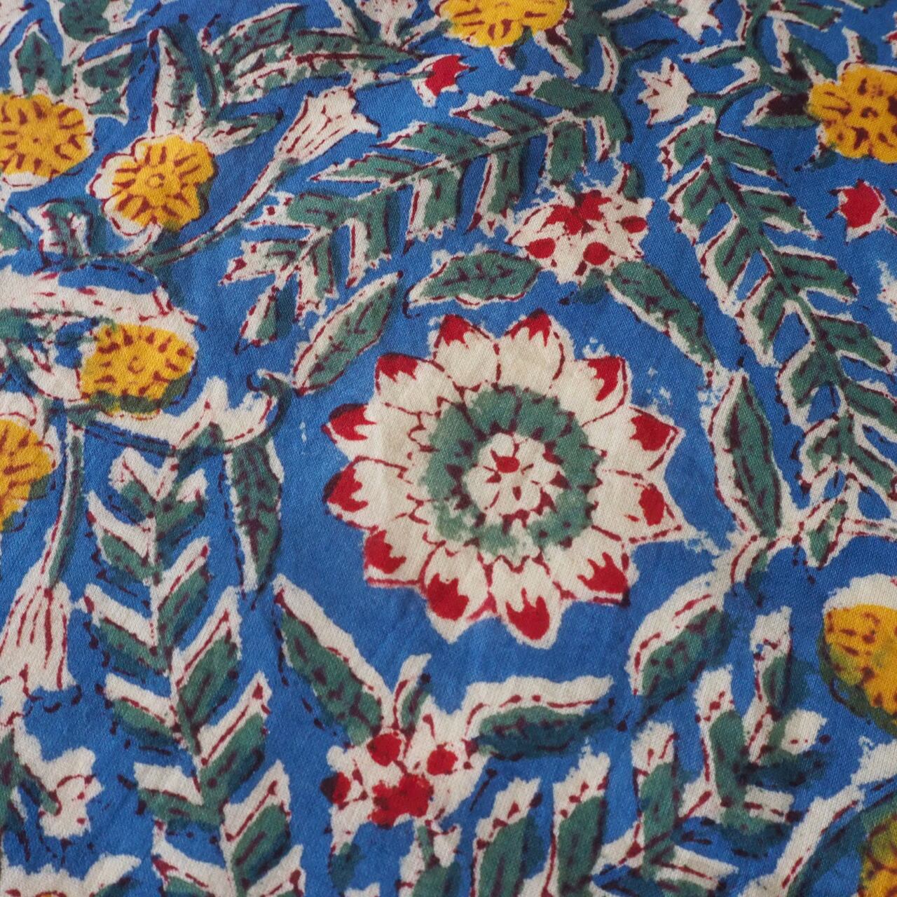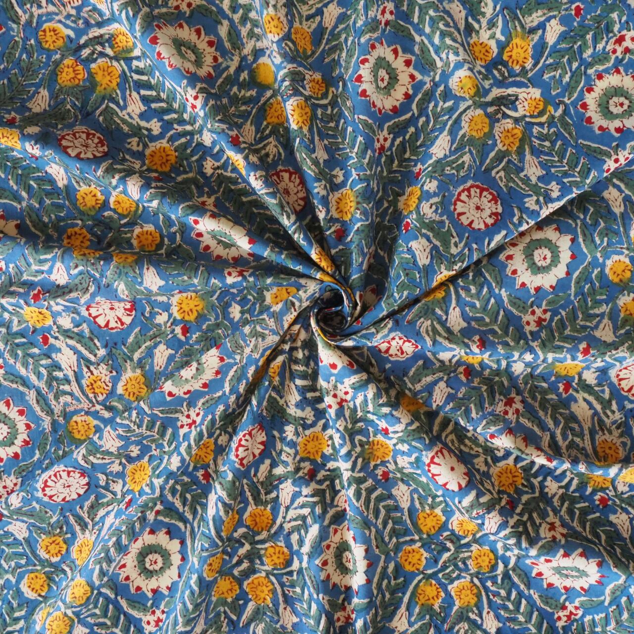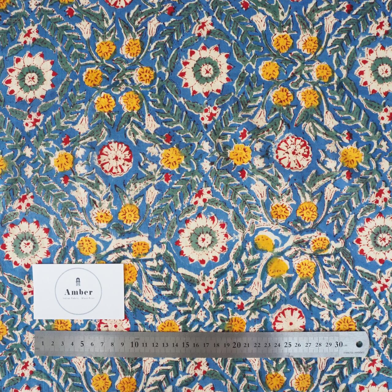 ブロックプリント生地【50cm単位】インド綿 唐草花柄 青×黄色 #20942-BL1