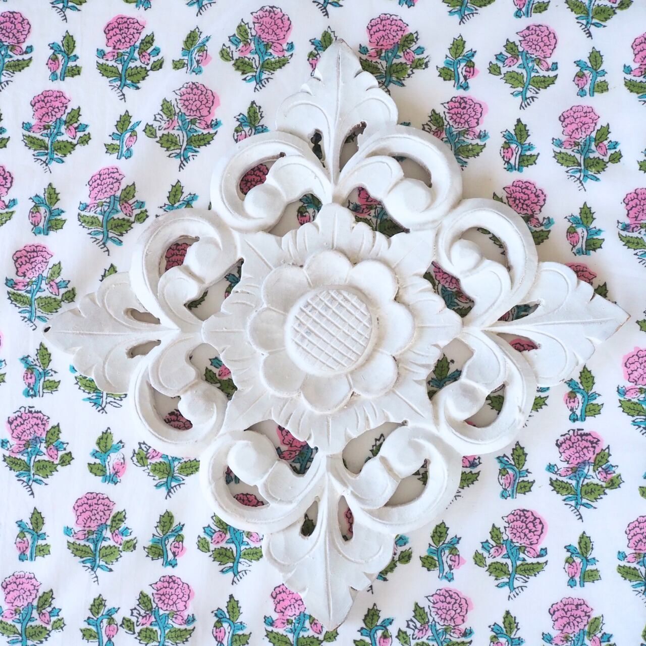 ハンドブロックプリントと呼ばれるインドのジャイプール地方に古くから伝わる伝統的な技法で、木彫りのスタンプで色を何度も重ね、全ての工程がインドの職人さんの手作業によって仕上がるAll Handmadeの生地です。