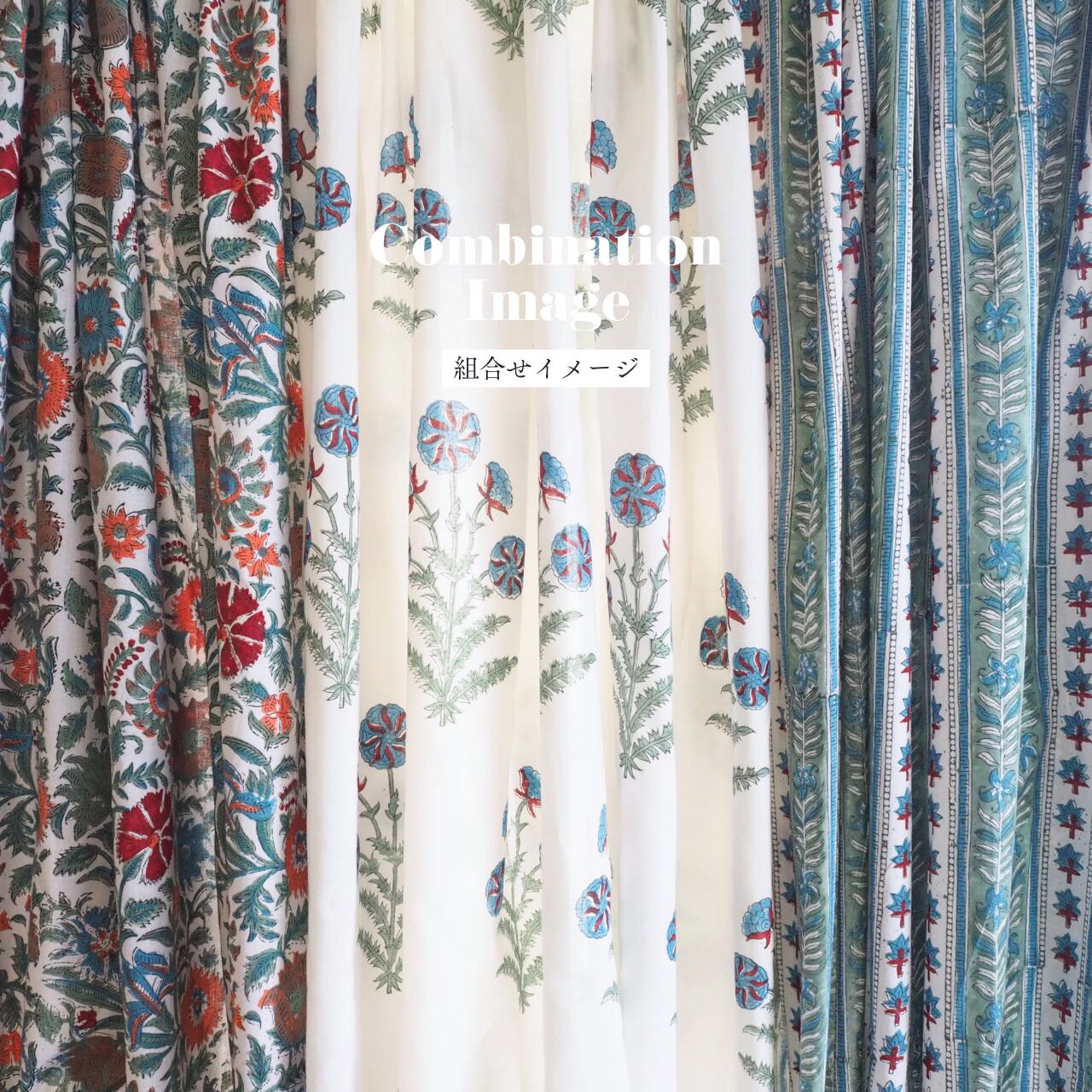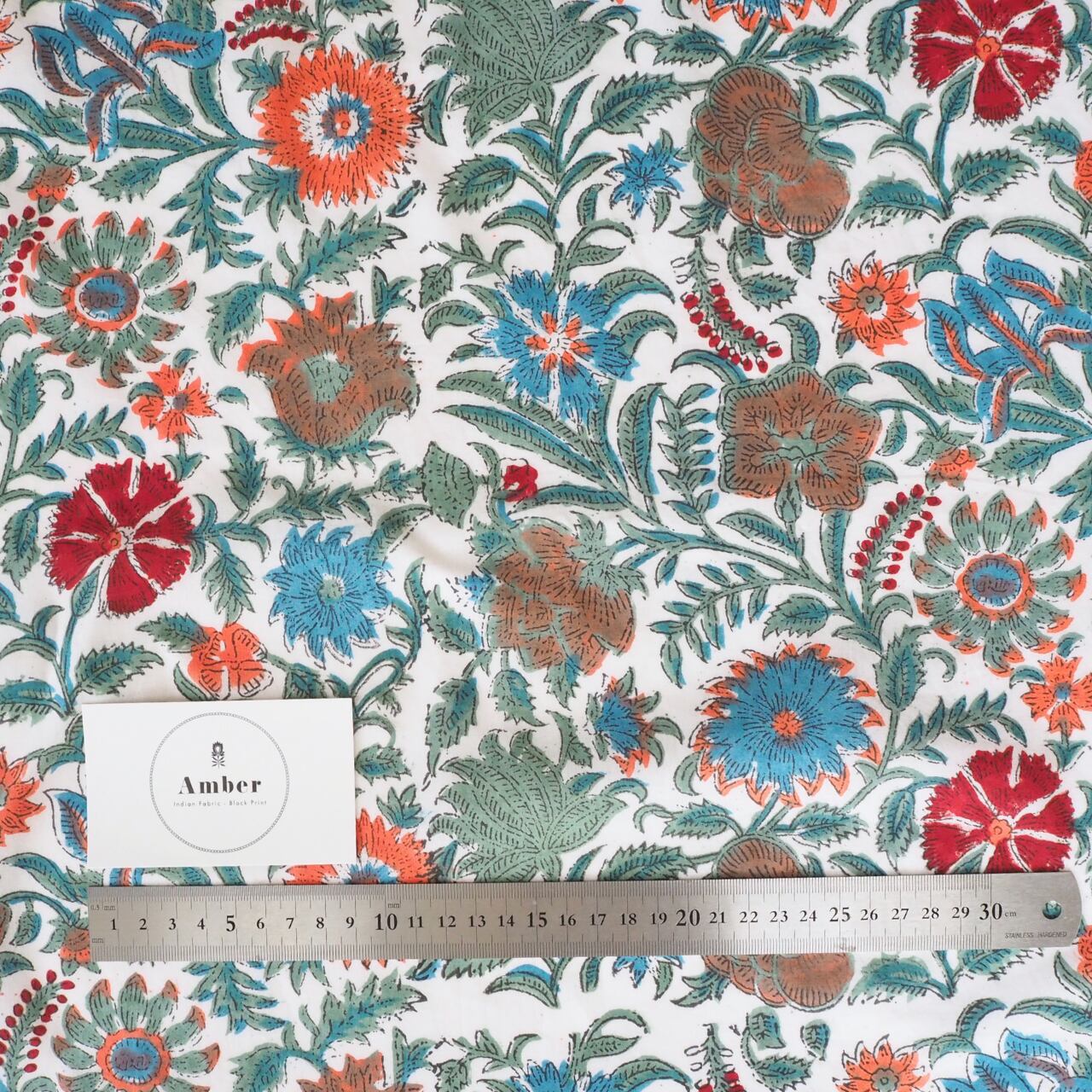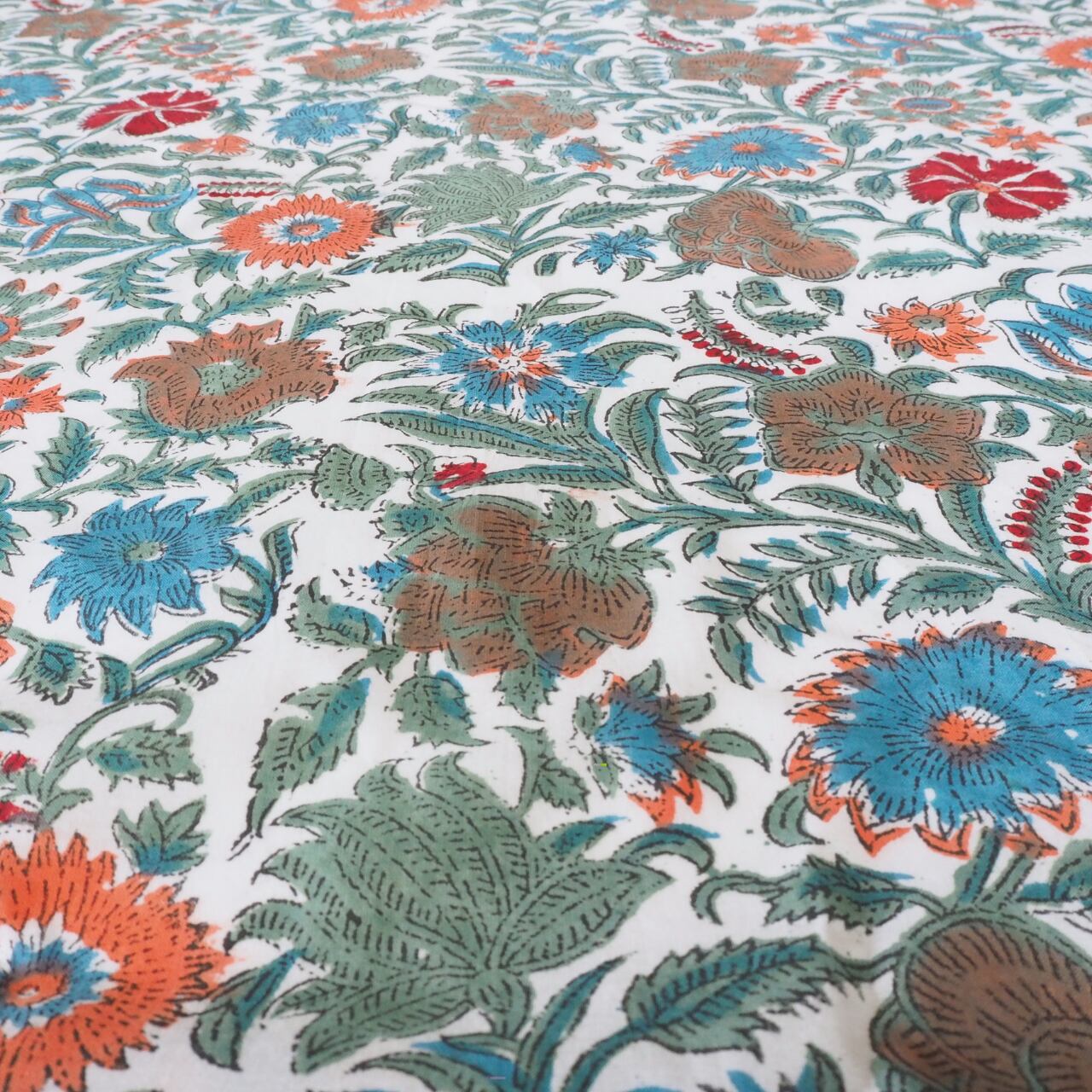 ブロックプリント生地【50cm単位】インド綿 花柄 白×くすみグリーン/ブルー/オレンジ/赤 #22246-WT3