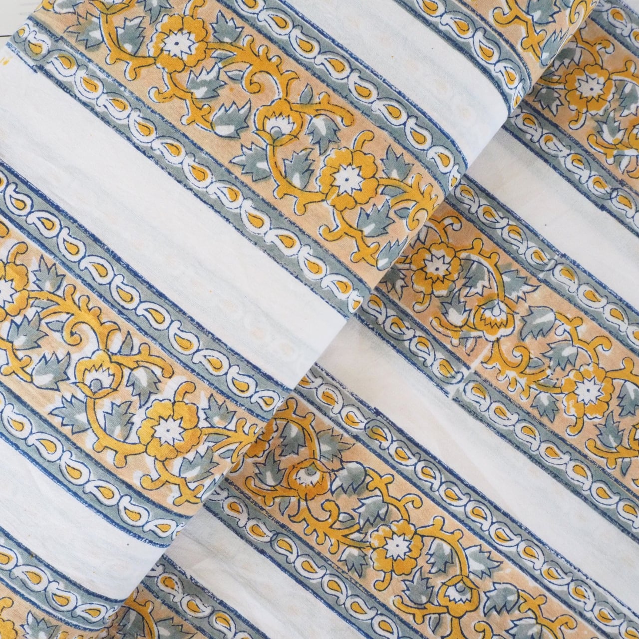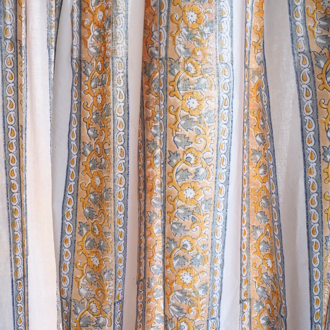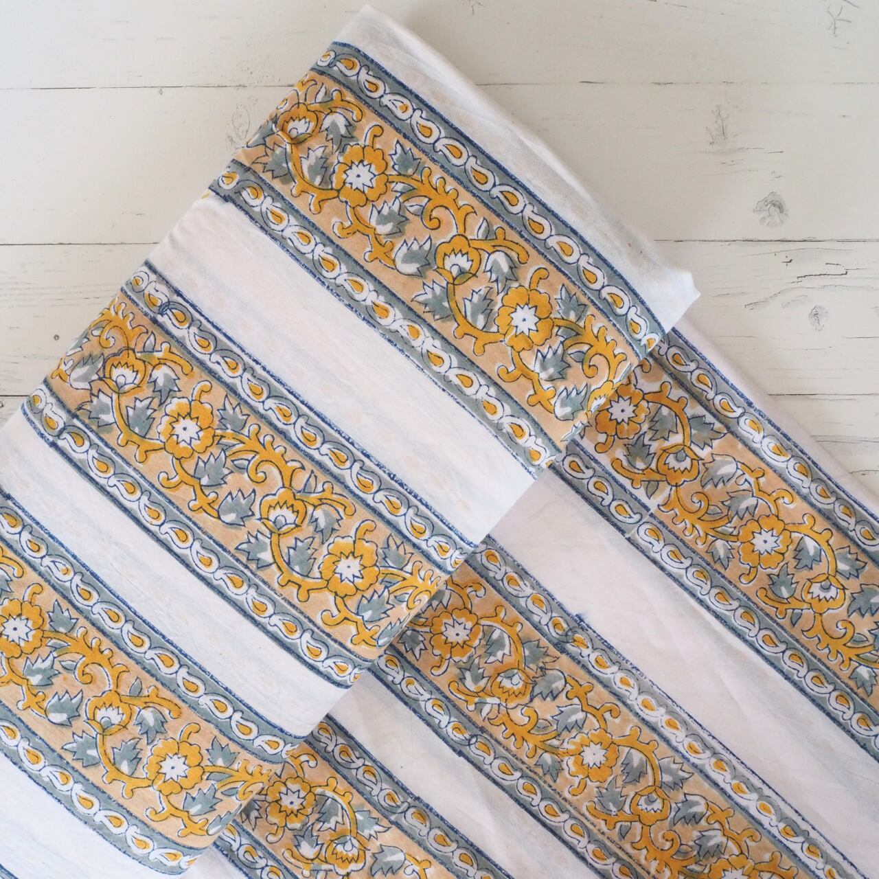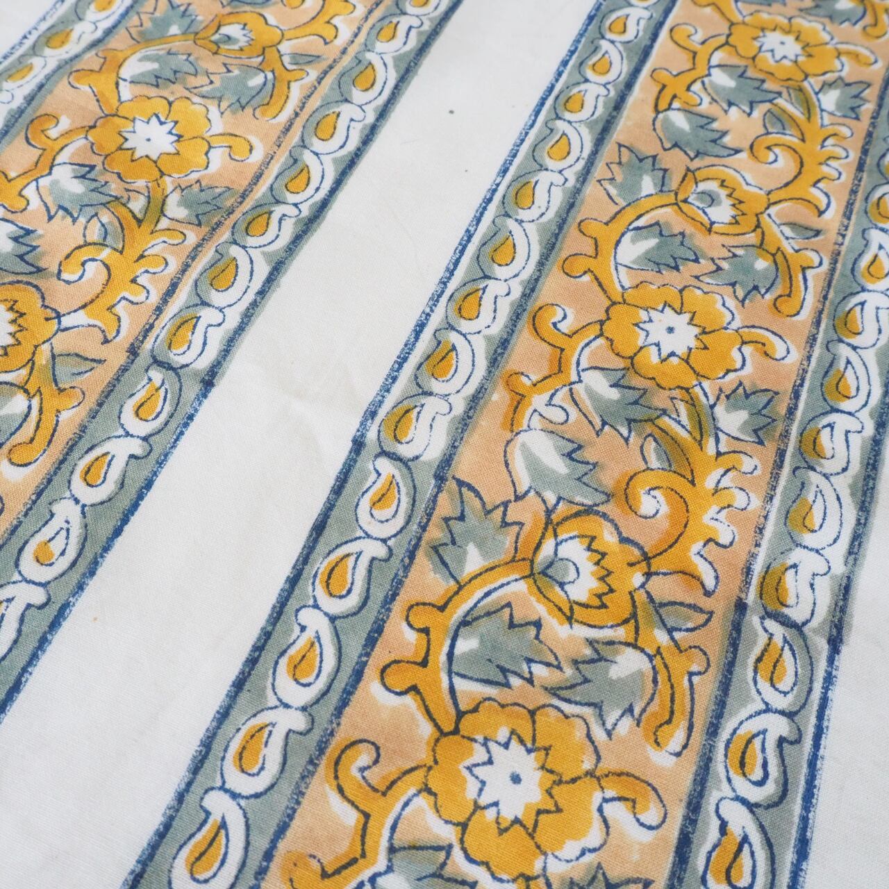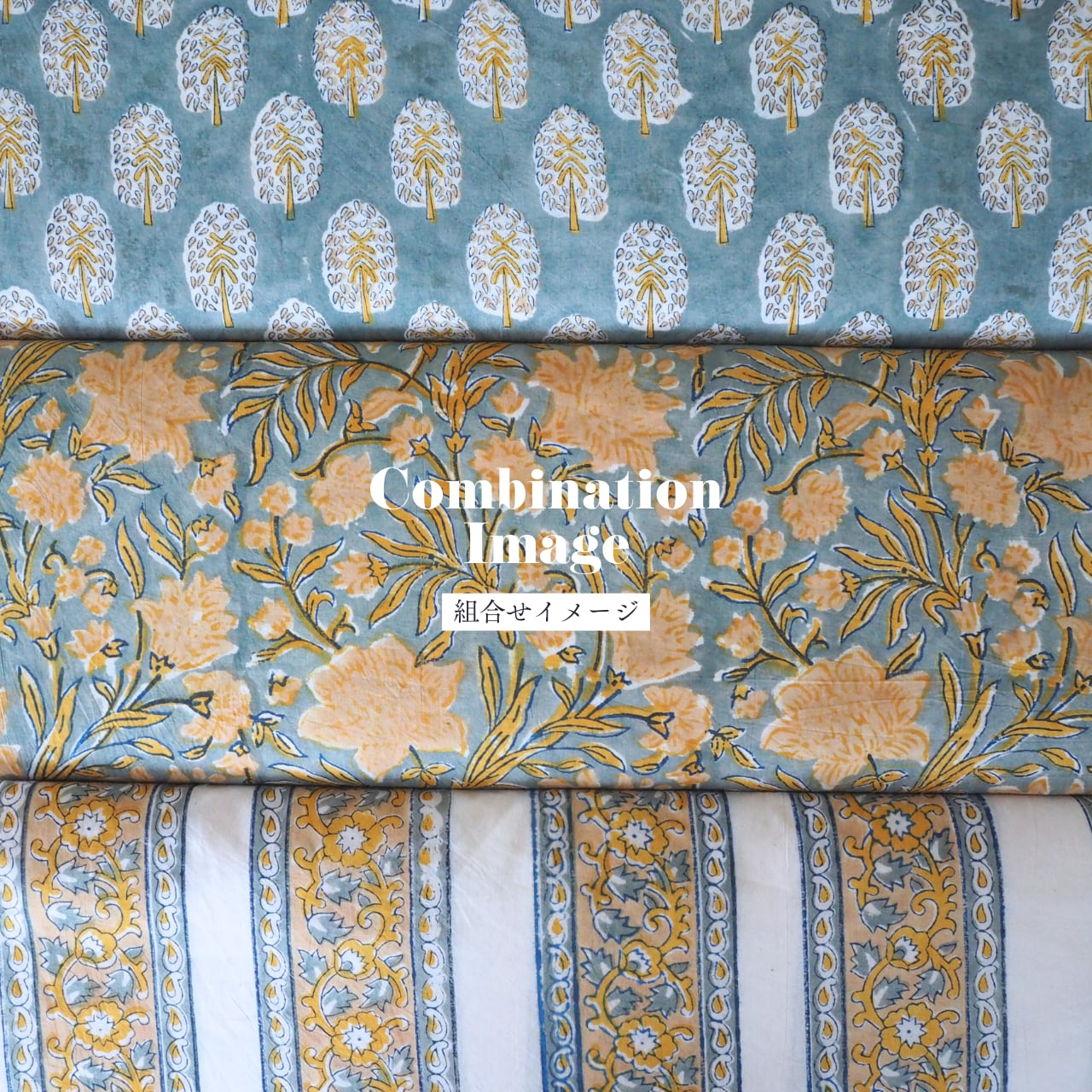 ハンドブロックプリントと呼ばれるインドのジャイプール地方に古くから伝わる伝統的な技法で、木彫りのスタンプで色を何度も重ね、全ての工程がインドの職人さんの手作業によって仕上がるAll Handmadeの生地です。