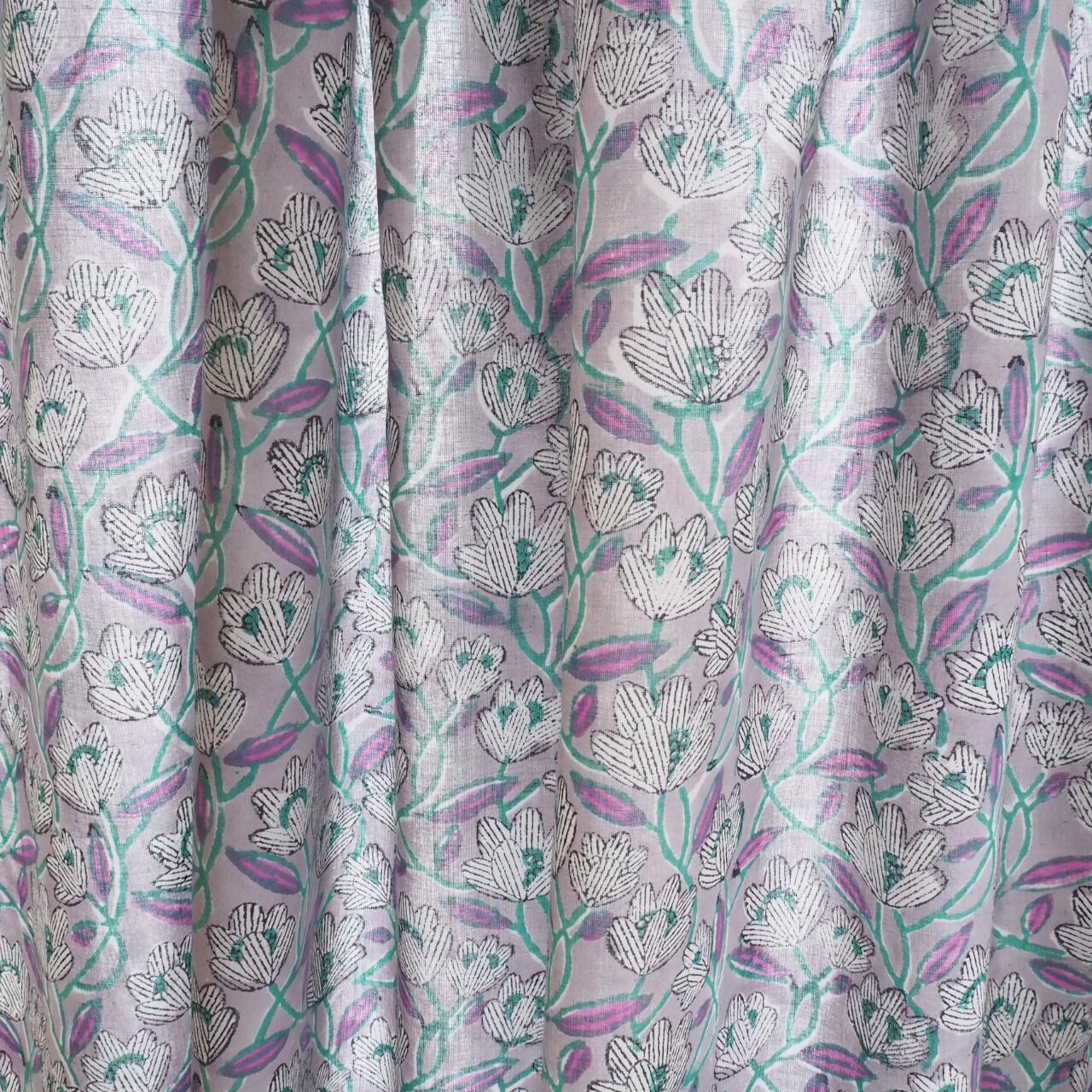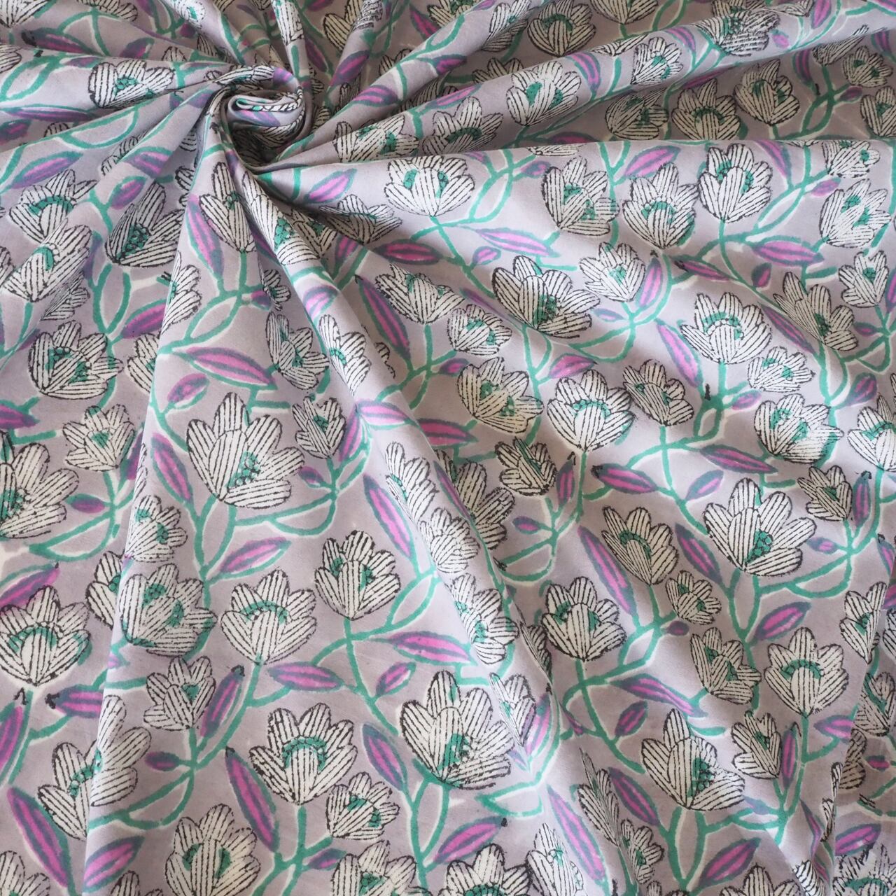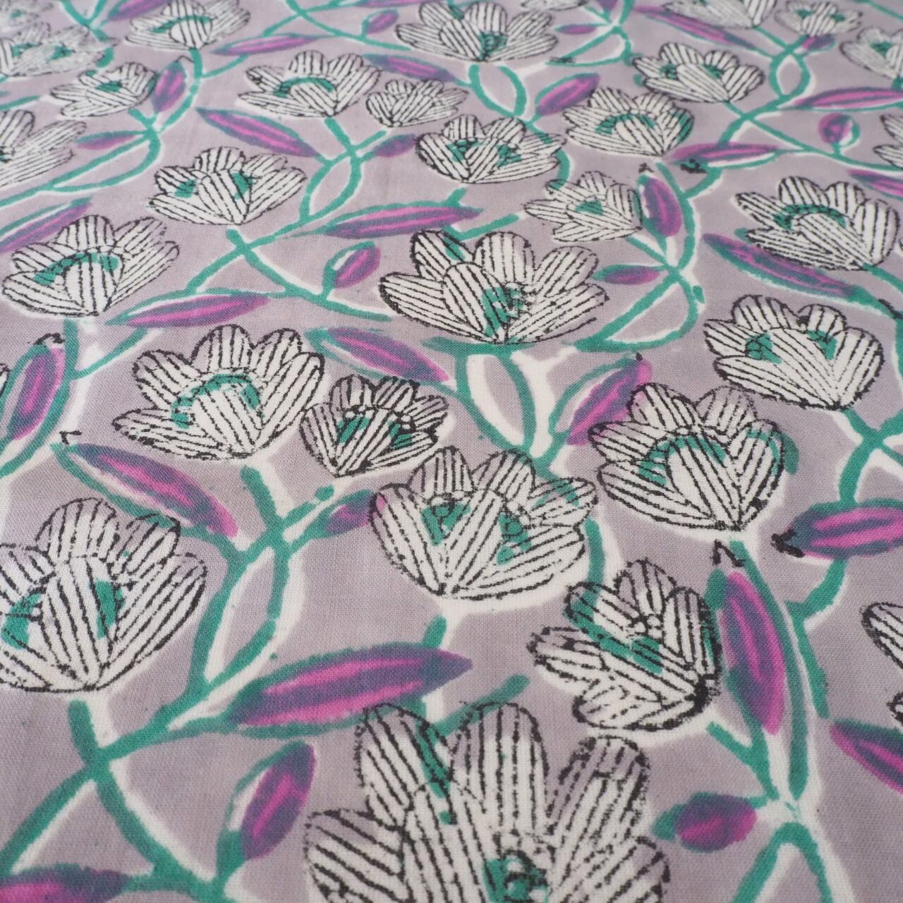 ブロックプリント生地【50cm単位】インド綿 花柄 グレー×紫 #23351-PR1