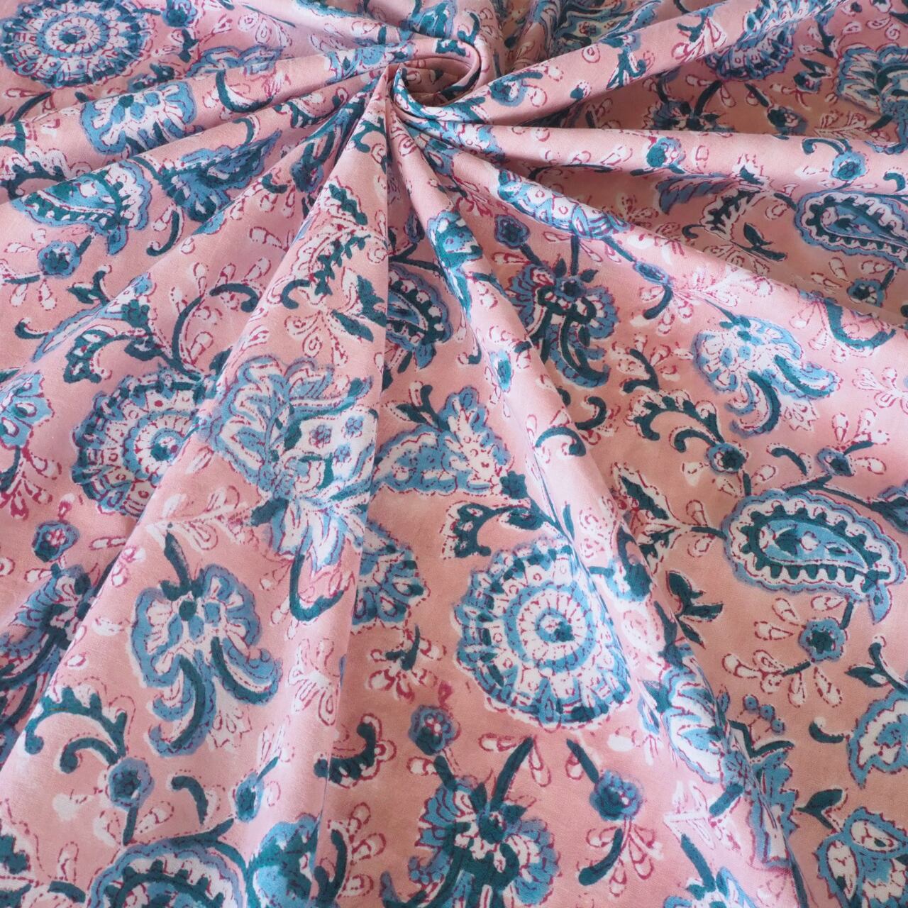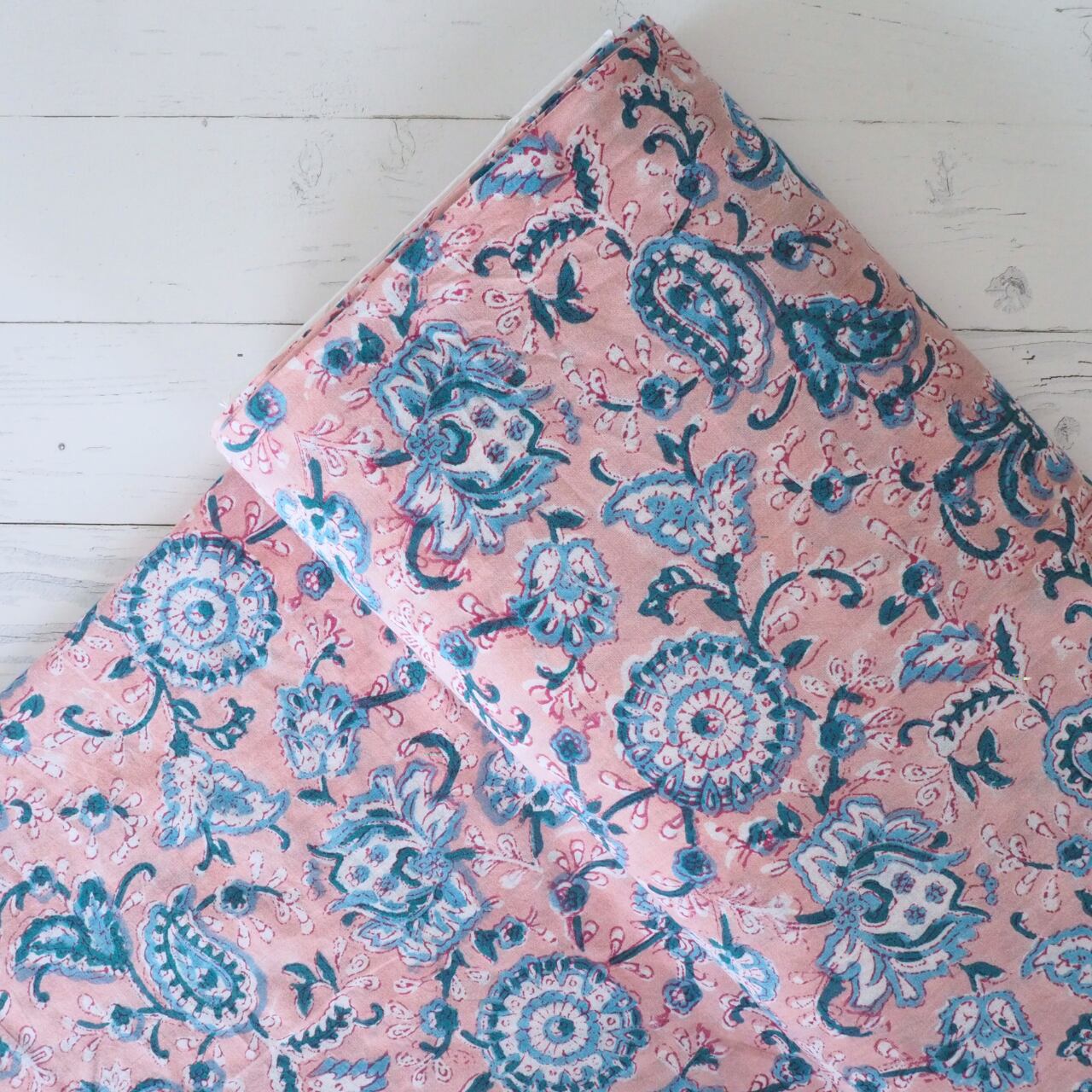 ブロックプリント生地【50cm単位】インド綿 花柄&ペイズリー ピンク #24154-PK1