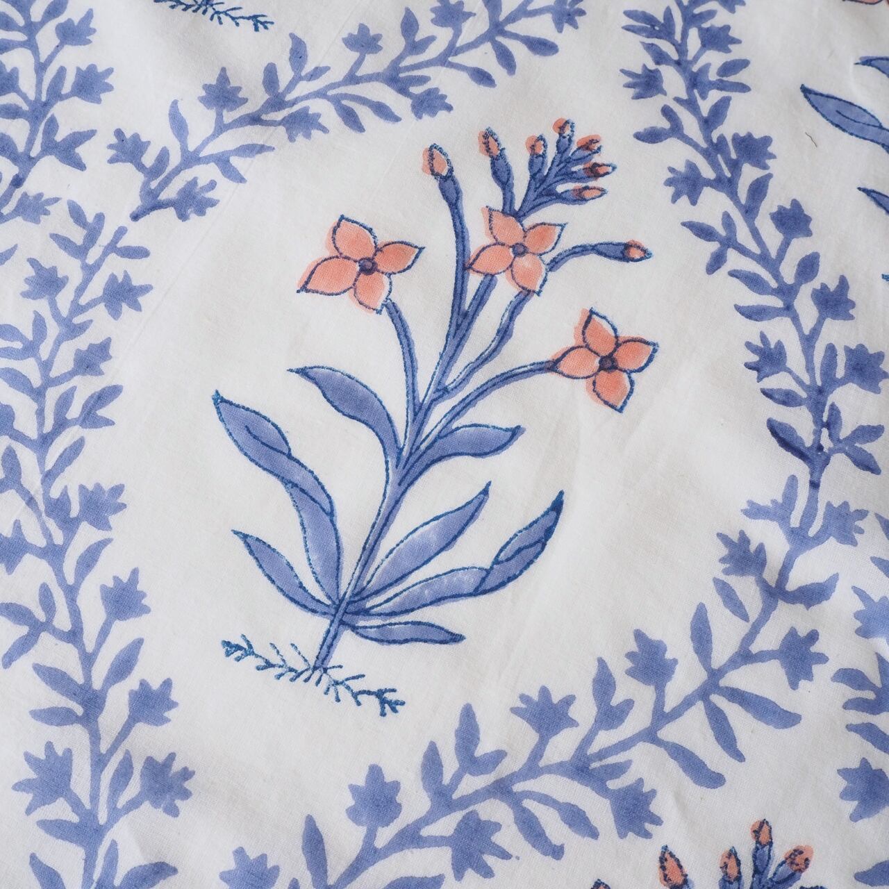 ハンドブロックプリントと呼ばれるインドのジャイプール地方に古くから伝わる伝統的な技法で、木彫りのスタンプで色を何度も重ね、全ての工程がインドの職人さんの手作業によって仕上がるAll Handmadeの生地です。