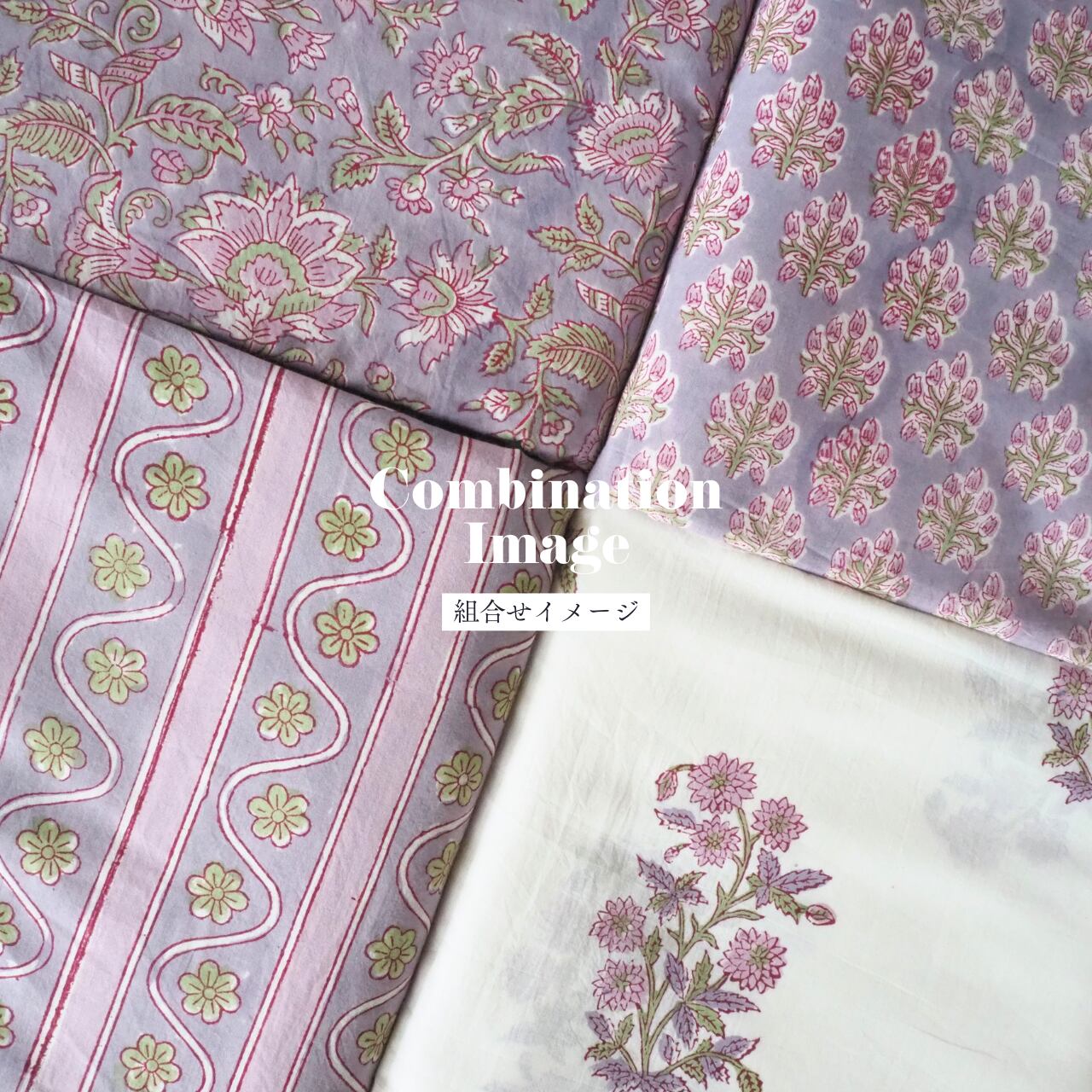 ハンドブロックプリントと呼ばれるインドのジャイプール地方に古くから伝わる伝統的な技法で、木彫りのスタンプで色を何度も重ね、全ての工程がインドの職人さんの手作業によって仕上がるAll Handmadeの生地です。