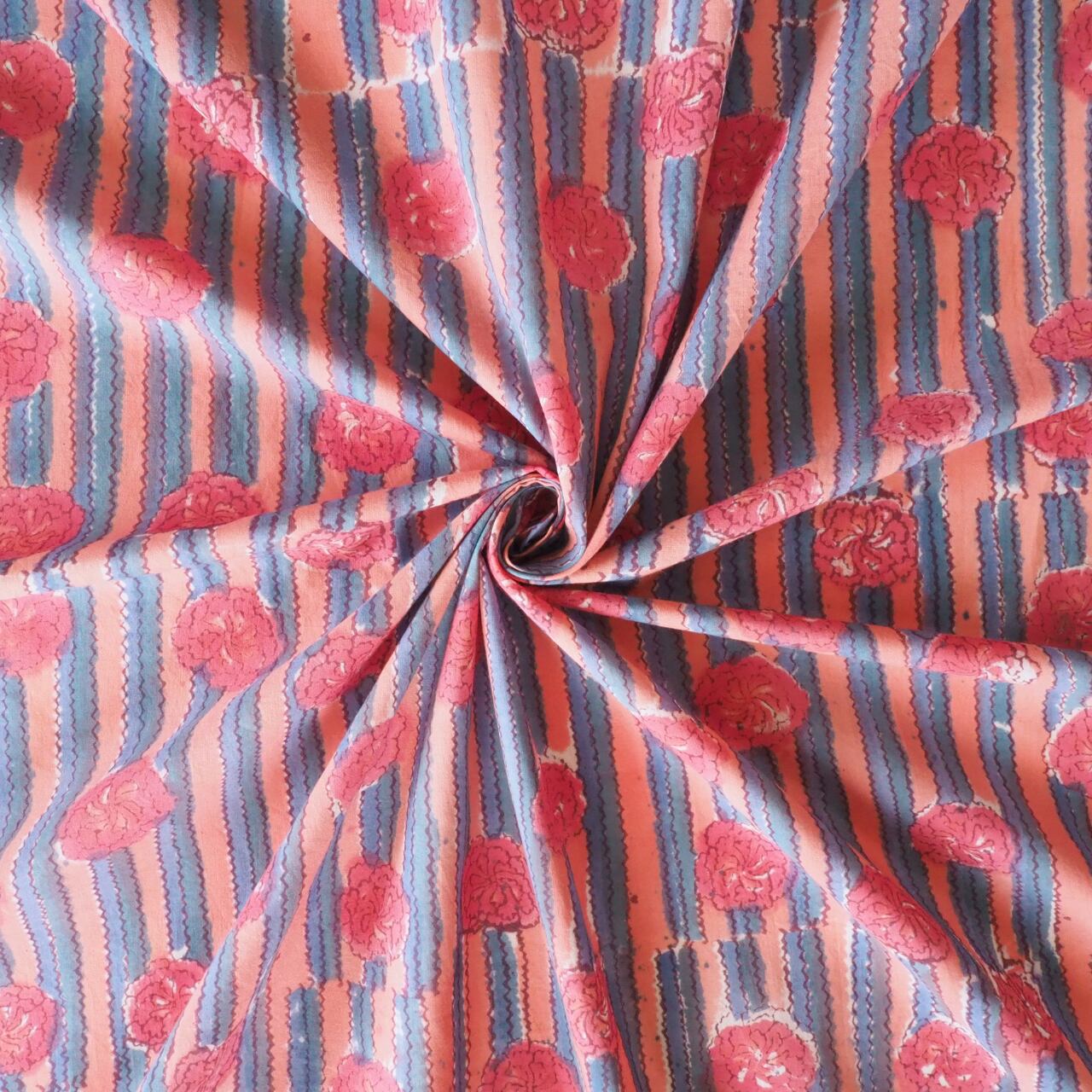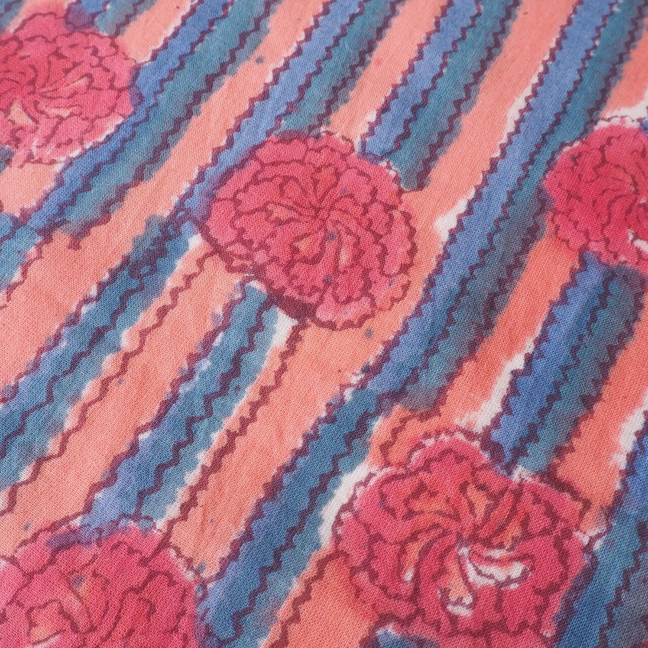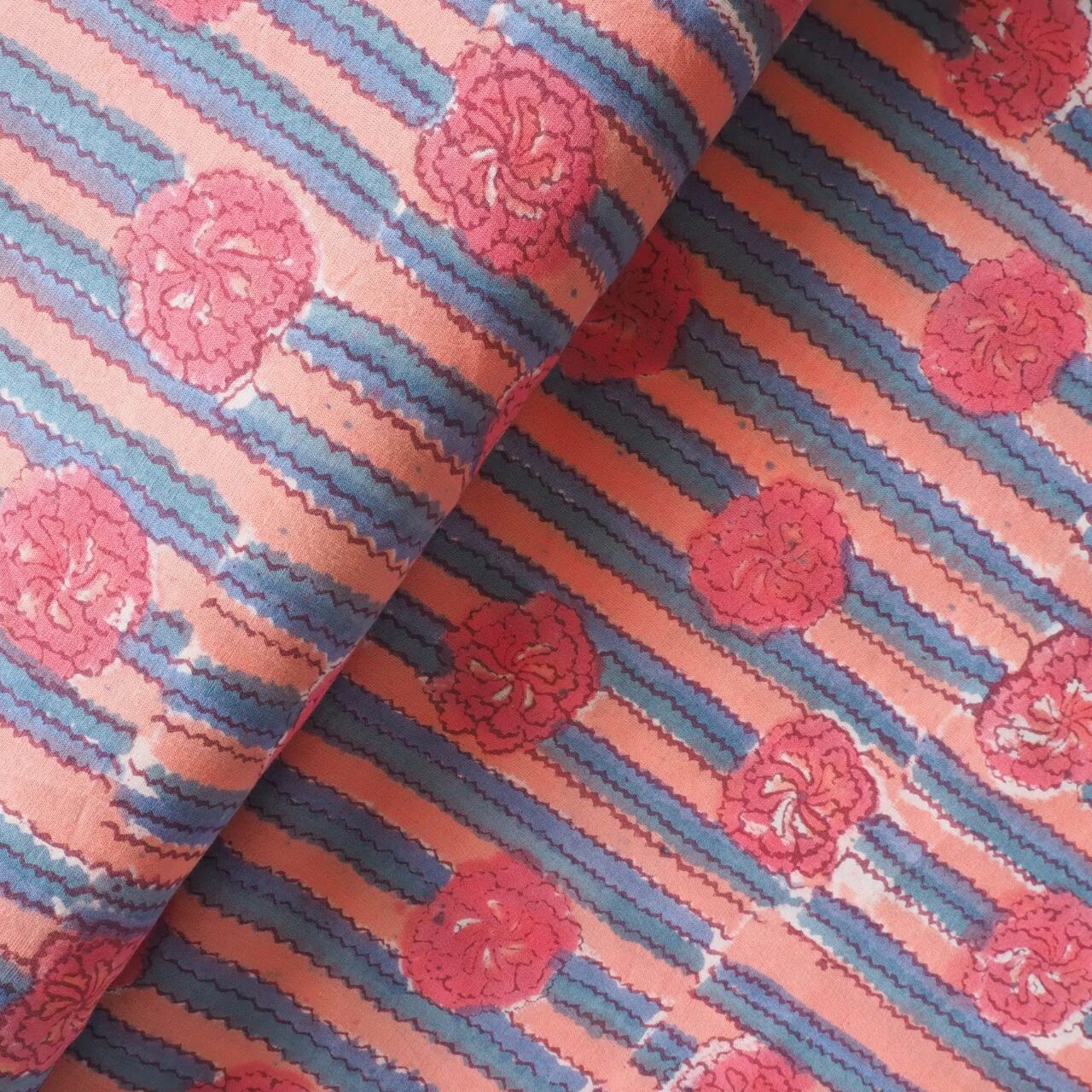 ブロックプリント生地【50cm単位】インド綿 花・ストライプ柄 ピンク×くすみブルー #27110-PK1
