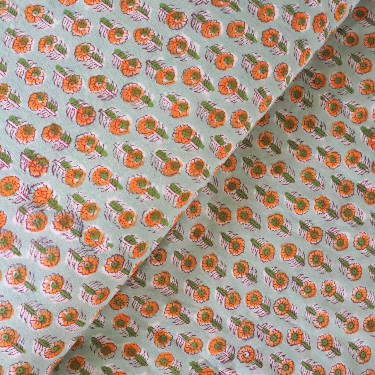 ブロックプリント生地【50cm単位】インド綿 小花柄 グリーン×オレンジ #29110-GR2