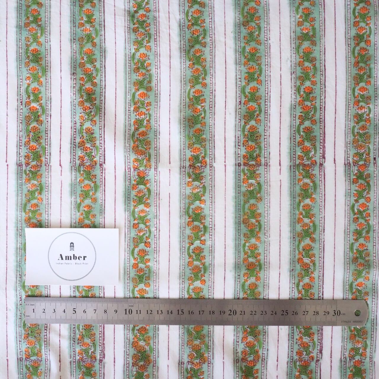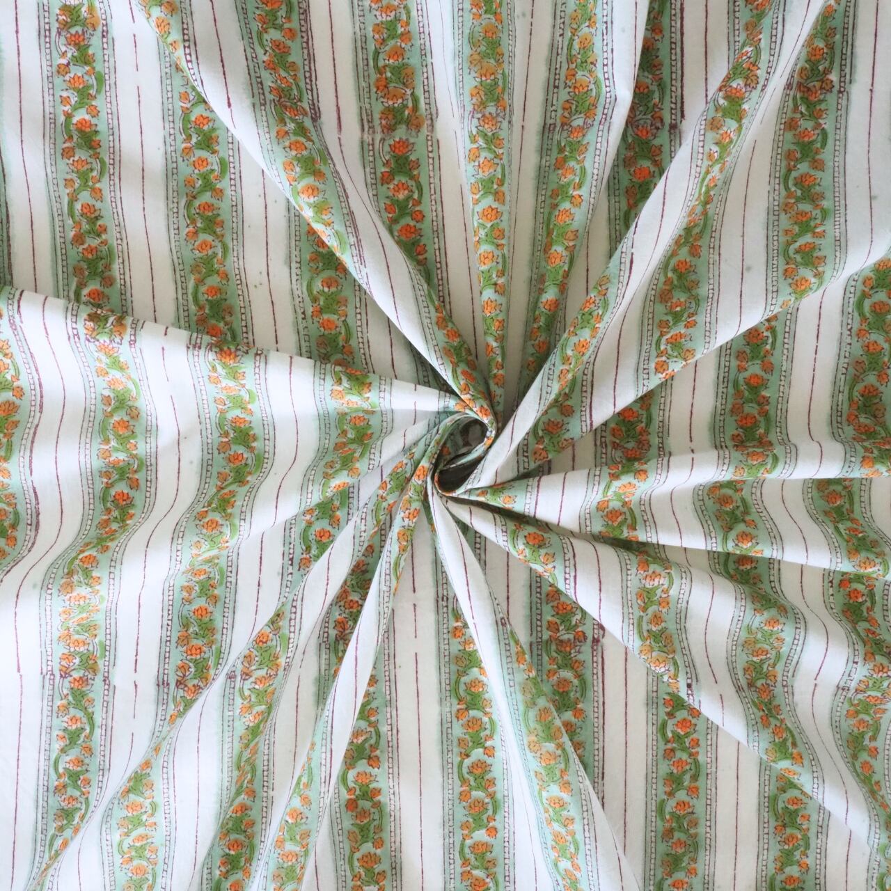 ブロックプリント生地【50cm単位】インド綿 ストライプ柄 グリーン×オレンジ #29210-GR3