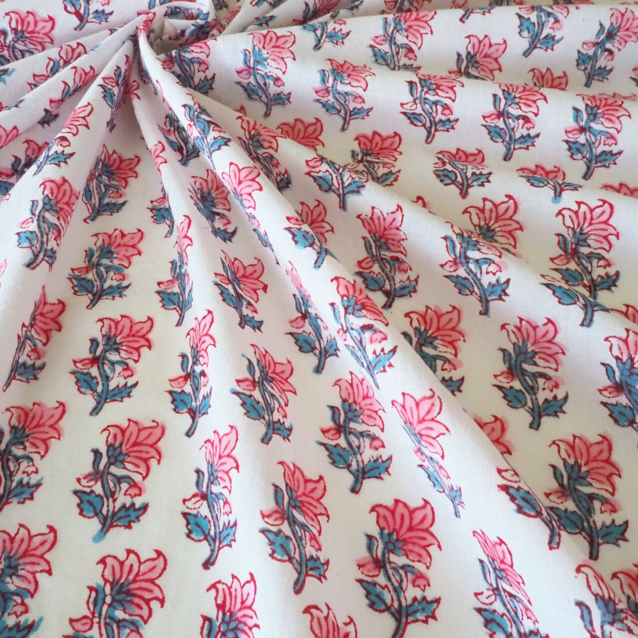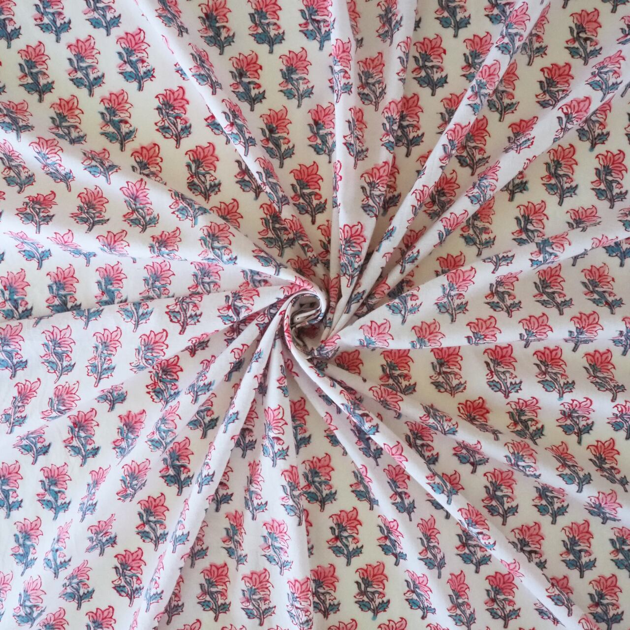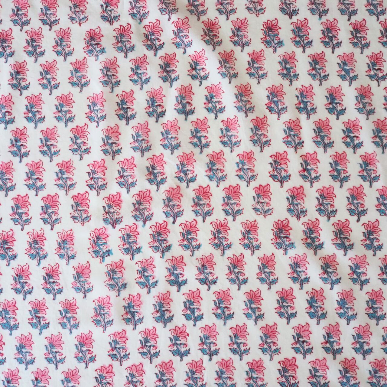 ブロックプリント生地【50cm単位】インド綿 小花柄 白×ピンク#31570-WT2