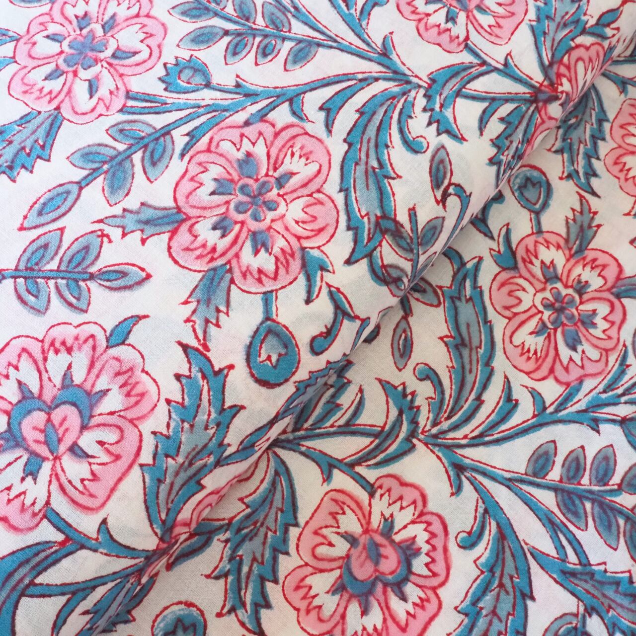 ブロックプリント生地【50cm単位】インド綿 花柄 白×ピンク#31470-WT1