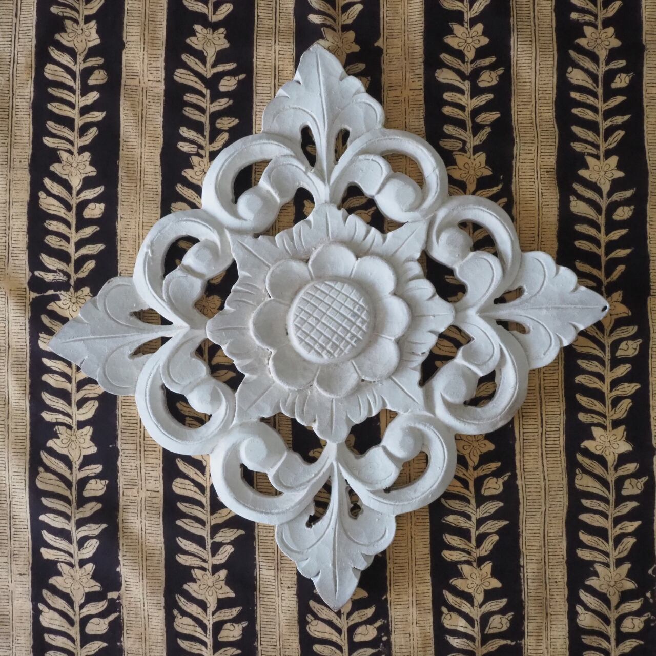 ハンドブロックプリントと呼ばれるインドのジャイプール地方に古くから伝わる伝統的な技法で、木彫りのスタンプで色を何度も重ね、全ての工程がインドの職人さんの手作業によって仕上がるAll Handmadeの生地です。