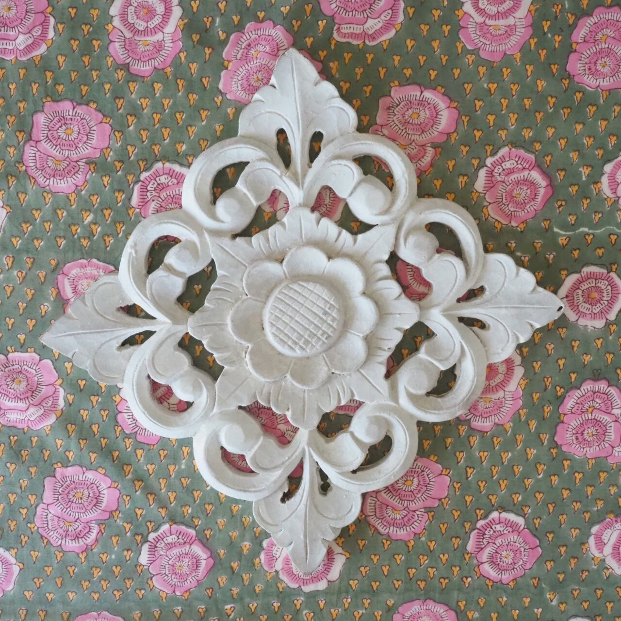ハンドブロックプリントと呼ばれるインドのジャイプール地方に古くから伝わる伝統的な技法で、木彫りのスタンプで色を何度も重ね、全ての工程がインドの職人さんの手作業によって仕上がるAll Handmadeの生地です。