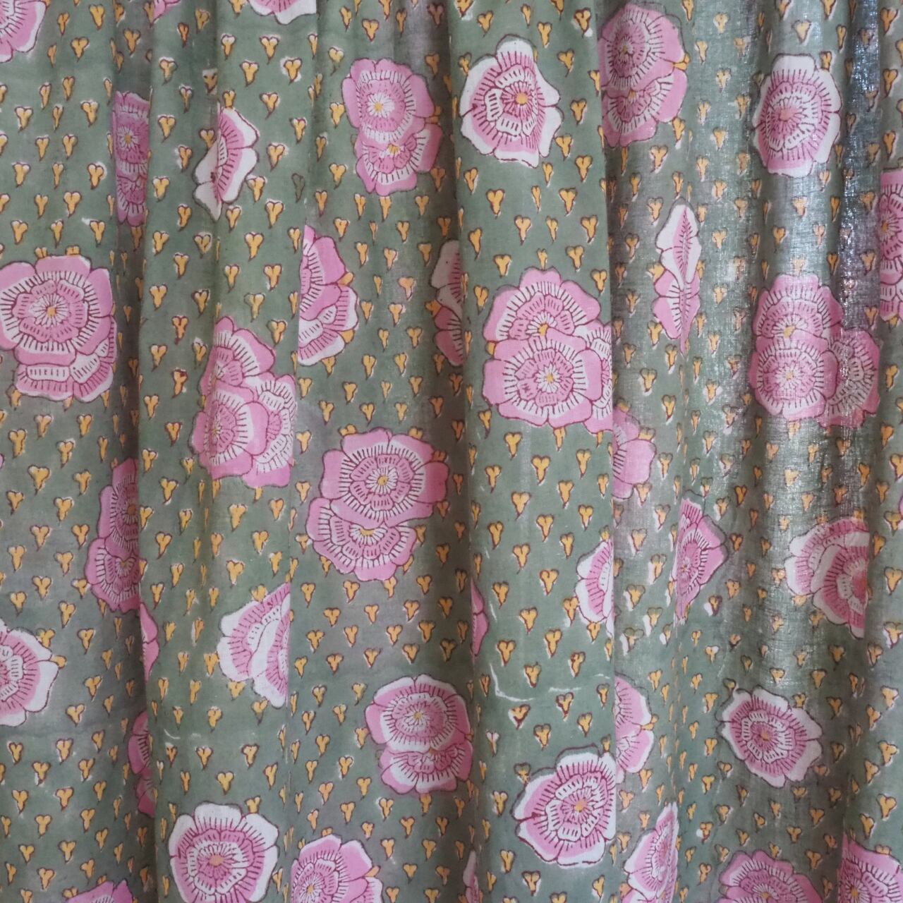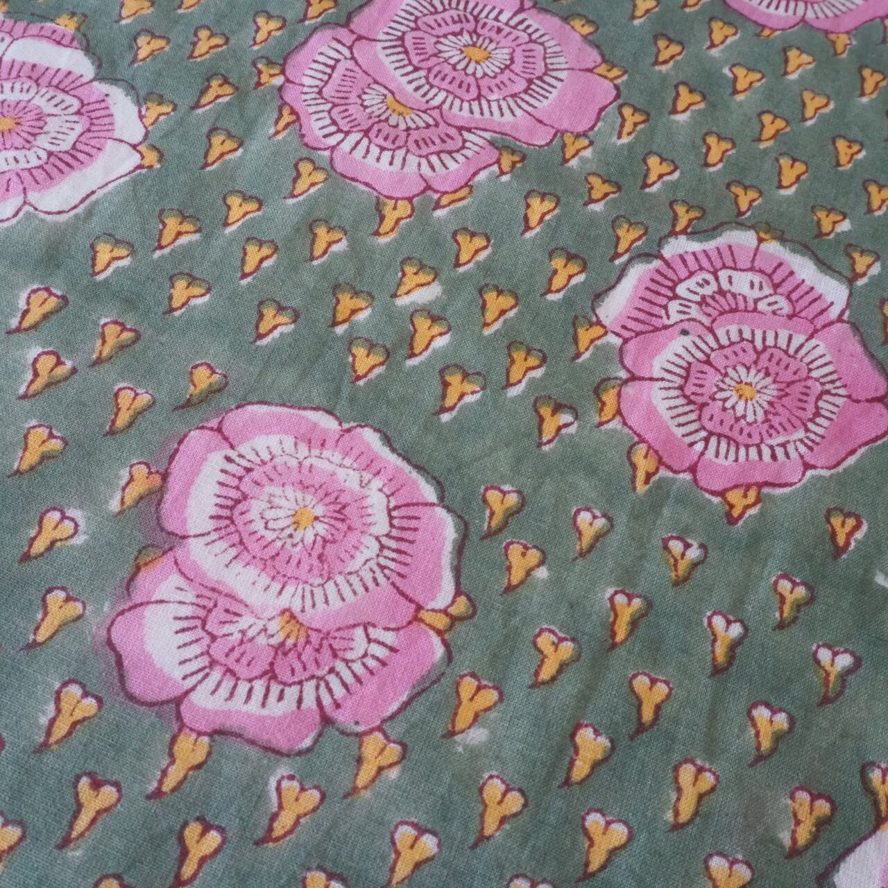 ブロックプリント生地【50cm単位】インド綿 花柄 カーキ×ピンク #35371-KH1