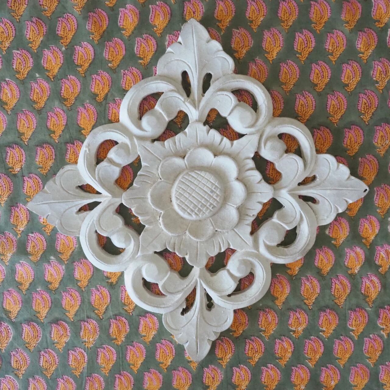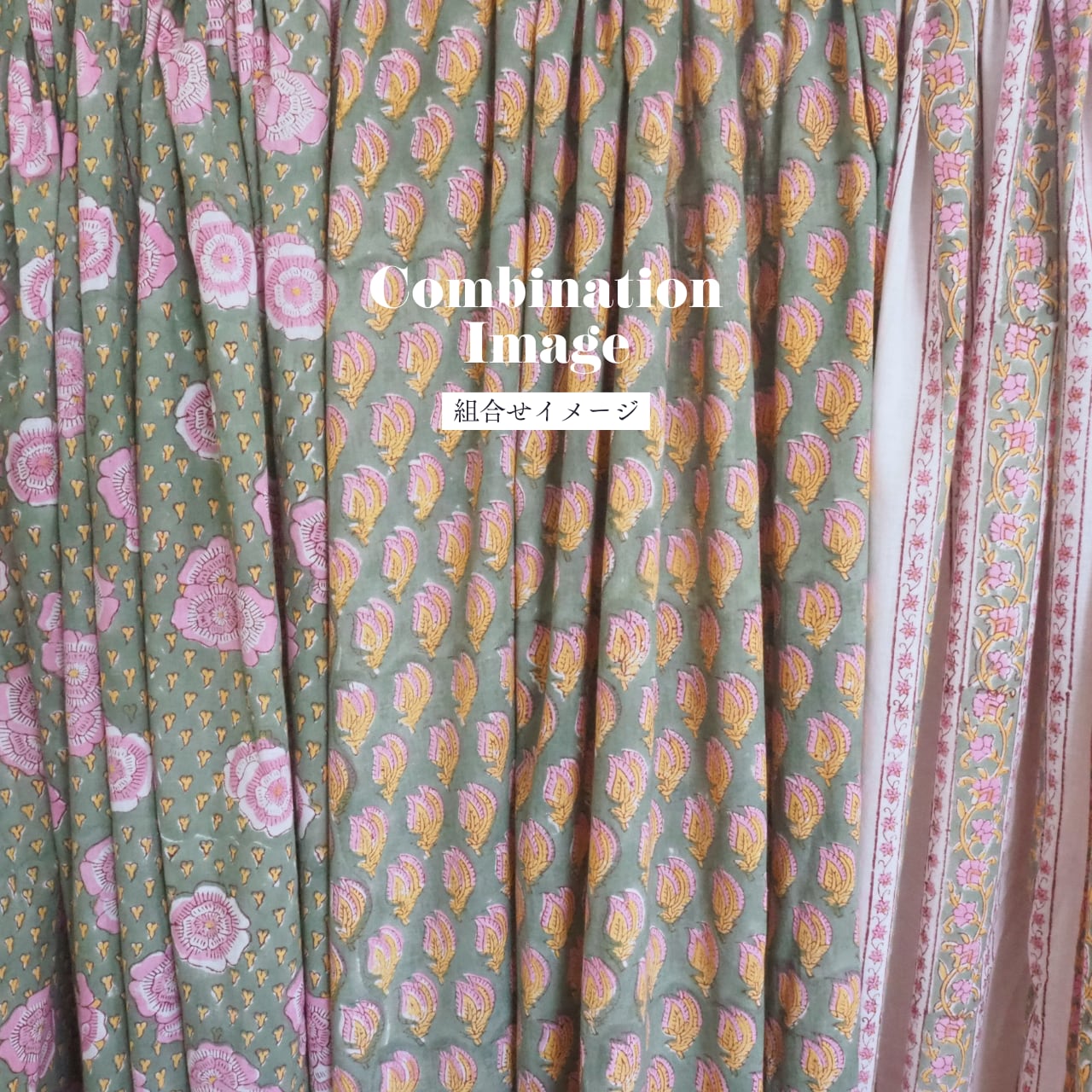 ハンドブロックプリントと呼ばれるインドのジャイプール地方に古くから伝わる伝統的な技法で、木彫りのスタンプで色を何度も重ね、全ての工程がインドの職人さんの手作業によって仕上がるAll Handmadeの生地です。