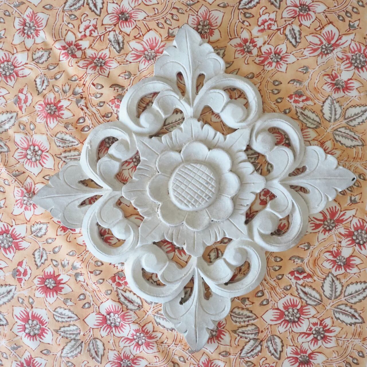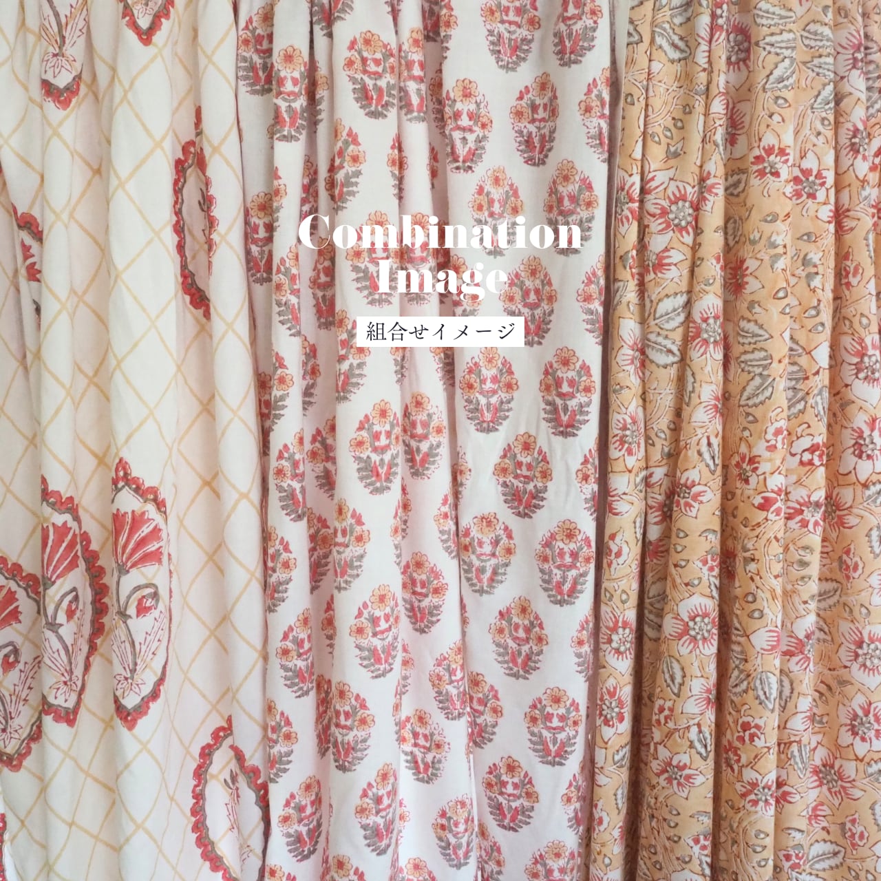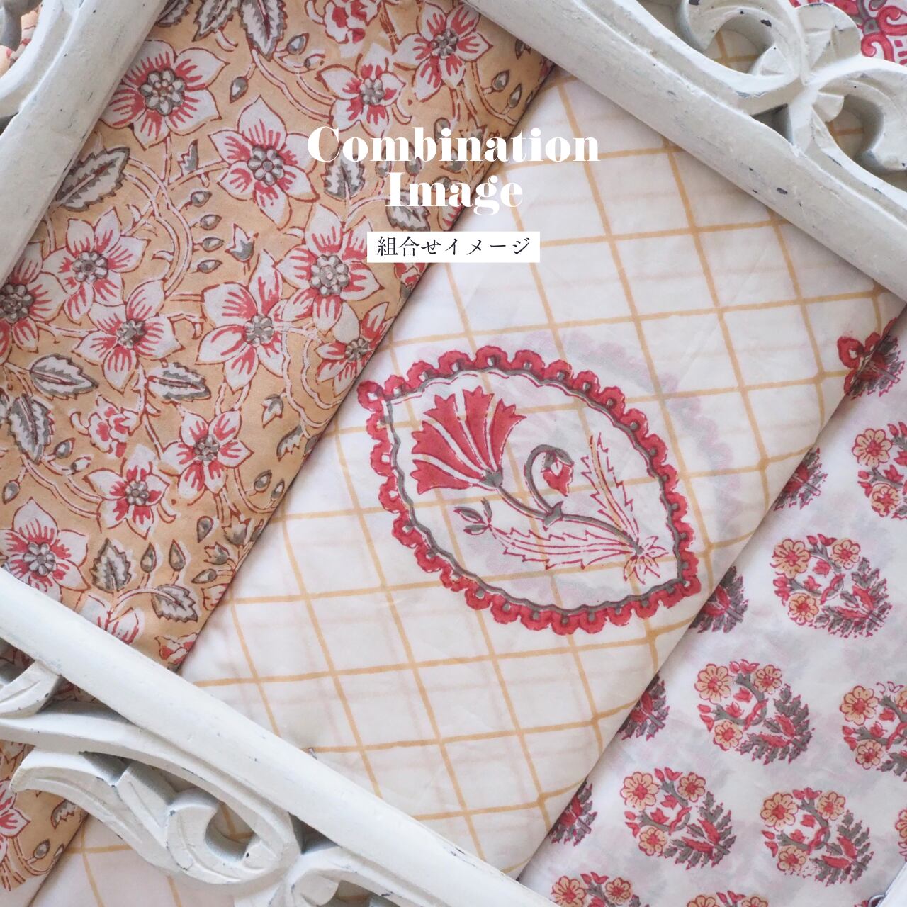 ハンドブロックプリントと呼ばれるインドのジャイプール地方に古くから伝わる伝統的な技法で、木彫りのスタンプで色を何度も重ね、全ての工程がインドの職人さんの手作業によって仕上がるAll Handmadeの生地です。