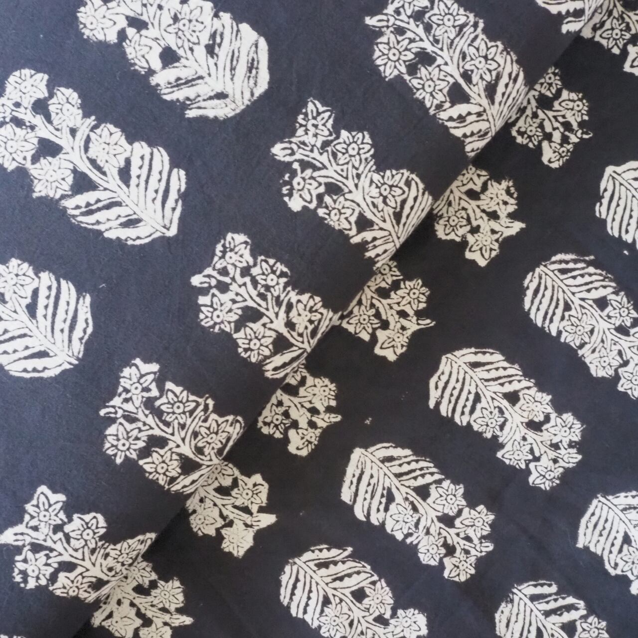 ブロックプリント生地【50cm単位】インド綿 花柄 黒×生成り #36310-BK1