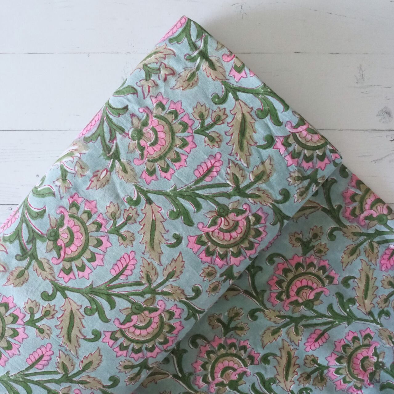 ブロックプリント生地【50cm単位】インド綿 花柄 ブルーグレー×ピンク #36672-BL1