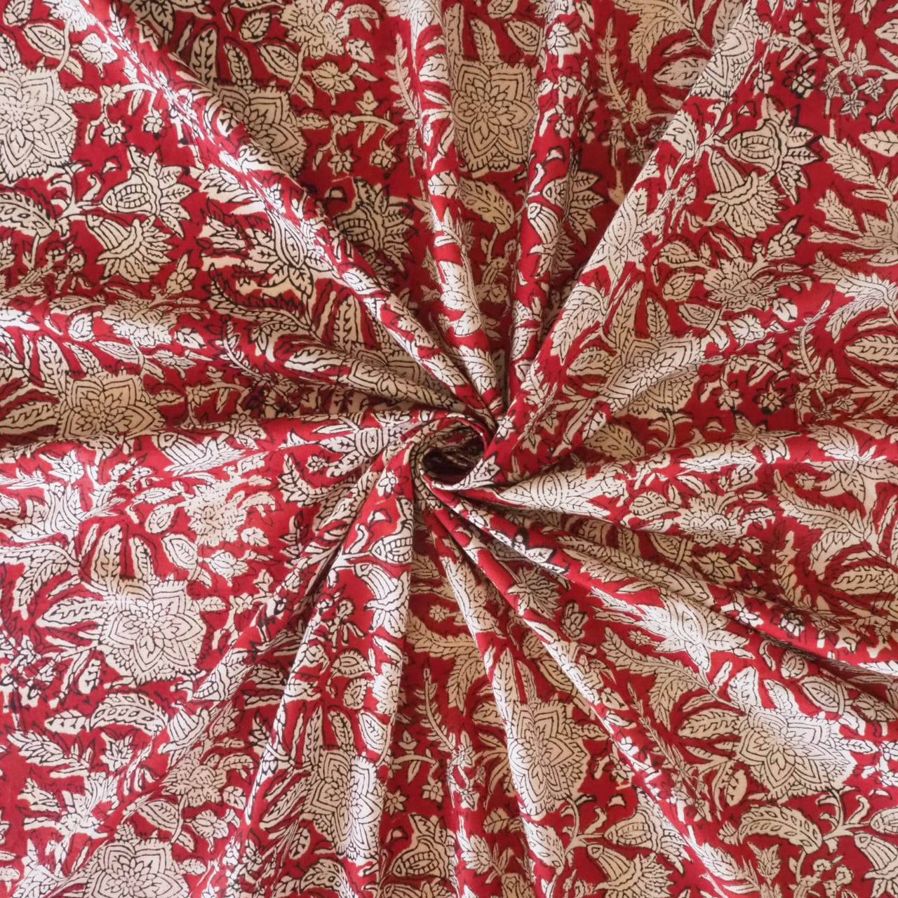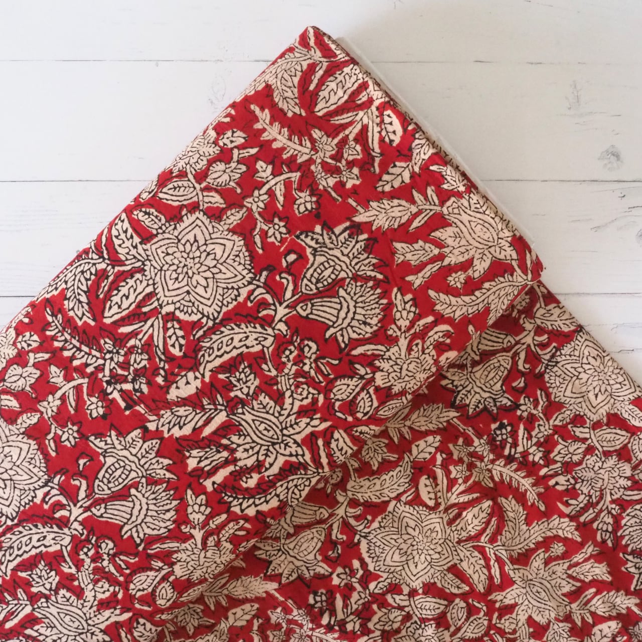 ブロックプリント生地【50cm単位】インド綿 花柄 赤×生成り #37410-RD1