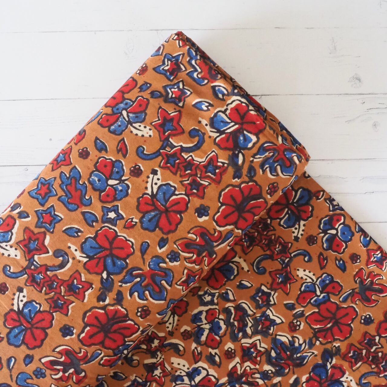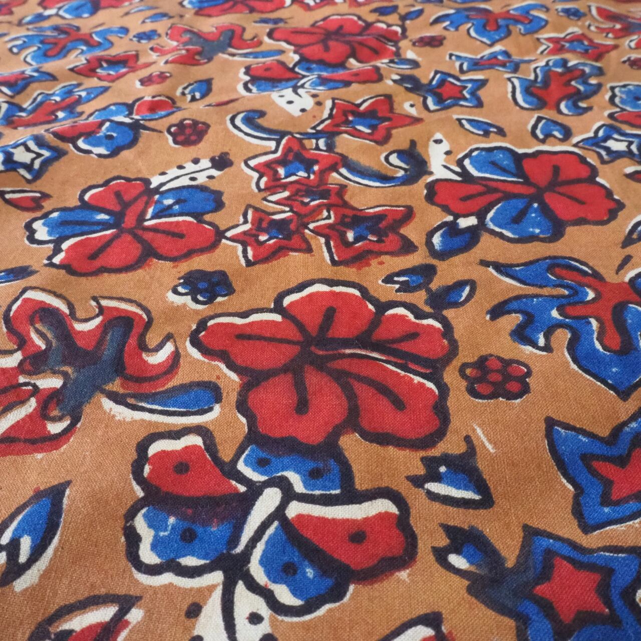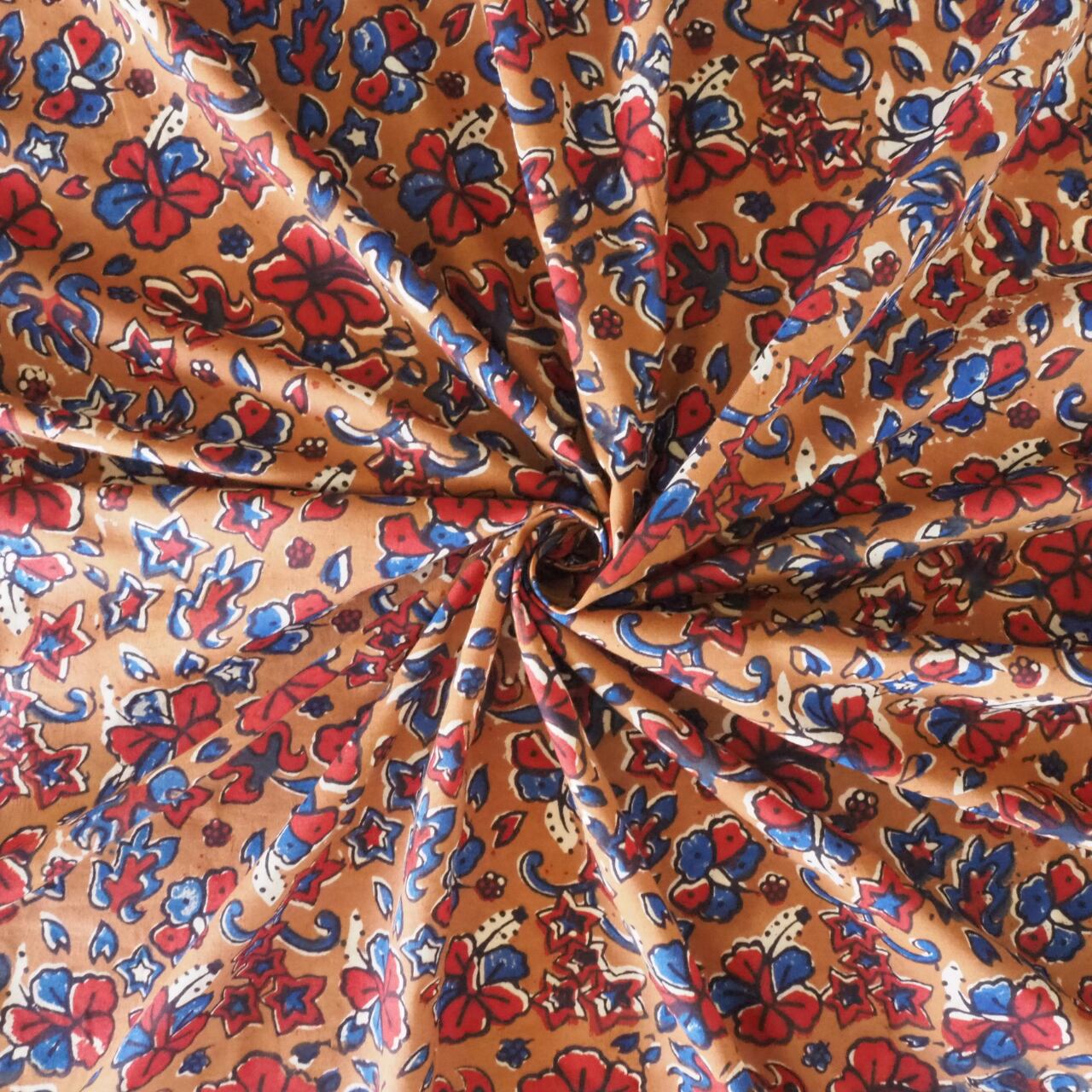 ブロックプリント生地【50cm単位】インド綿 花柄 ブラウン×赤×青 #37710-RD1