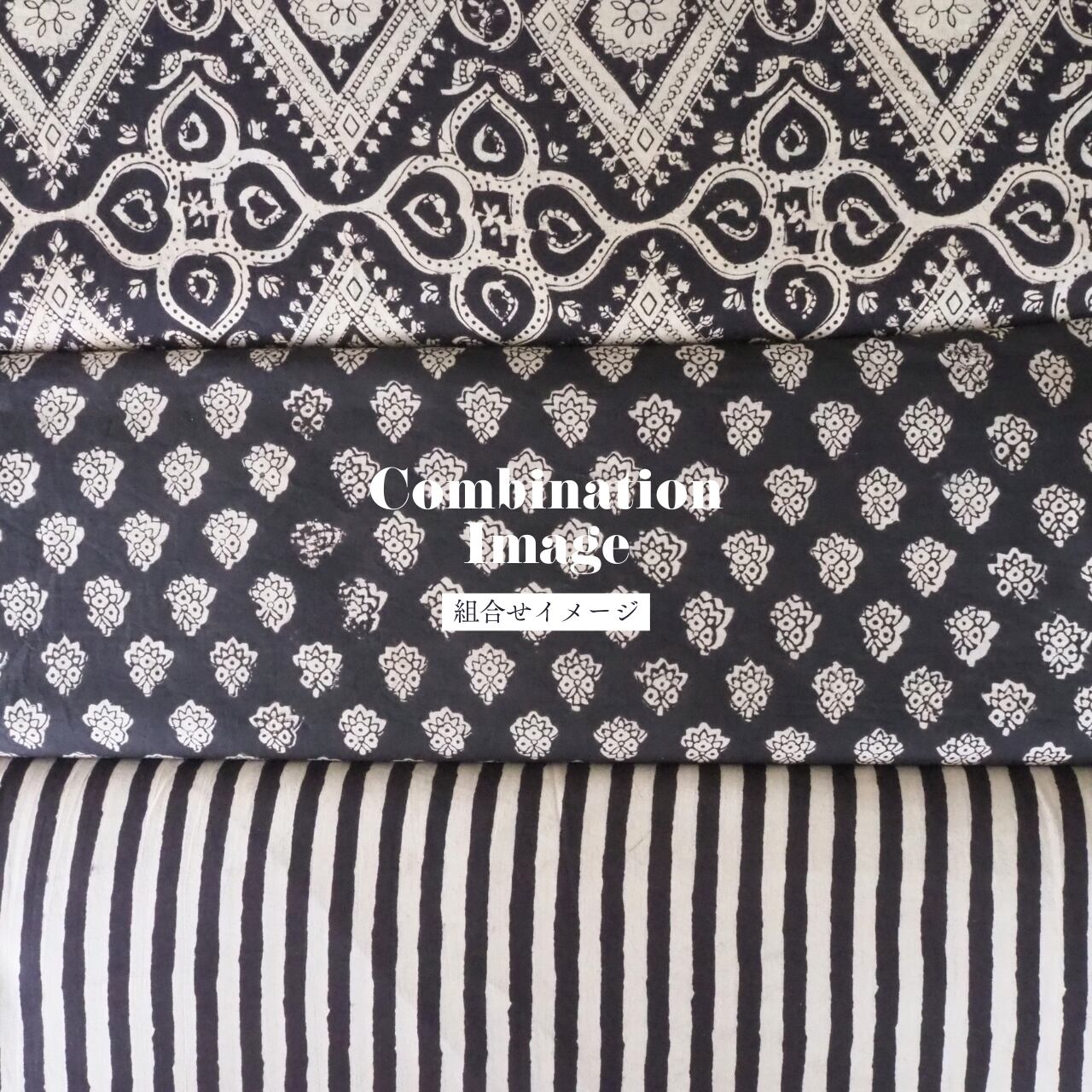 ハンドブロックプリントと呼ばれるインドのジャイプール地方に古くから伝わる伝統的な技法で、木彫りのスタンプで色を何度も重ね、全ての工程がインドの職人さんの手作業によって仕上がるAll Handmadeの生地です。