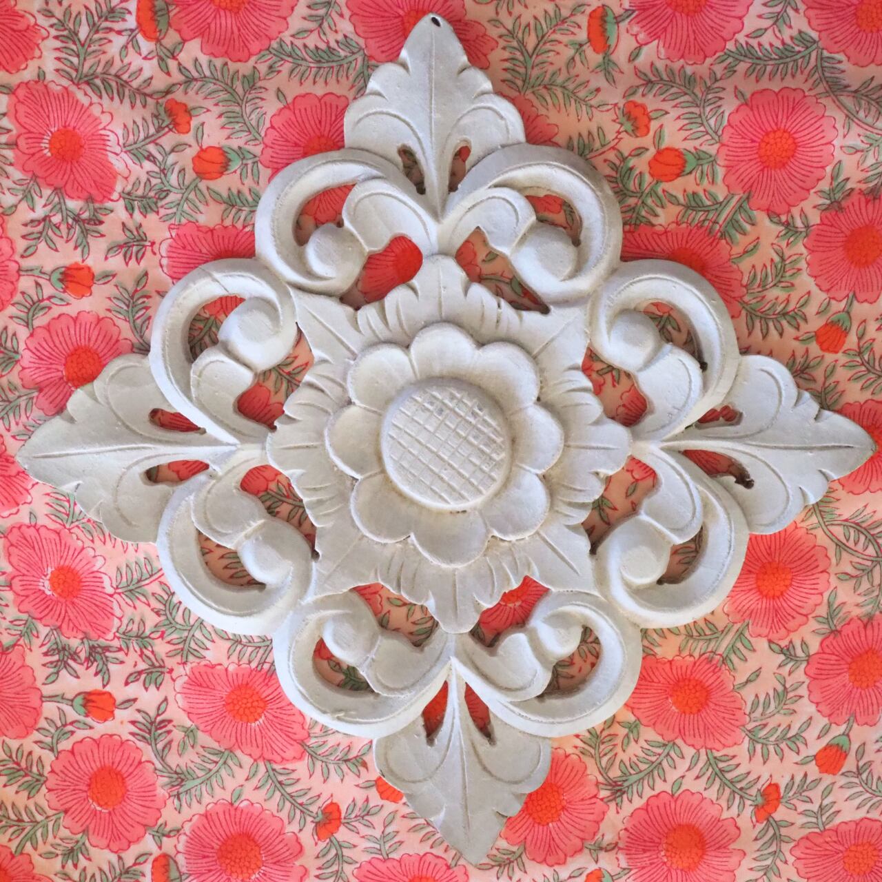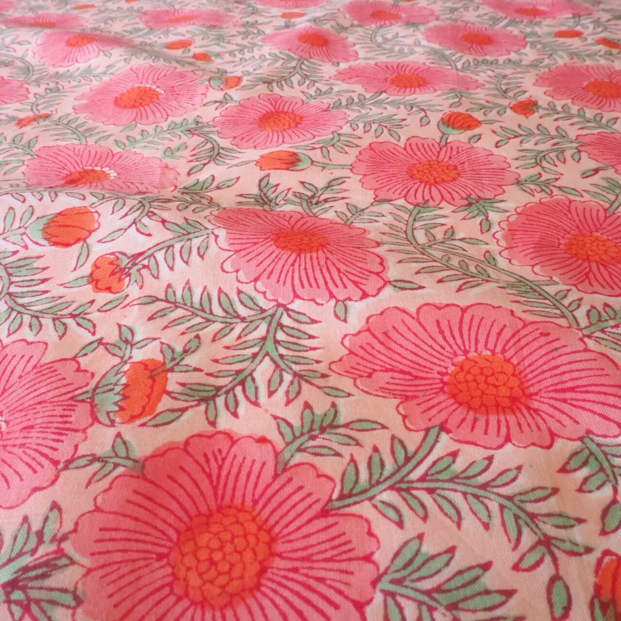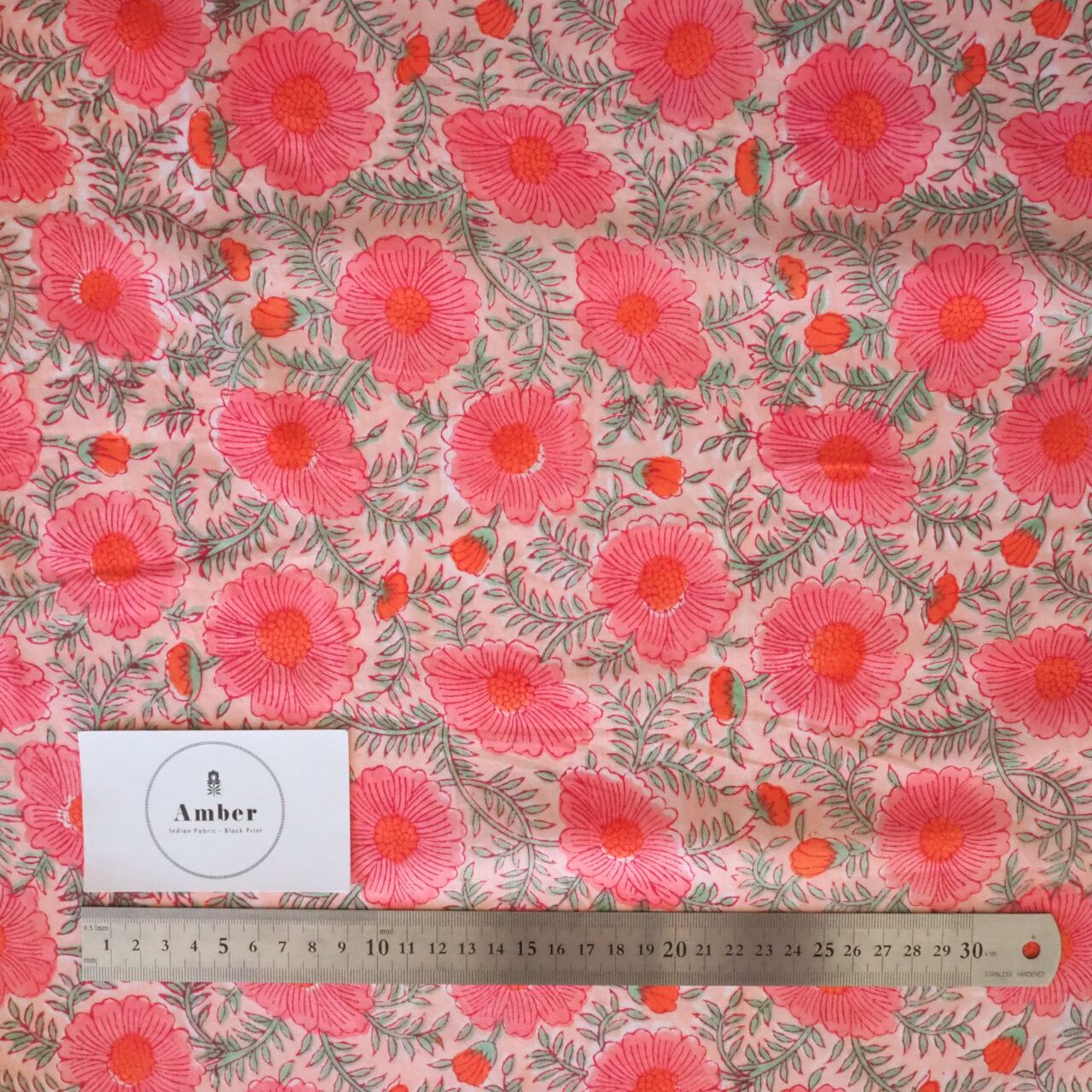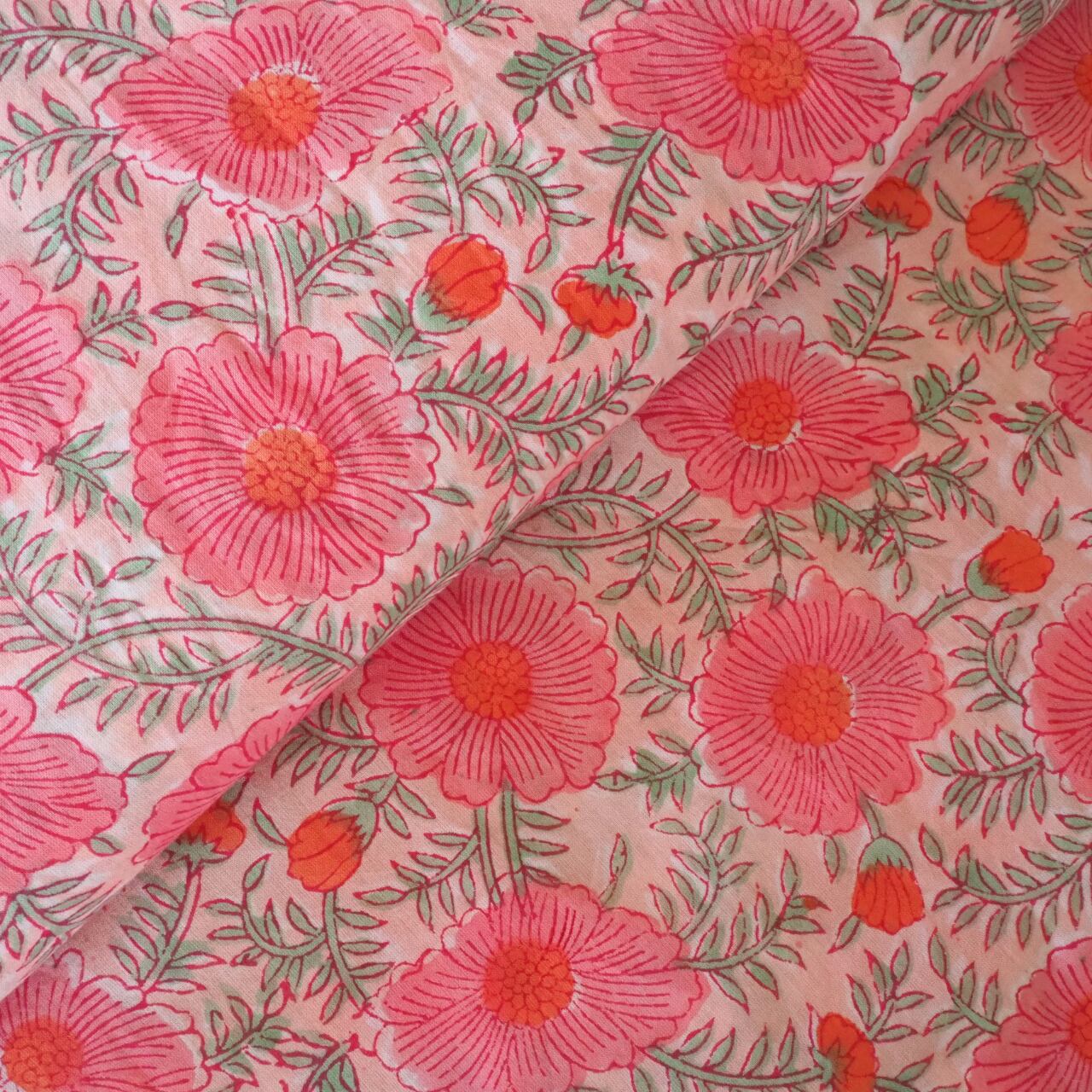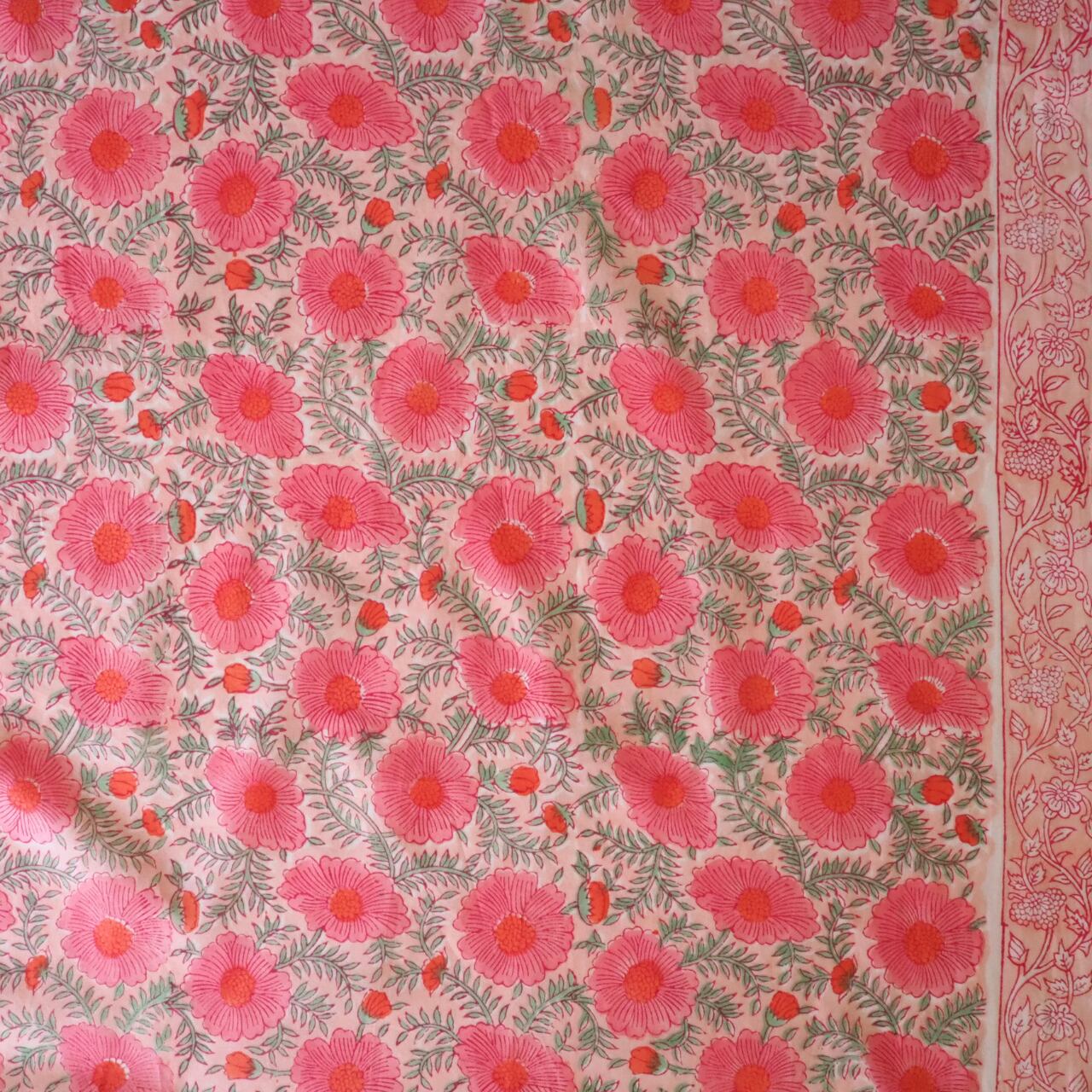ブロックプリント生地【50cm単位】インド綿 片耳ボーダー付き 花柄 コーラルピンク #38776-PK4