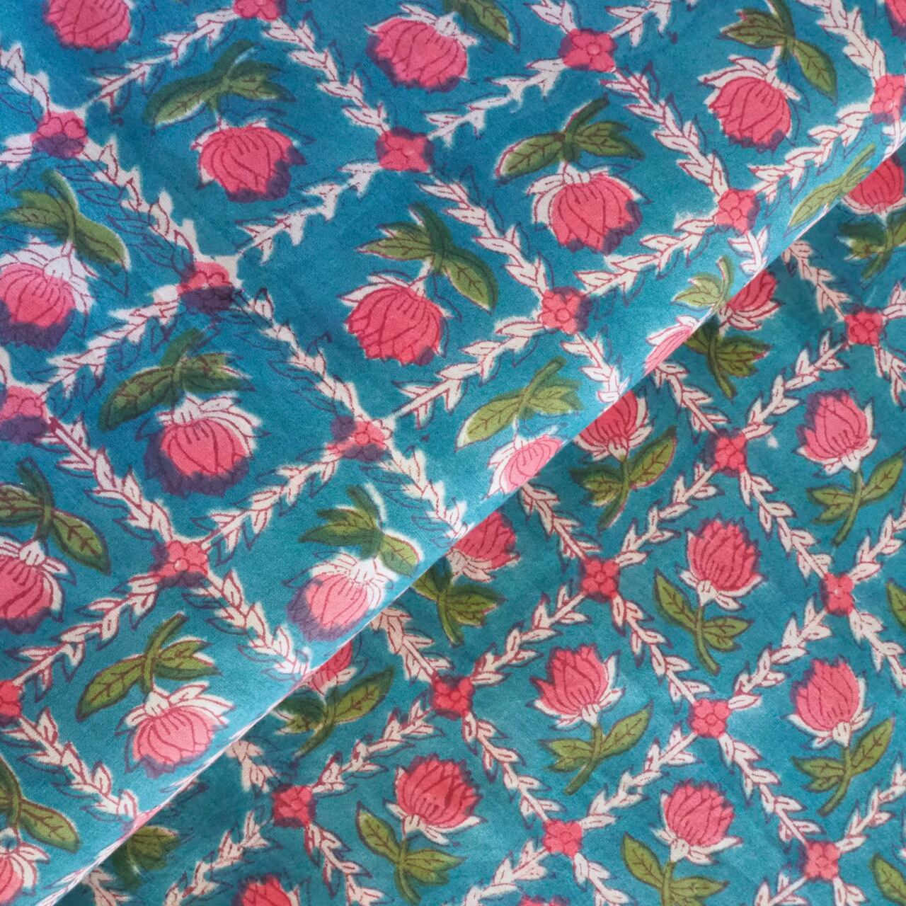 ブロックプリント生地【50cm単位】インド綿 花柄 マリンブルー×ピンク #38810-BL1