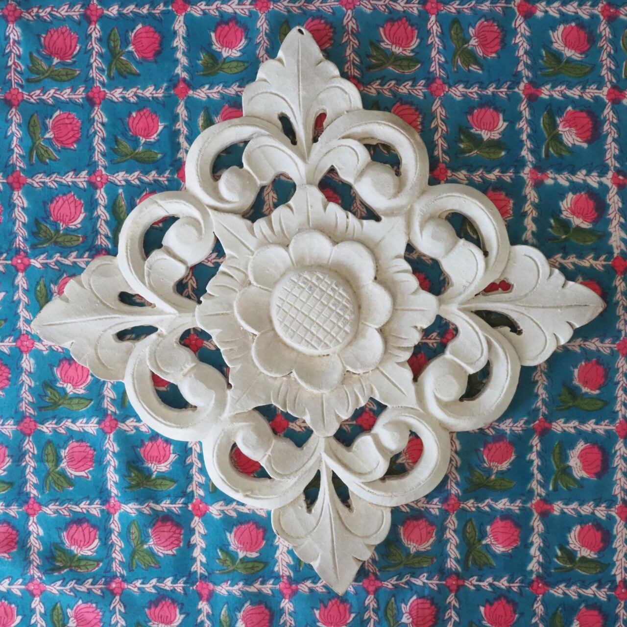 ハンドブロックプリントと呼ばれるインドのジャイプール地方に古くから伝わる伝統的な技法で、木彫りのスタンプで色を何度も重ね、全ての工程がインドの職人さんの手作業によって仕上がるAll Handmadeの生地です。