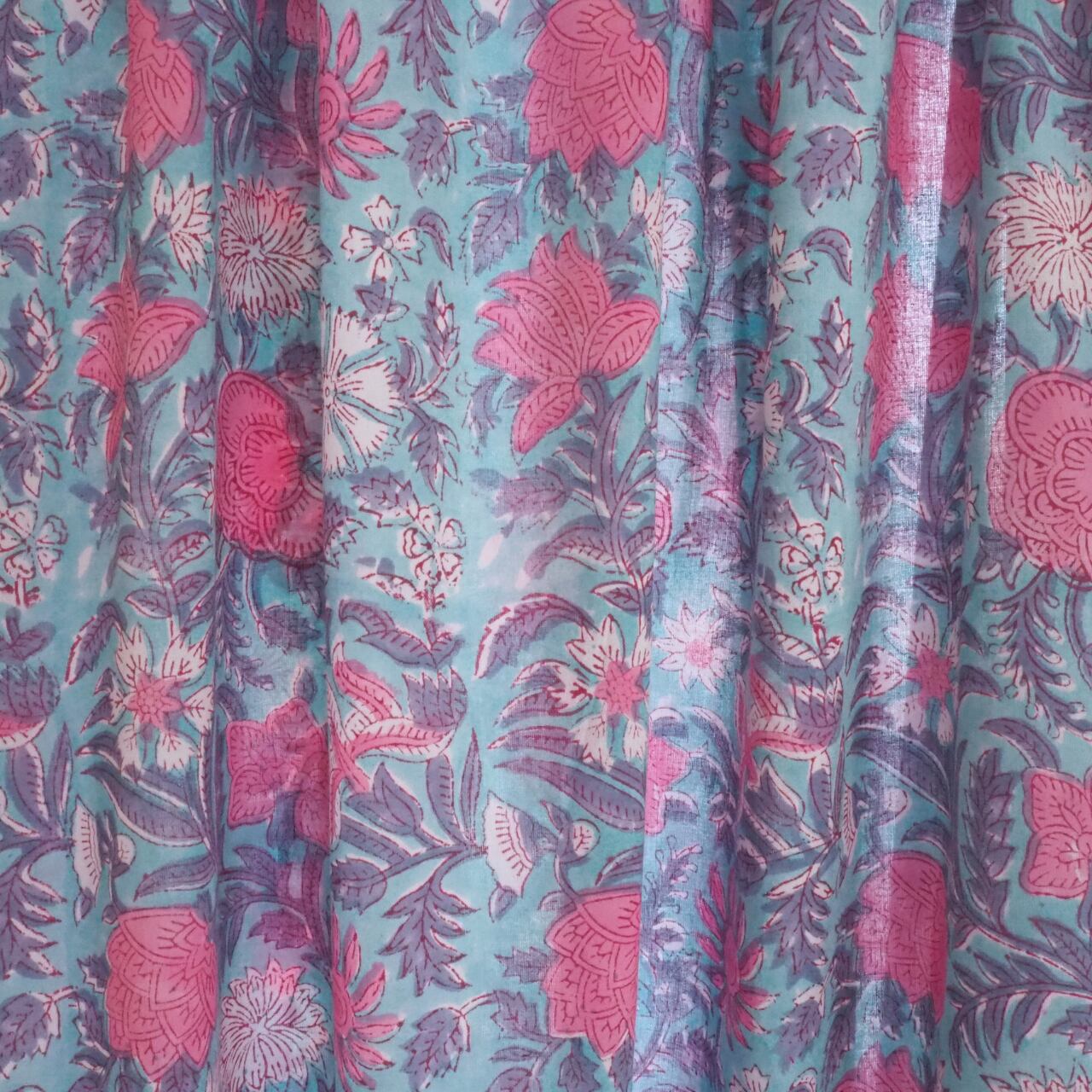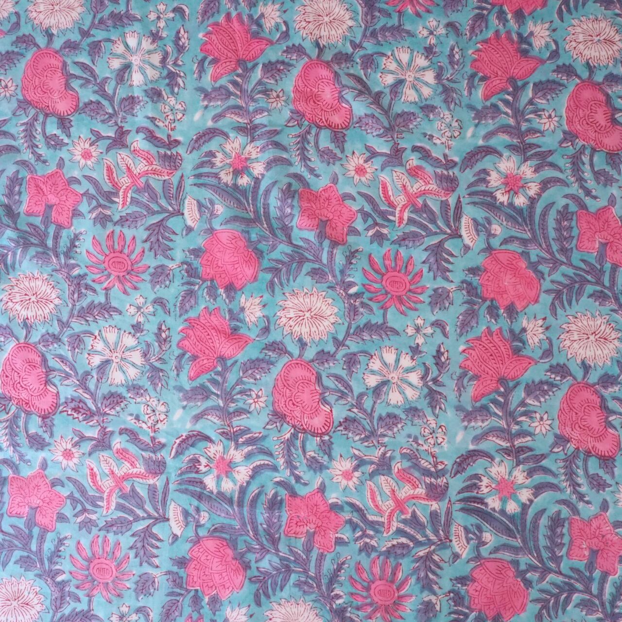 ブロックプリント生地【50cm単位】インド綿 花柄 水色×ピンク #38977-BL1