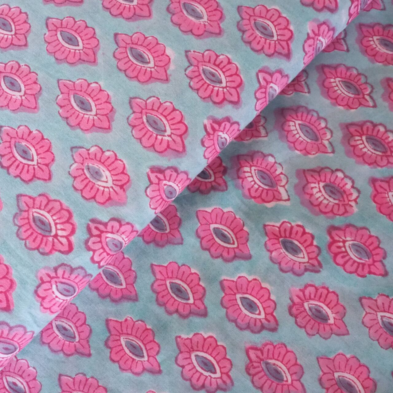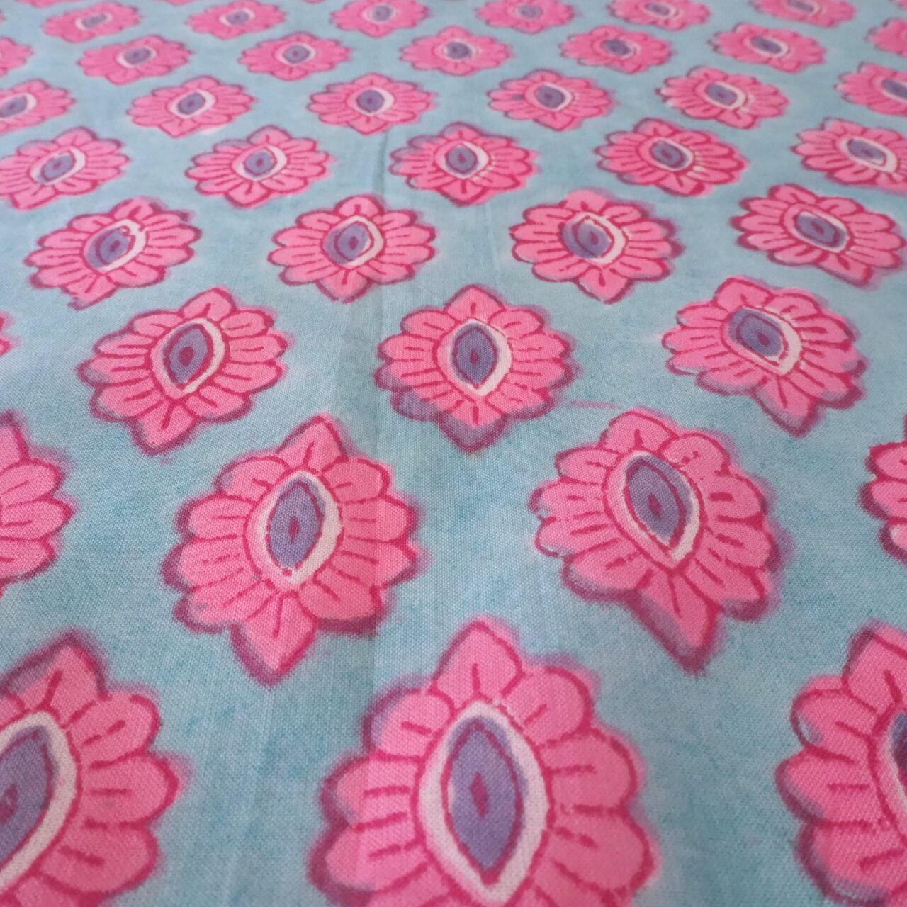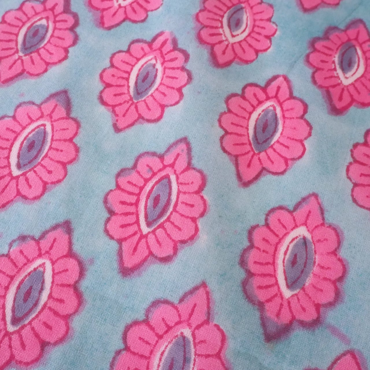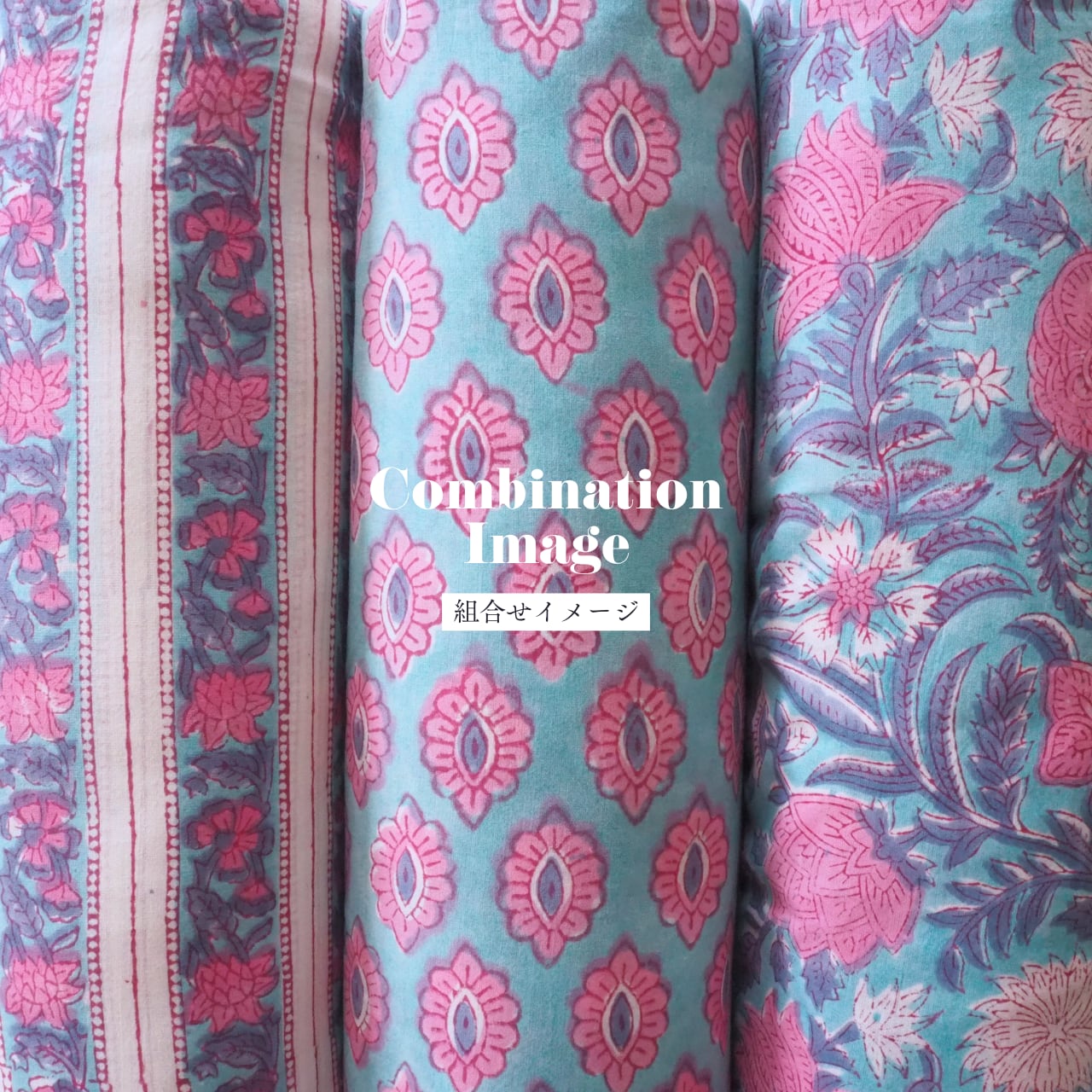 ブロックプリント生地【50cm単位】インド綿 小花柄 水色×ピンク #39077-BL2