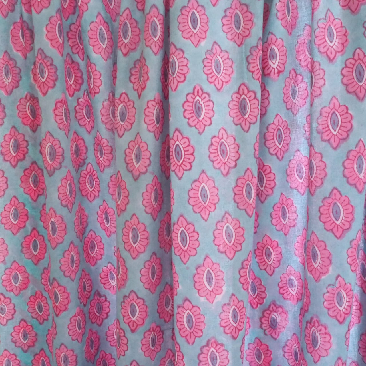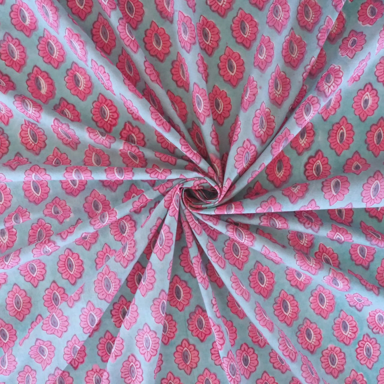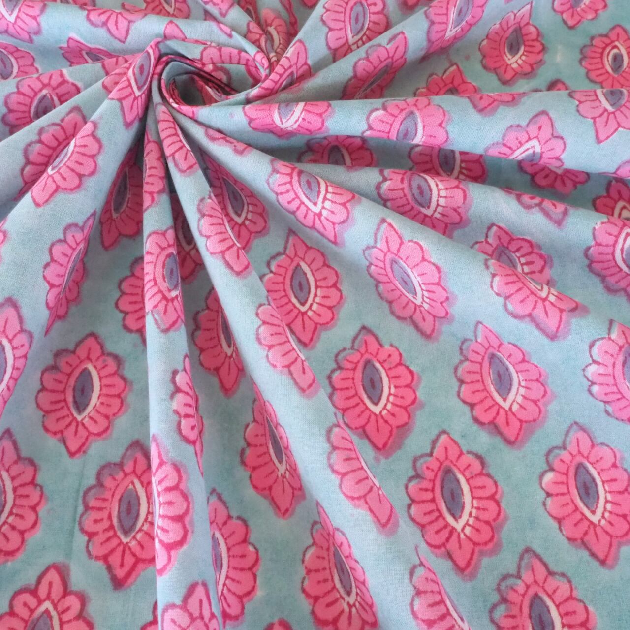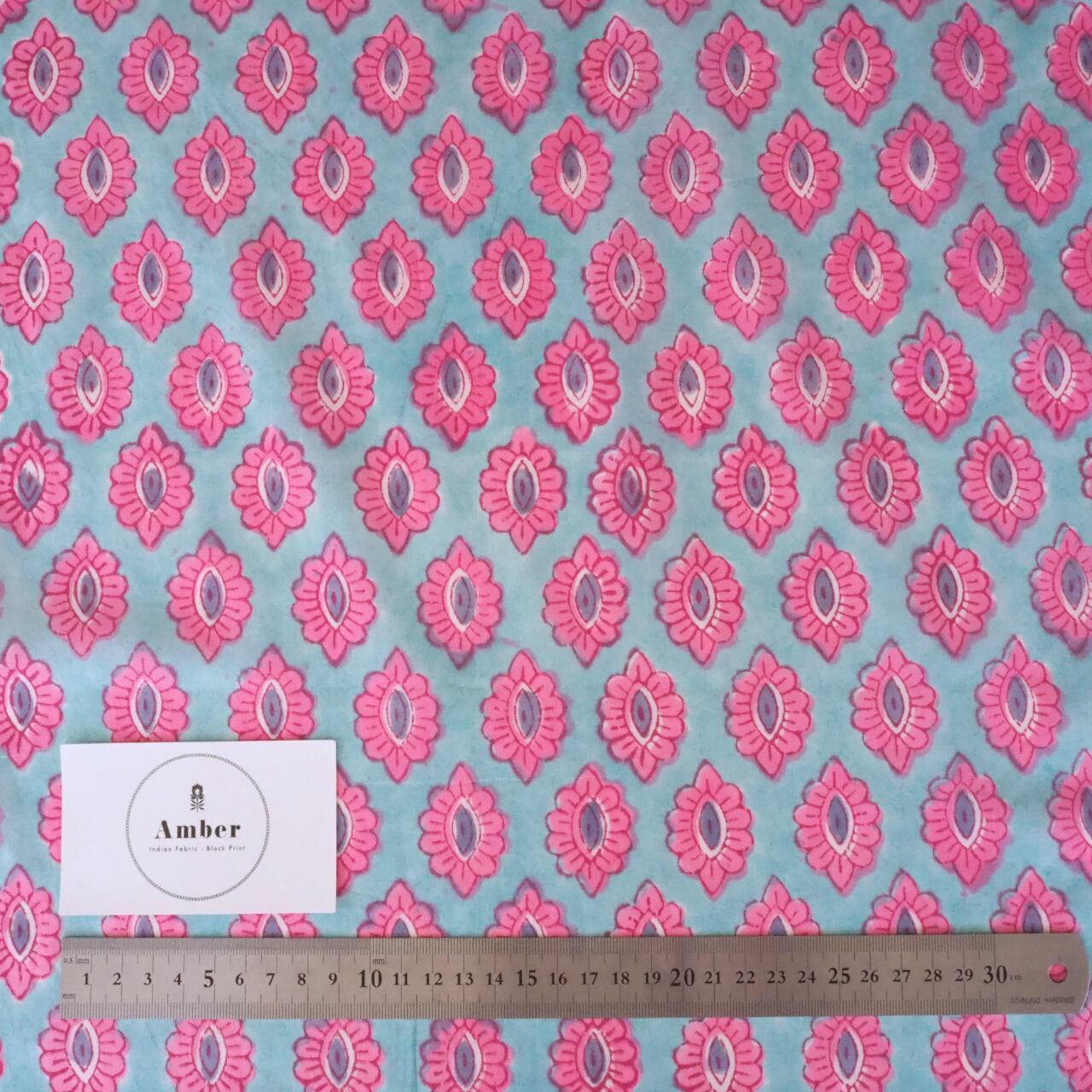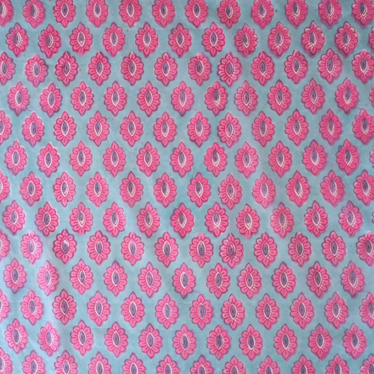 ブロックプリント生地【50cm単位】インド綿 小花柄 水色×ピンク #39077-BL2