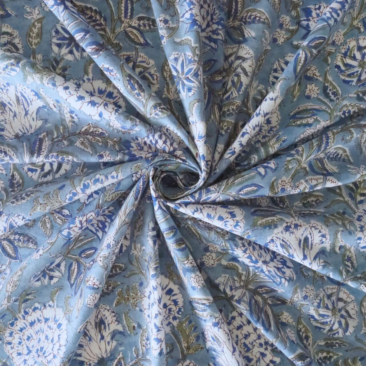 ブロックプリント生地【50cm単位】インド綿 花柄 ブルー×白 #39579-BL1