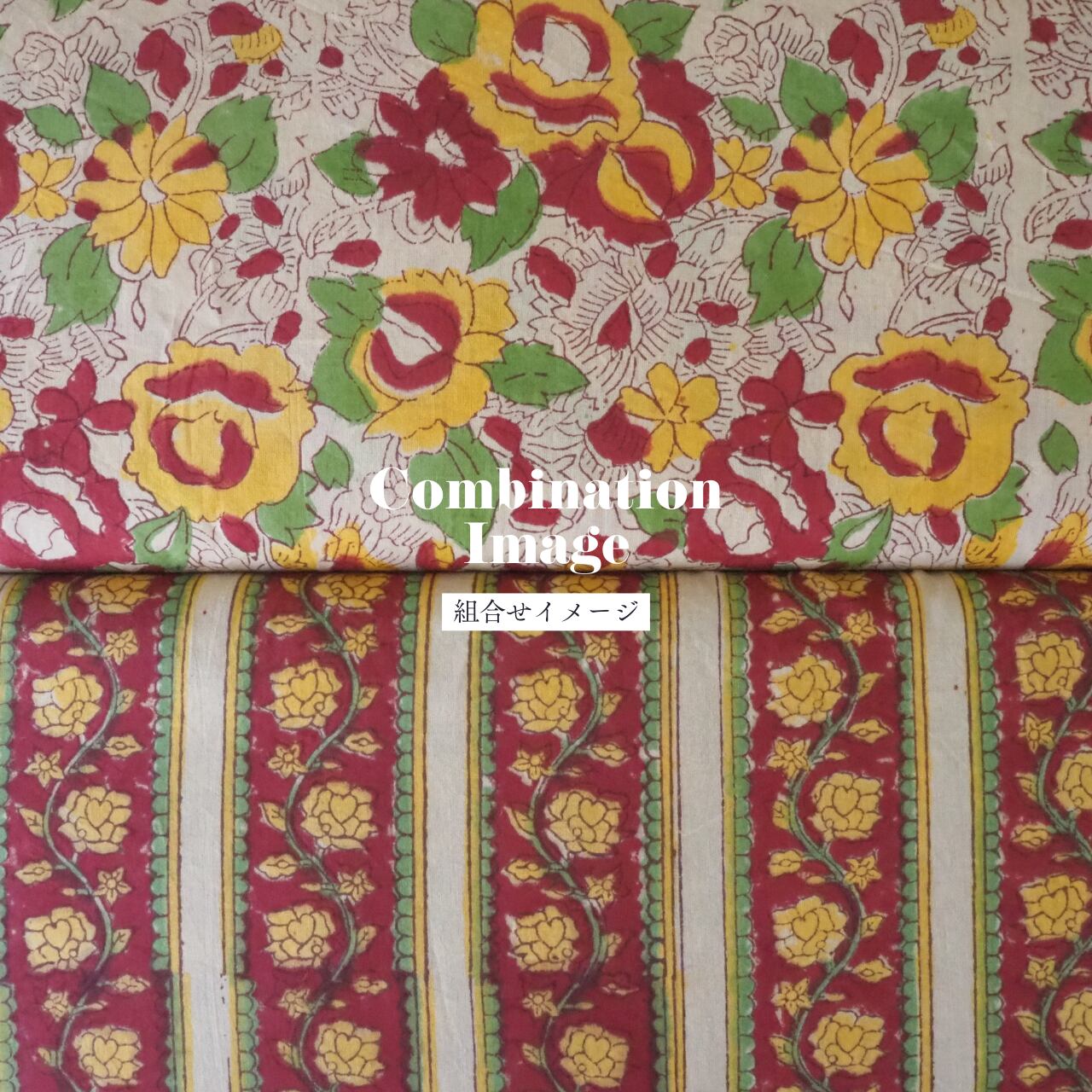 ハンドブロックプリントと呼ばれるインドのジャイプール地方に古くから伝わる伝統的な技法で、木彫りのスタンプで色を何度も重ね、全ての工程がインドの職人さんの手作業によって仕上がるAll Handmadeの生地です。