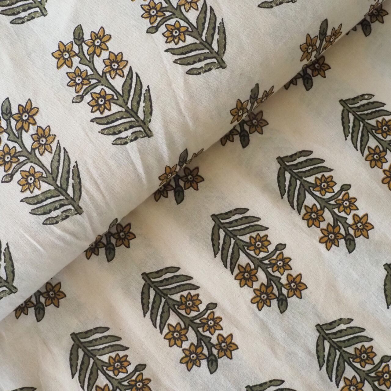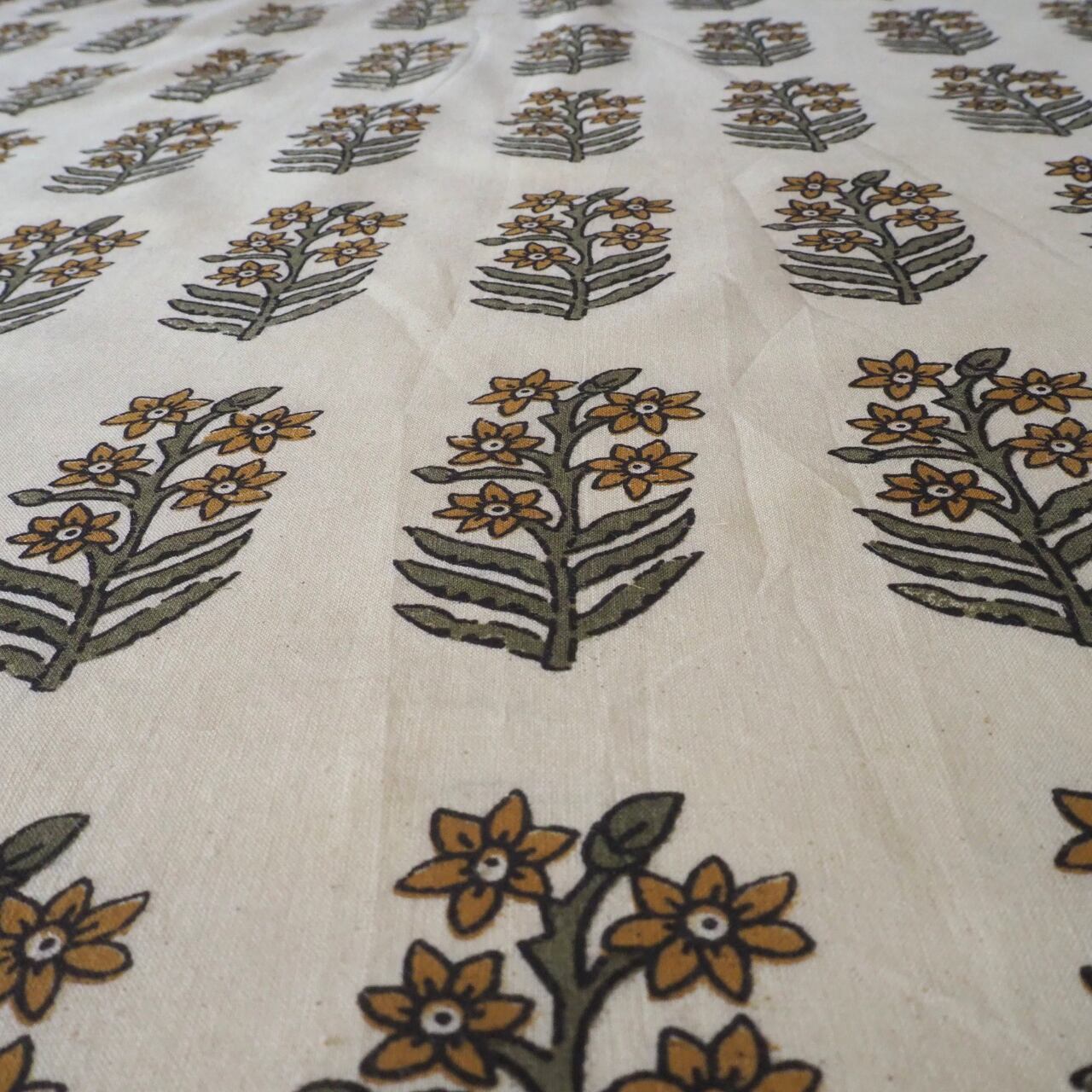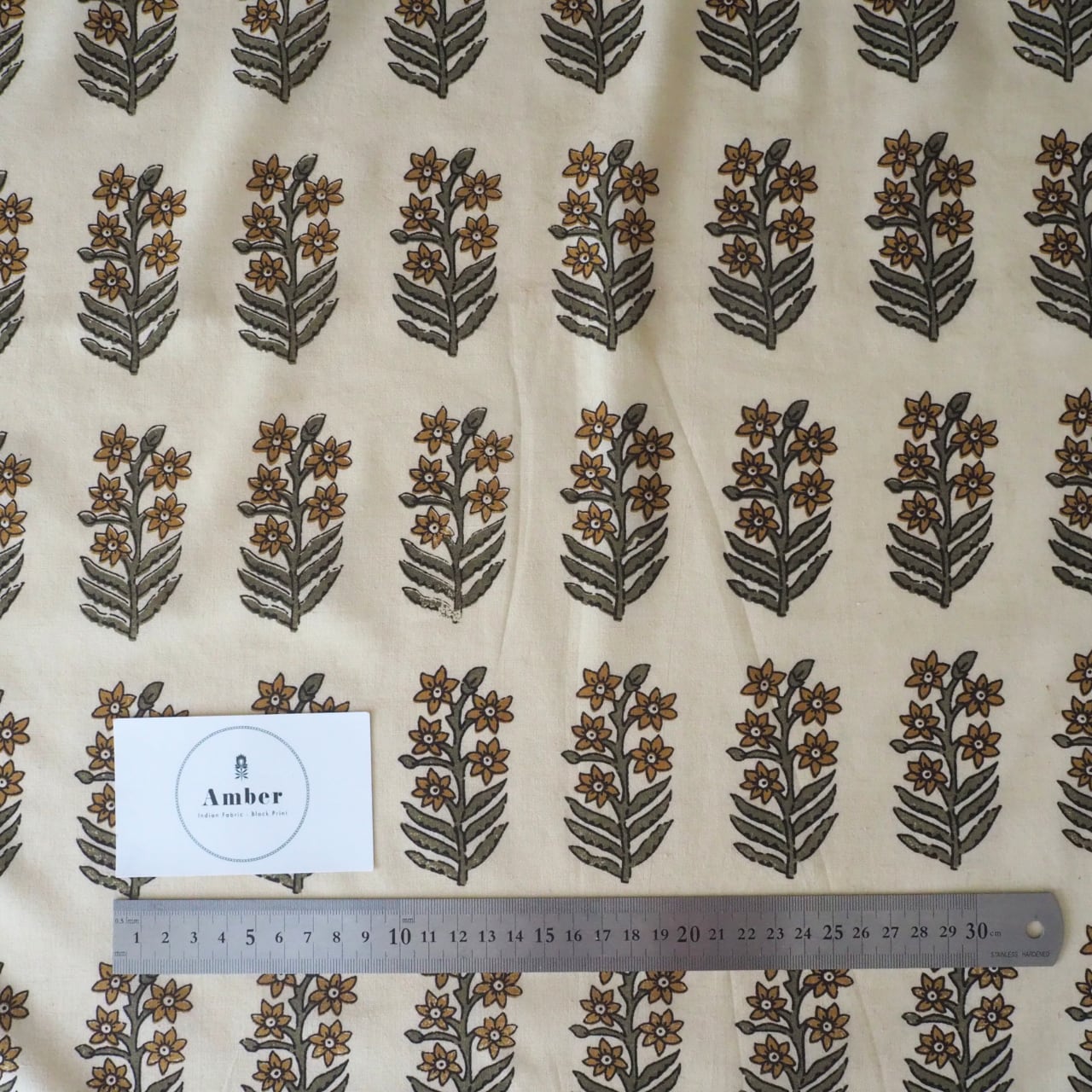 ブロックプリント生地【50cm単位】インド綿 花柄 生成り×カーキ #40710-KH1
