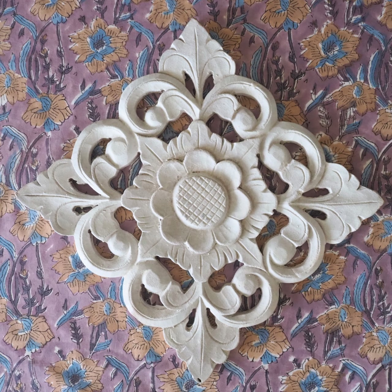 ハンドブロックプリントと呼ばれるインドのジャイプール地方に古くから伝わる伝統的な技法で、木彫りのスタンプで色を何度も重ね、全ての工程がインドの職人さんの手作業によって仕上がるAll Handmadeの生地です。