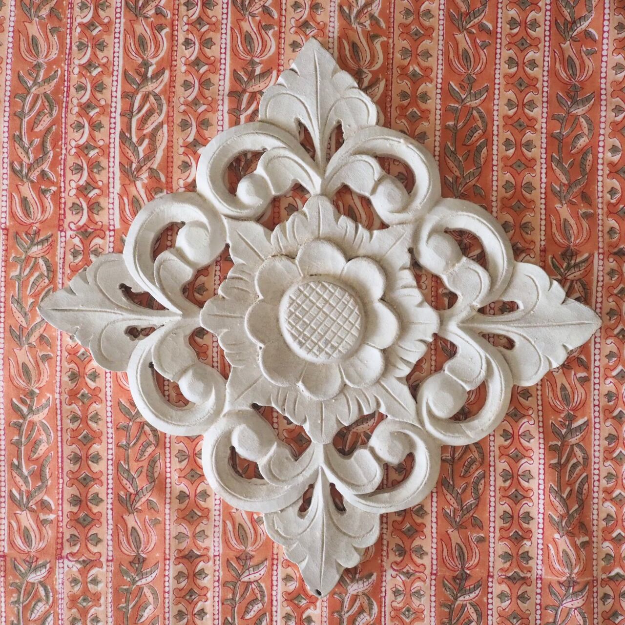 ハンドブロックプリントと呼ばれるインドのジャイプール地方に古くから伝わる伝統的な技法で、木彫りのスタンプで色を何度も重ね、全ての工程がインドの職人さんの手作業によって仕上がるAll Handmadeの生地です。