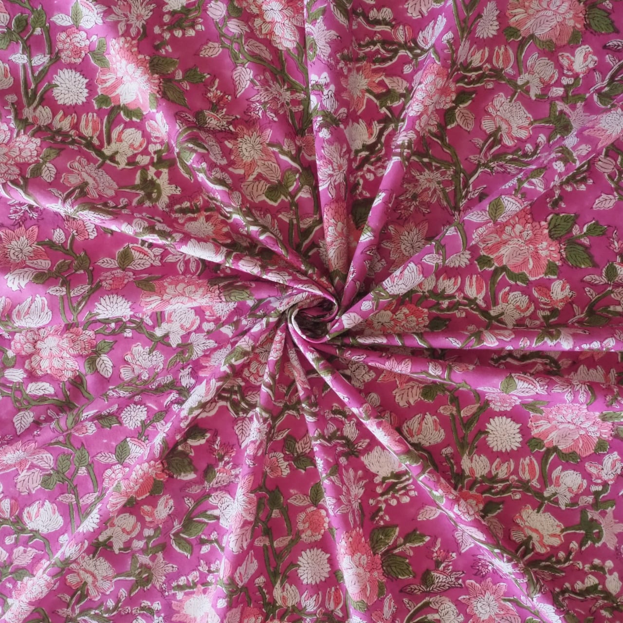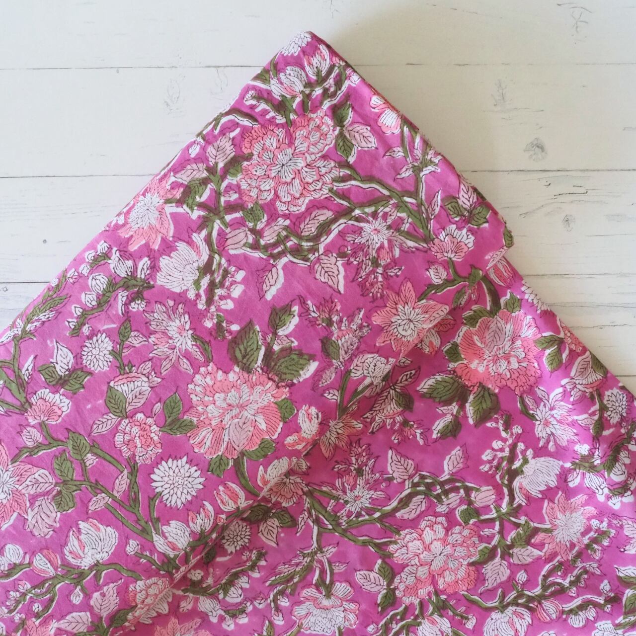ブロックプリント生地【50cm単位】インド綿 花柄 ピンク×カーキ #42084-PK1