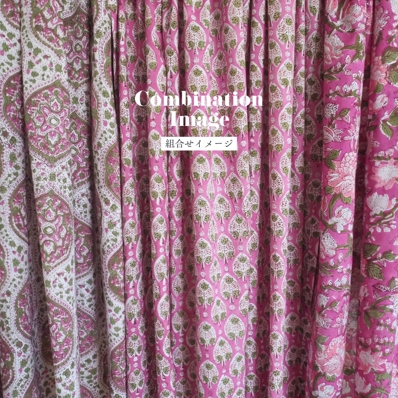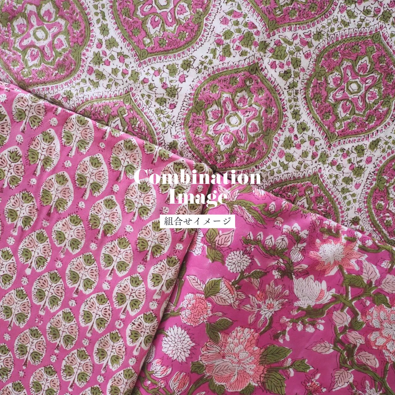 ハンドブロックプリントと呼ばれるインドのジャイプール地方に古くから伝わる伝統的な技法で、木彫りのスタンプで色を何度も重ね、全ての工程がインドの職人さんの手作業によって仕上がるAll Handmadeの生地です。