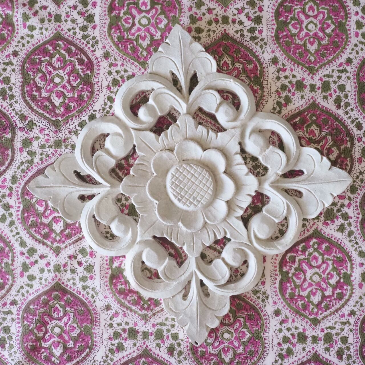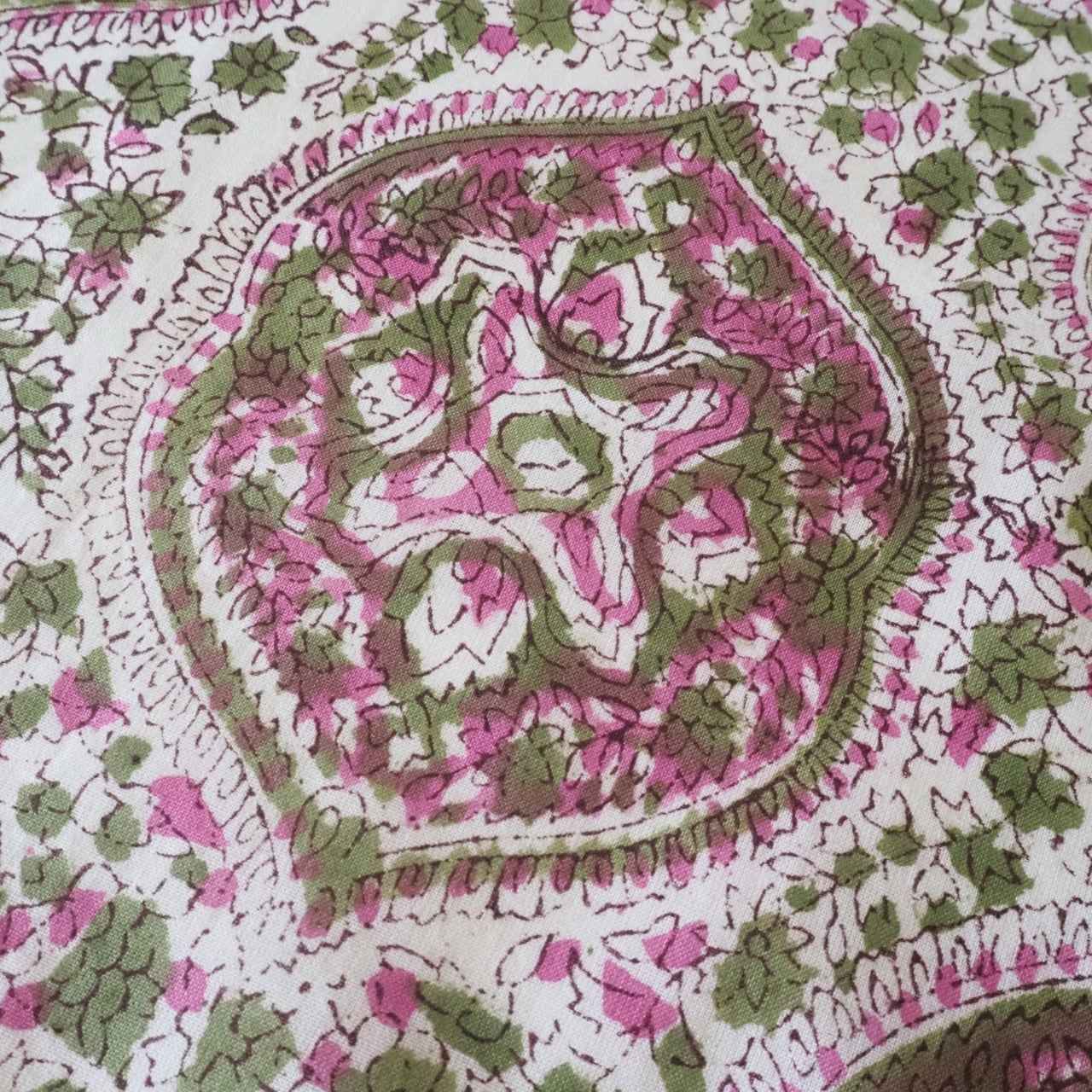 ハンドブロックプリントと呼ばれるインドのジャイプール地方に古くから伝わる伝統的な技法で、木彫りのスタンプで色を何度も重ね、全ての工程がインドの職人さんの手作業によって仕上がるAll Handmadeの生地です。