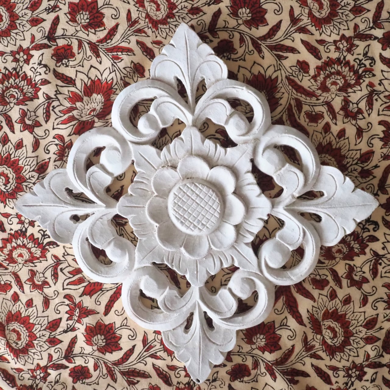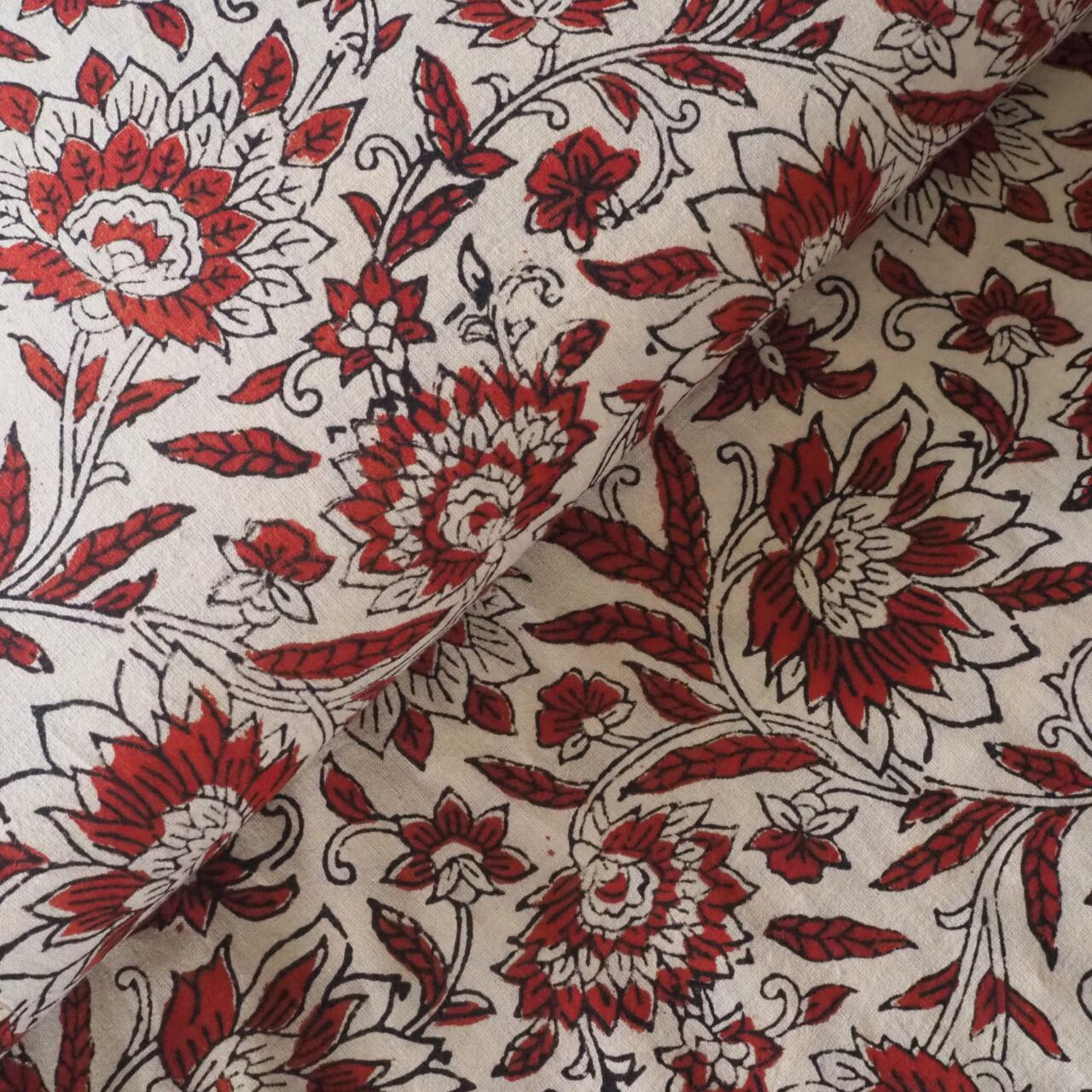 ブロックプリント生地【50cm単位】インド綿 花柄 生成り×赤 #43510-WT1