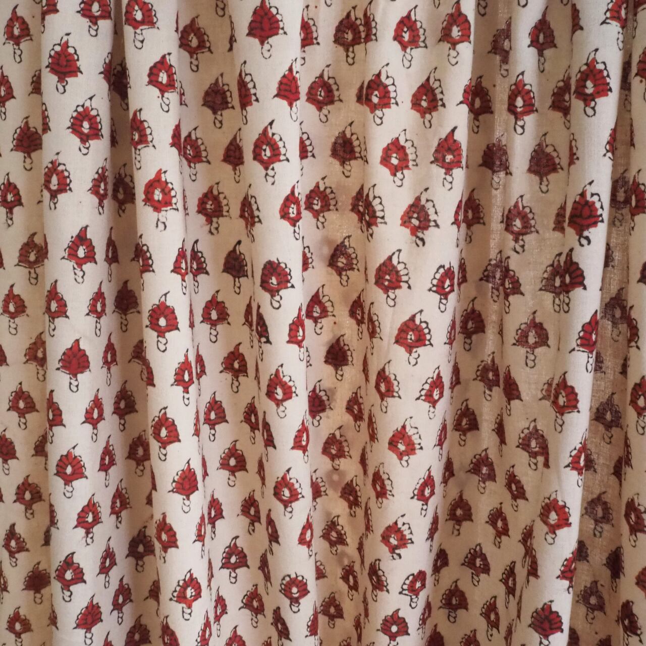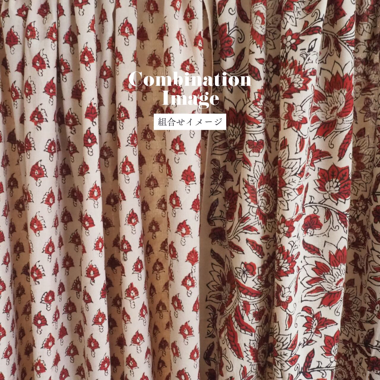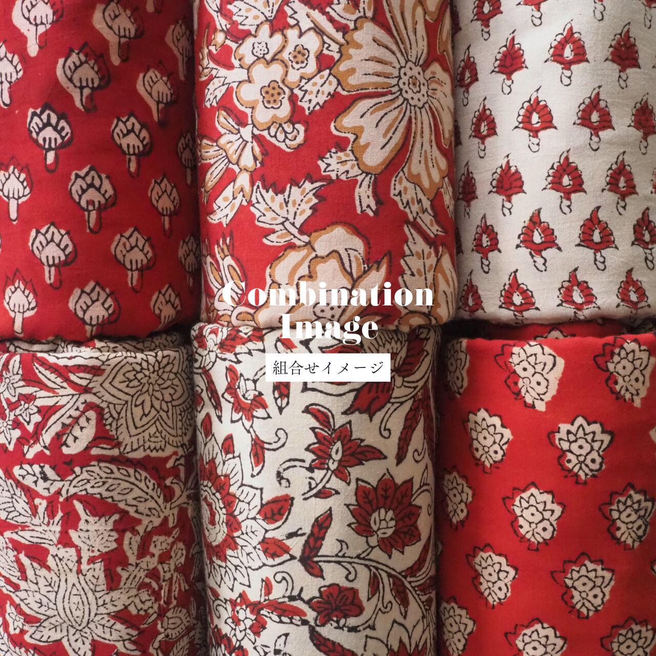 ハンドブロックプリントと呼ばれるインドのジャイプール地方に古くから伝わる伝統的な技法で、木彫りのスタンプで色を何度も重ね、全ての工程がインドの職人さんの手作業によって仕上がるAll Handmadeの生地です。